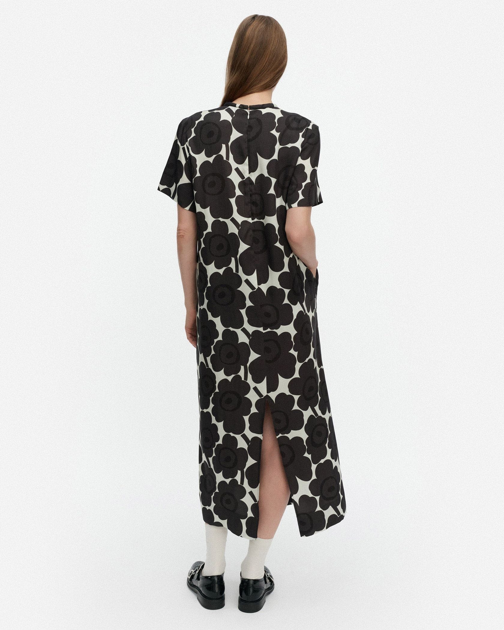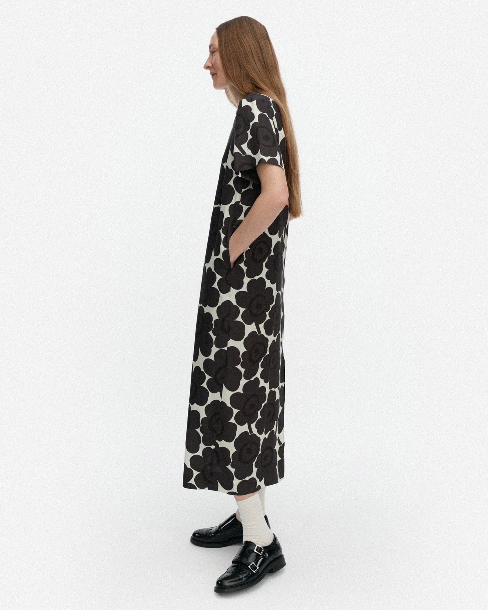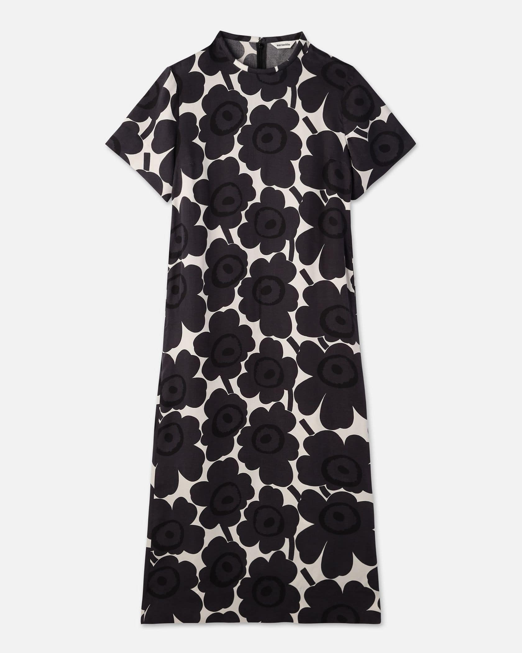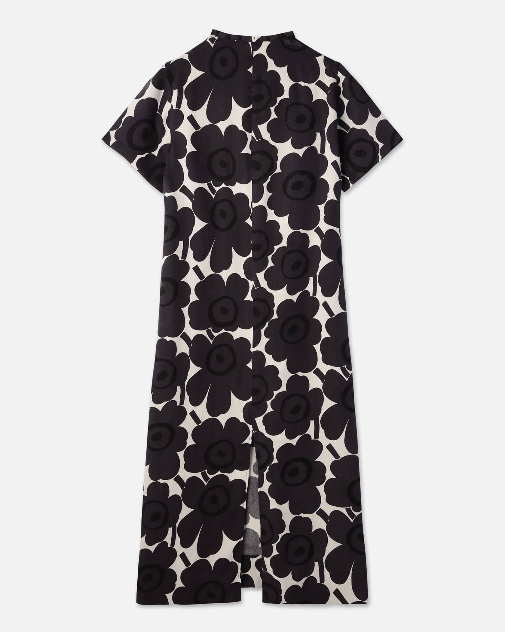Unikko柄モチーフが全体にプリントされたロング丈ワンピース。スリムフィットでストレートなすっきりとした印象のシルエットが特徴。パッド入りでハリのある肩のラインと大きな裾のバックスリットがスタイリッシュなデザインディティール。一枚でスタイリッシュなお出かけスタイリングが完成するアイテムです。