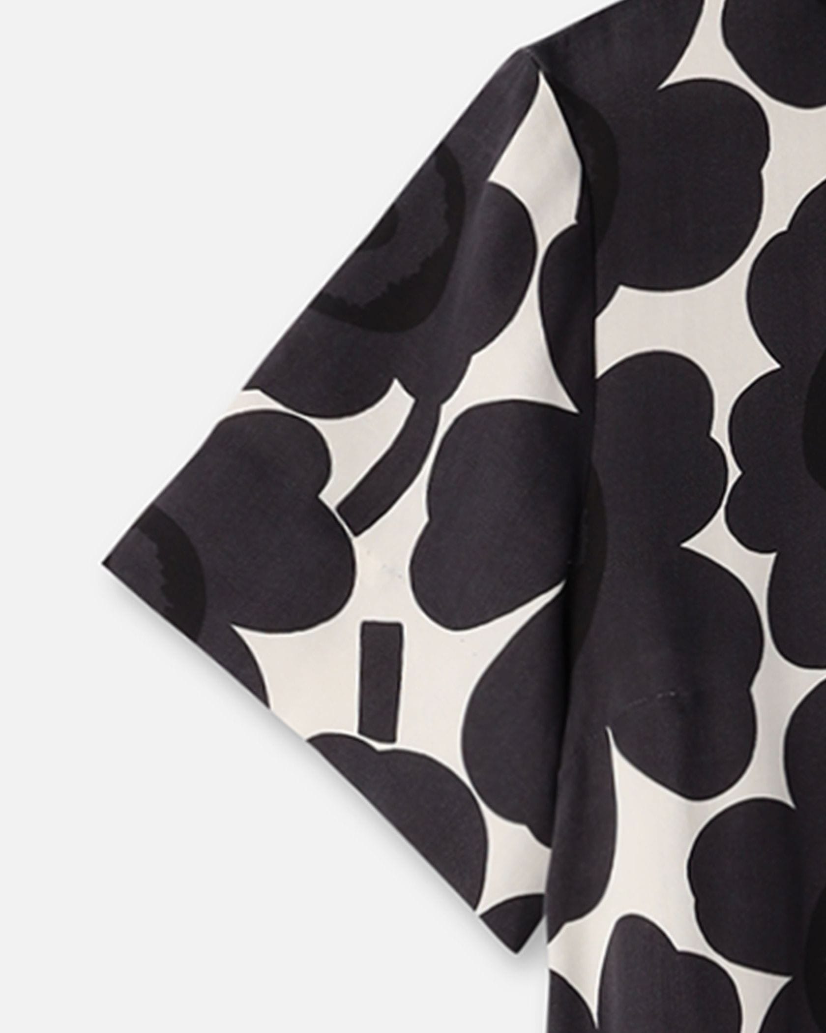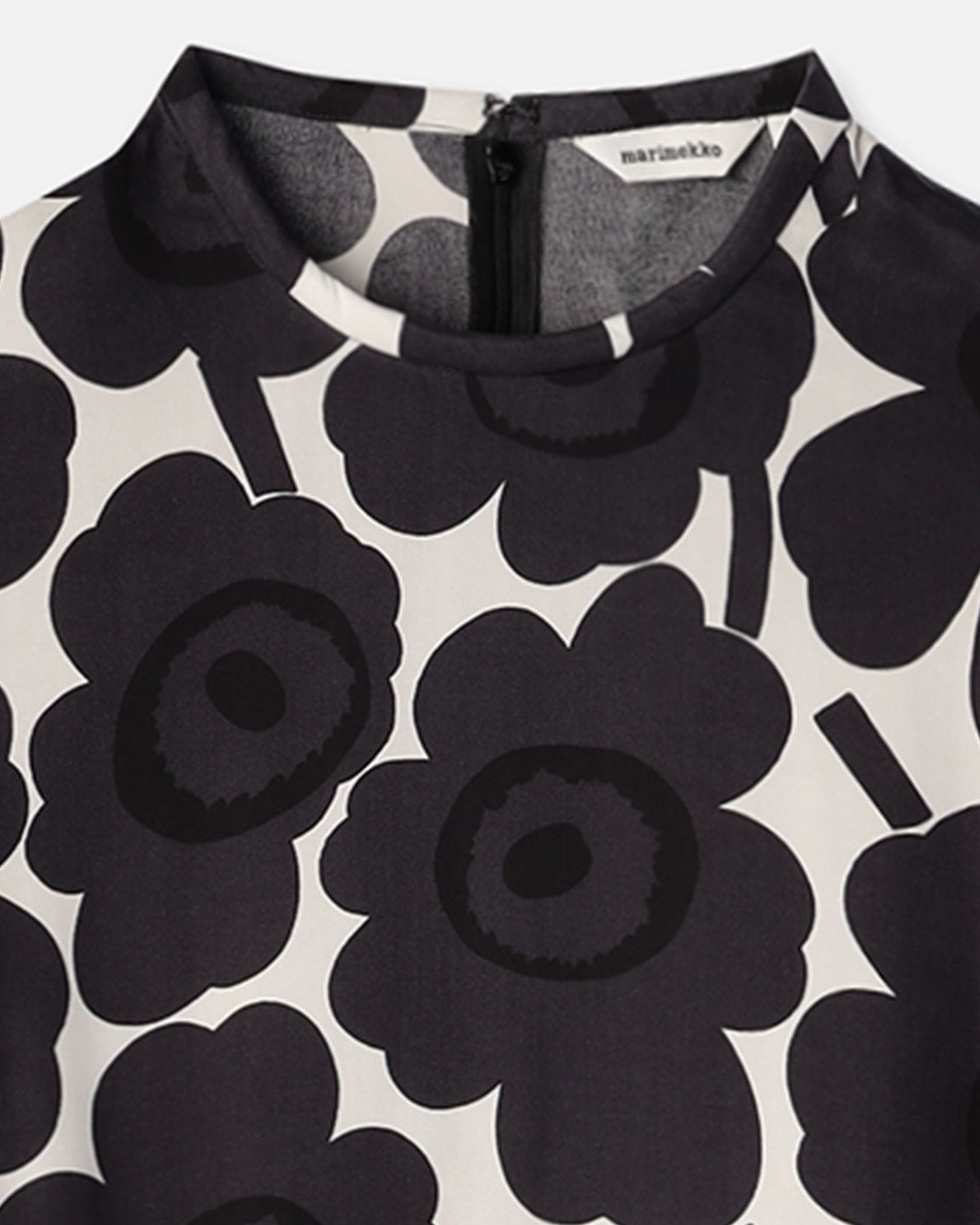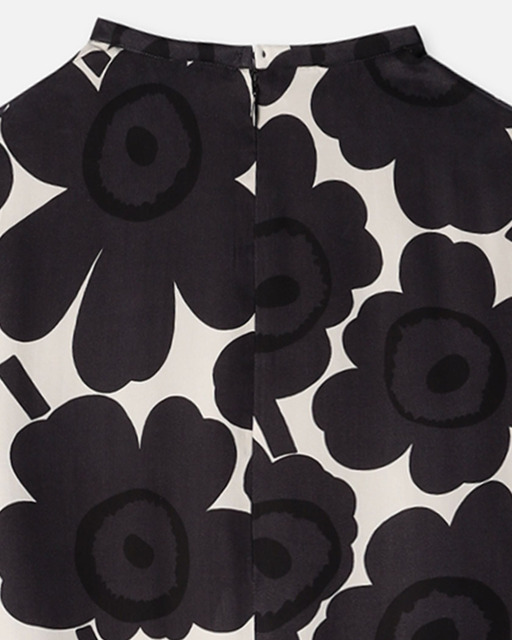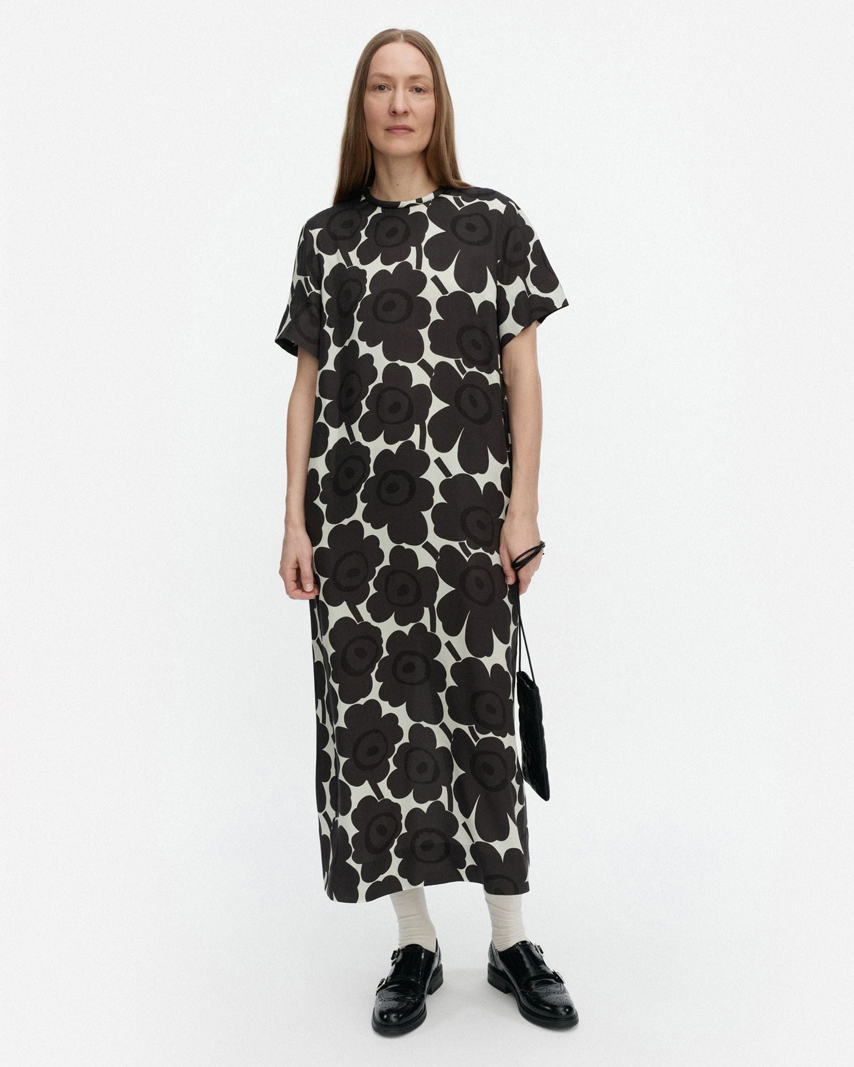 Unikko柄モチーフが全体にプリントされたロング丈ワンピース。スリムフィットでストレートなすっきりとした印象のシルエットが特徴。パッド入りでハリのある肩のラインと大きな裾のバックスリットがスタイリッシュなデザインディティール。一枚でスタイリッシュなお出かけスタイリングが完成するアイテムです。