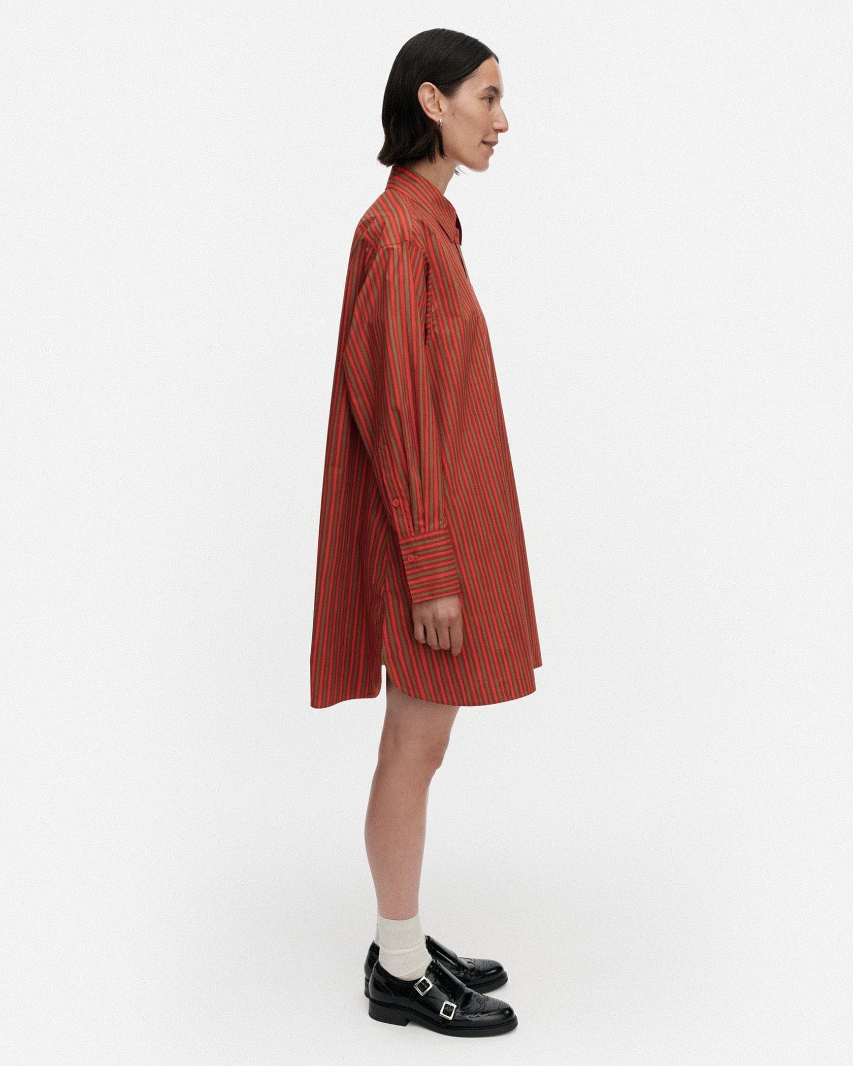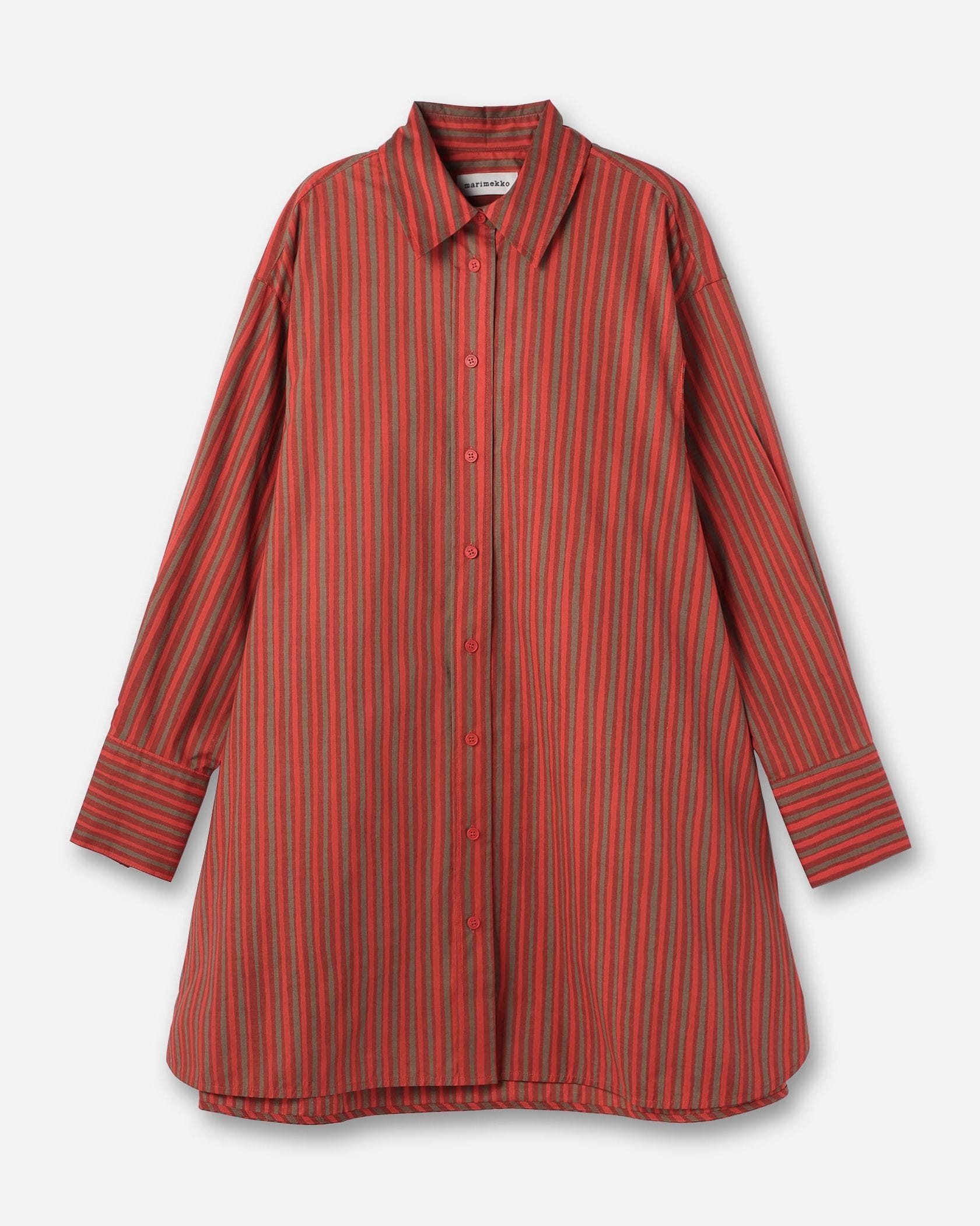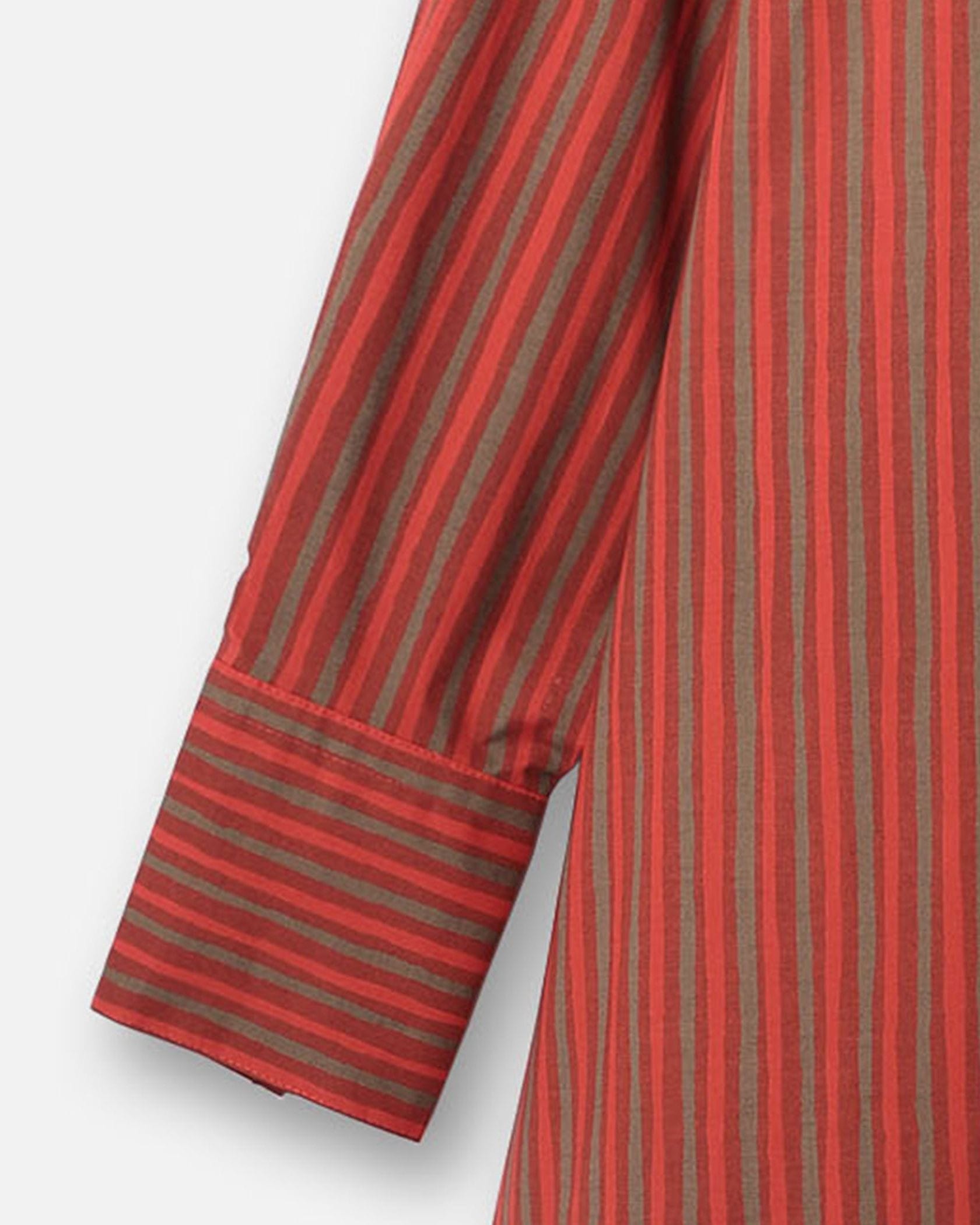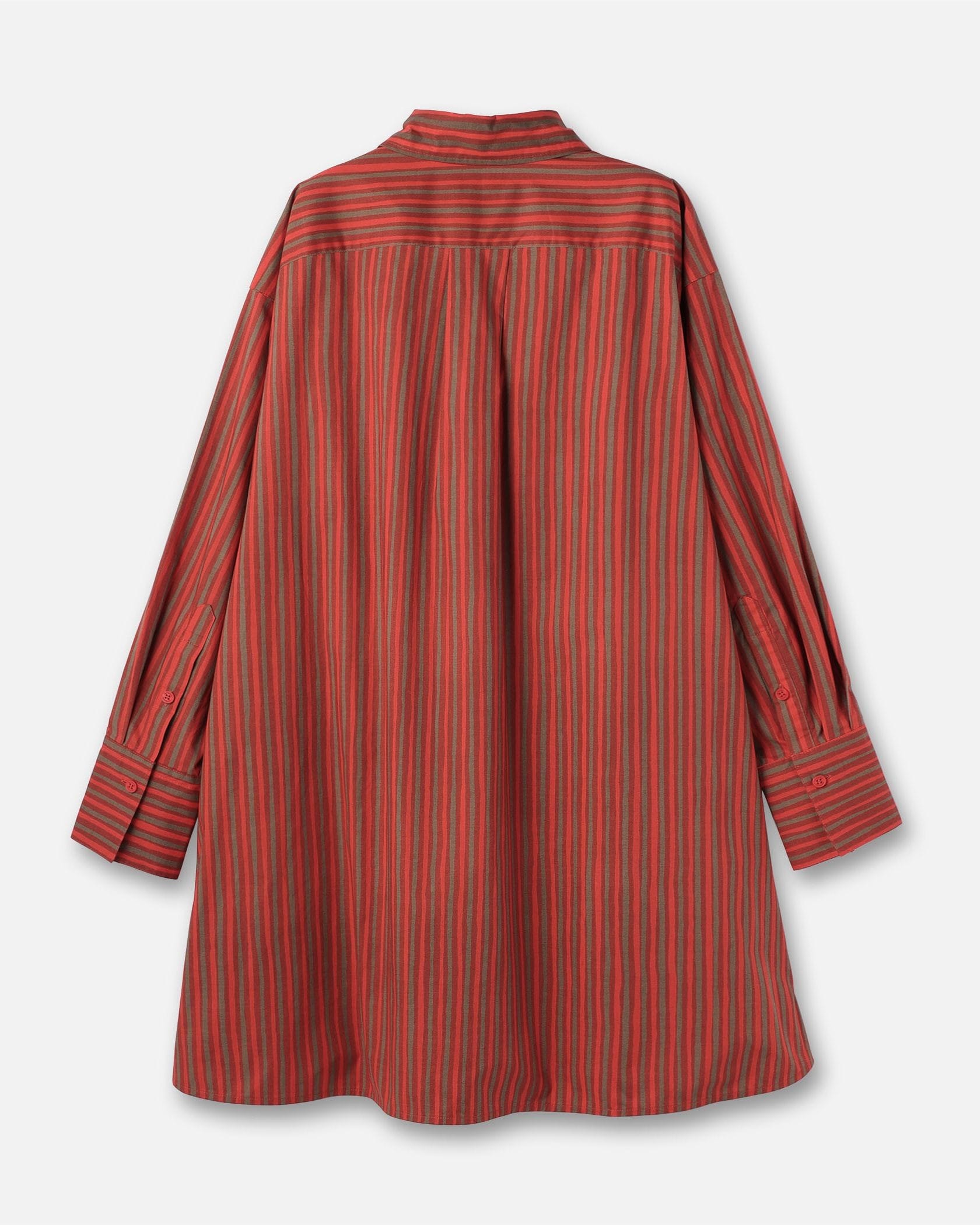 さらりとしたコットンの肌ざわりが心地良いシャツワンピース。メリハリのある3色使いのストライプ柄が、装いを引き立たせるポイントに。パンツをレイヤードしてカジュアルダウンしてもサマになる一枚です。