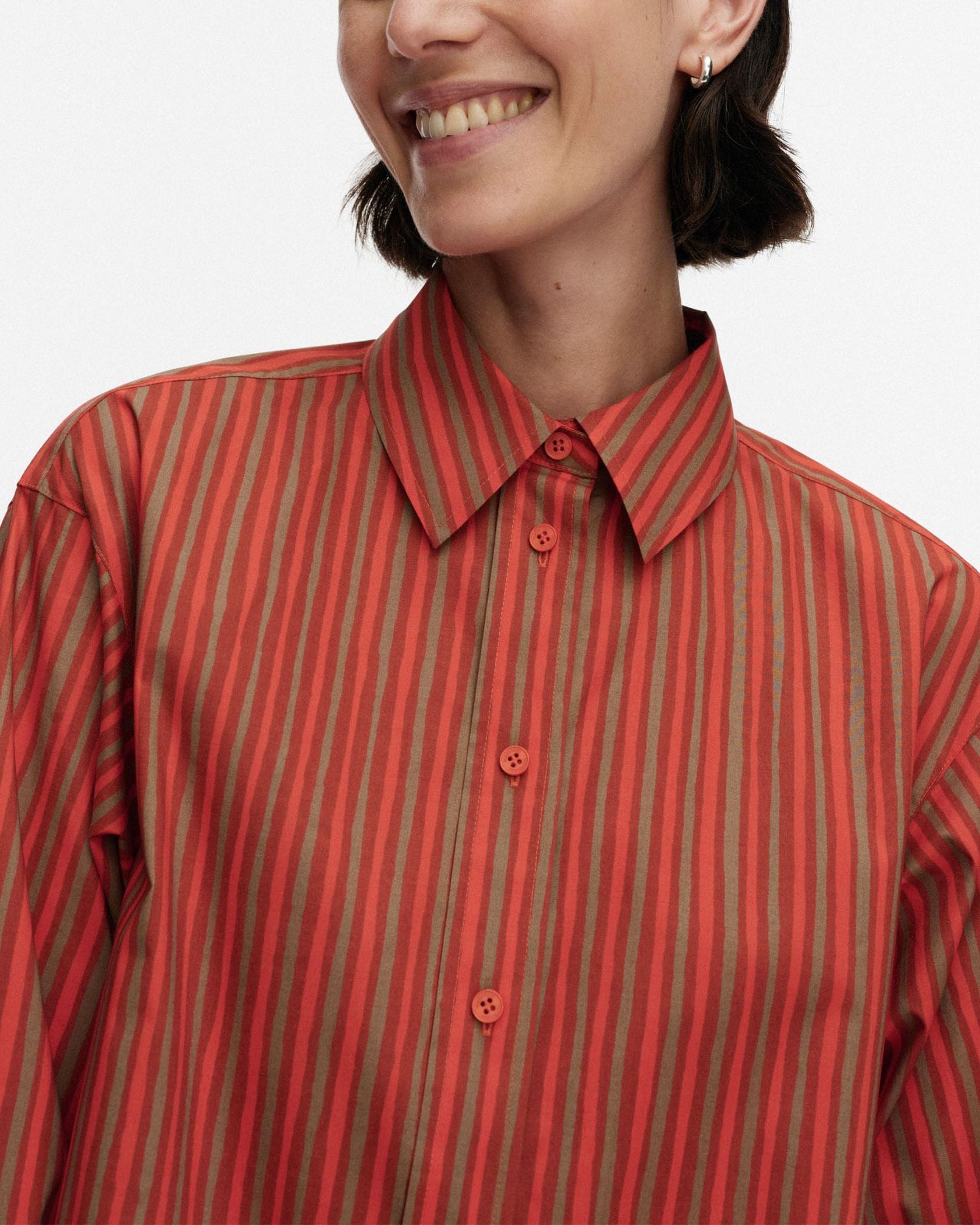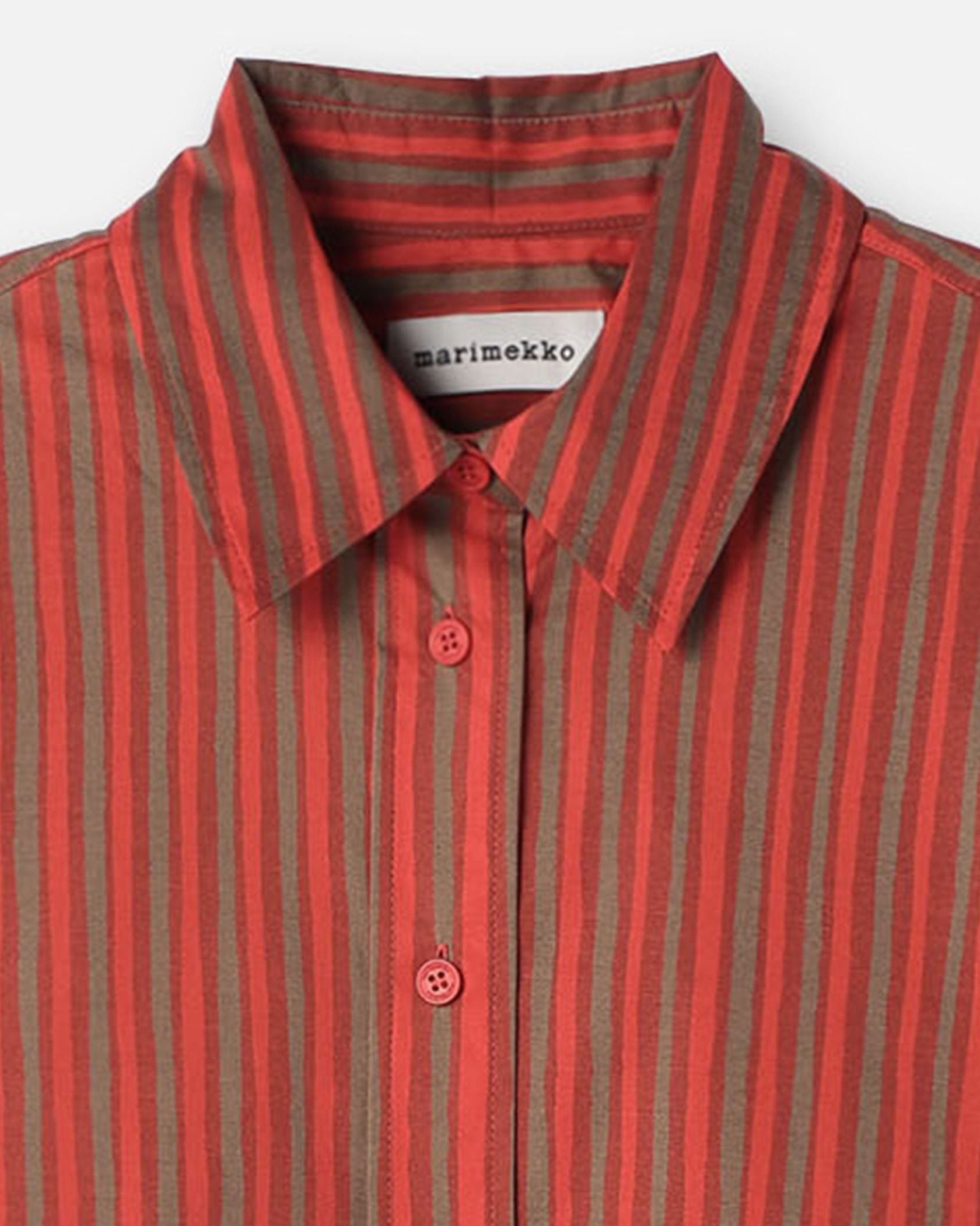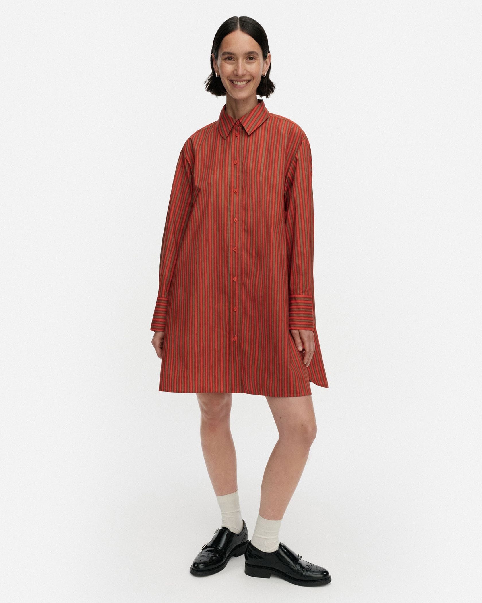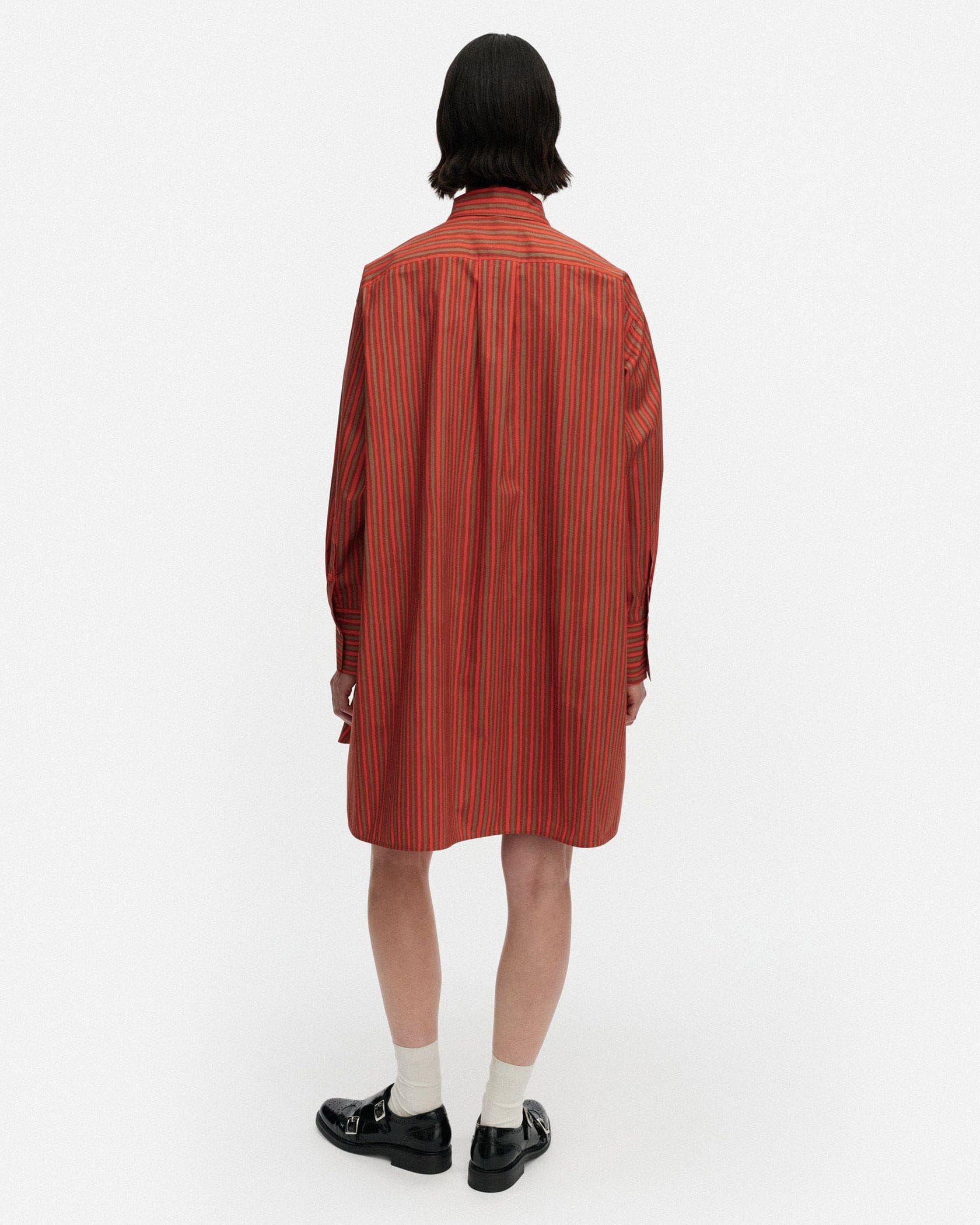 さらりとしたコットンの肌ざわりが心地良いシャツワンピース。メリハリのある3色使いのストライプ柄が、装いを引き立たせるポイントに。パンツをレイヤードしてカジュアルダウンしてもサマになる一枚です。