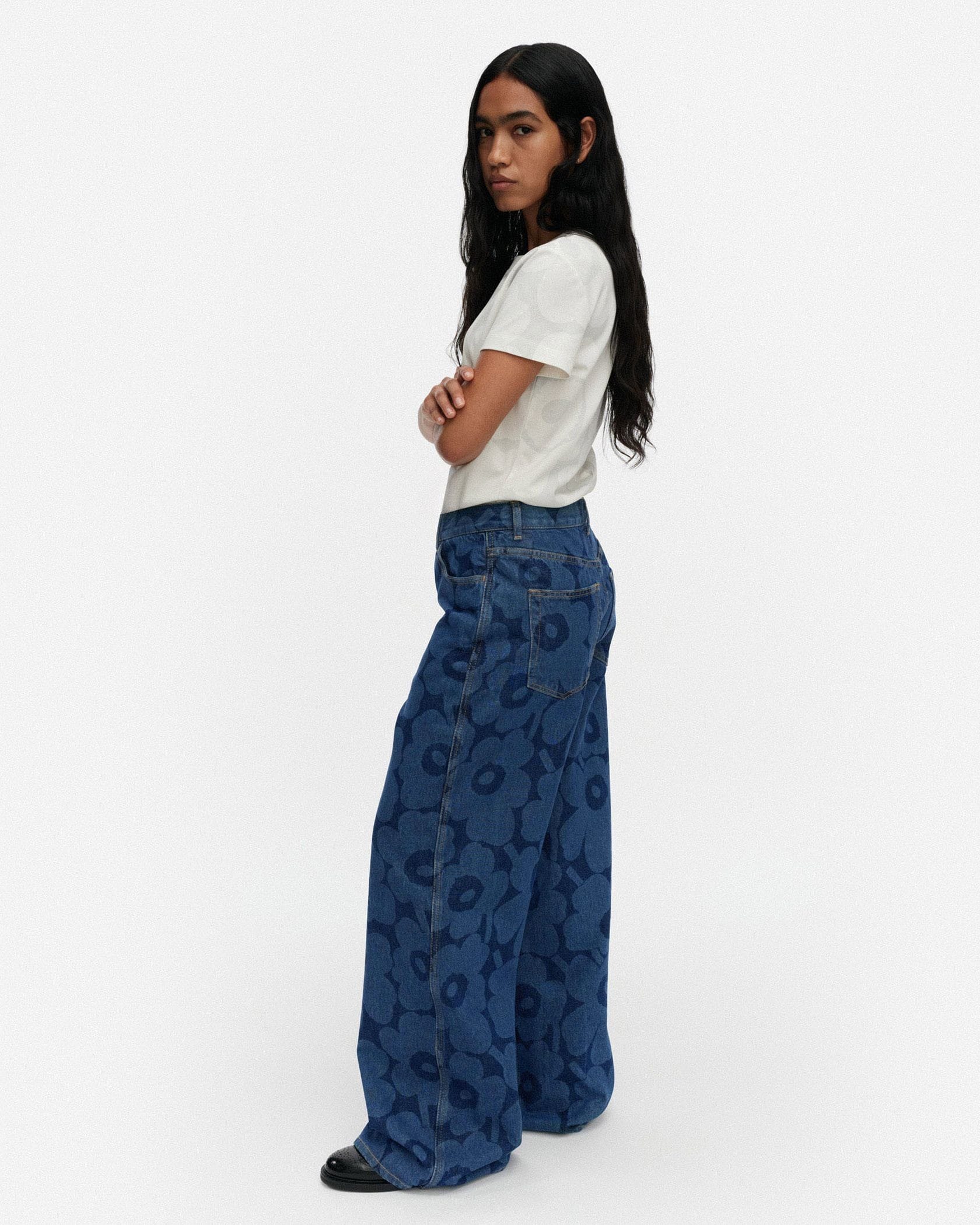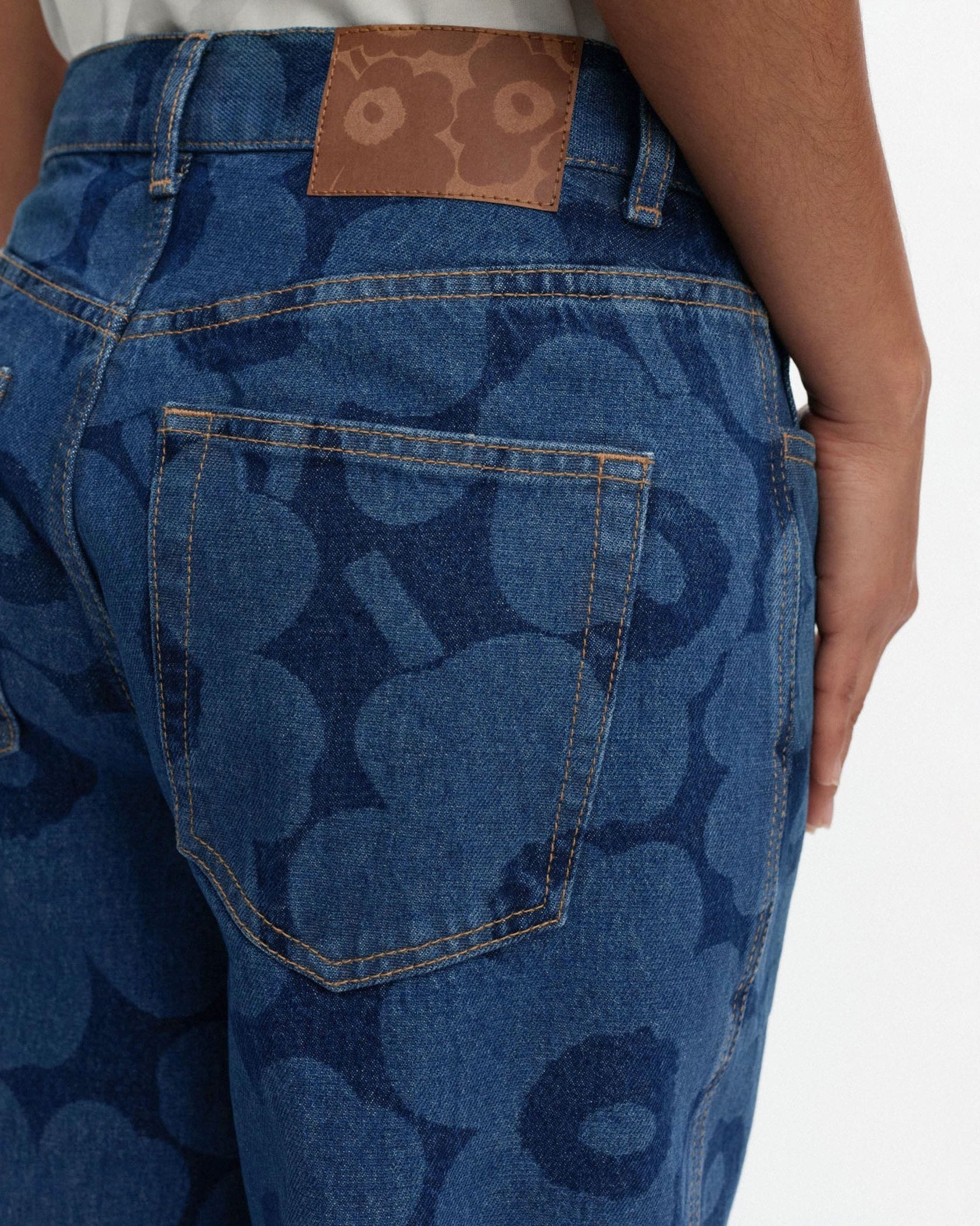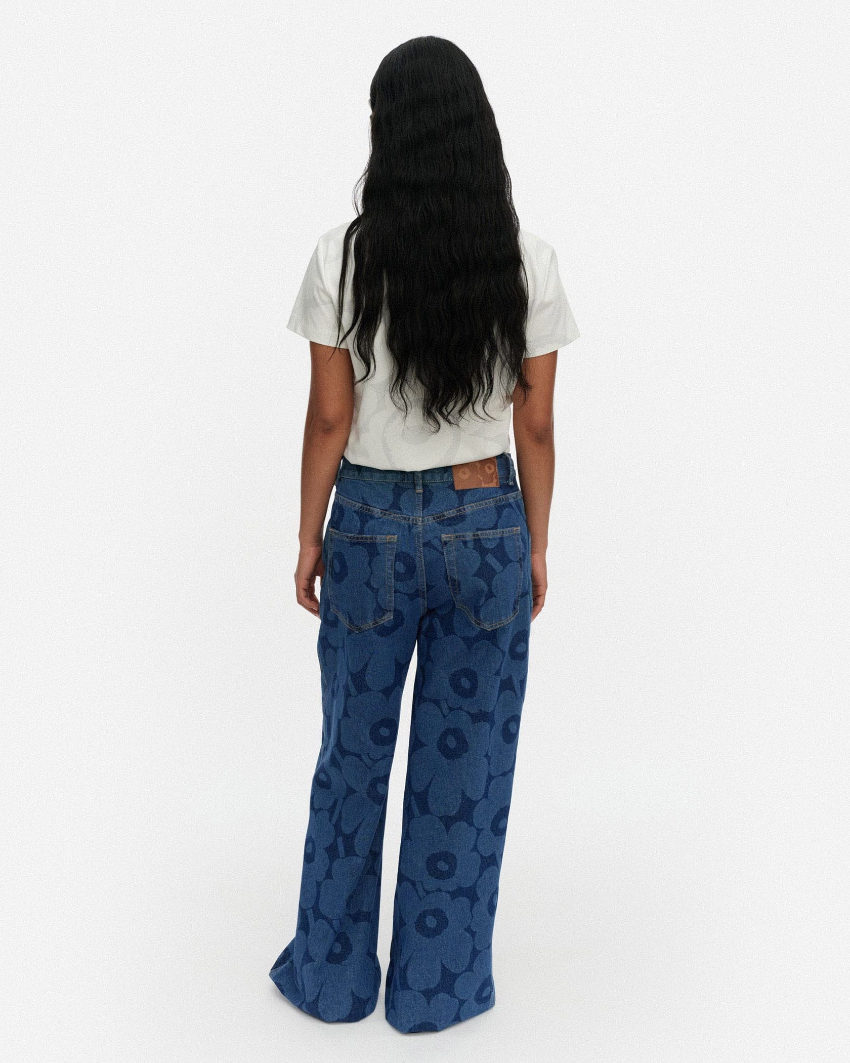 いつもの着こなしがぐっとチャーミングに一新するUnikko柄デニムパンツ。ゆとりのあるストレートシルエットで、抜け感のある着こなしに。シンプルなトップスと合わせて、パンツの個性を引き立たせるのもおすすめです。