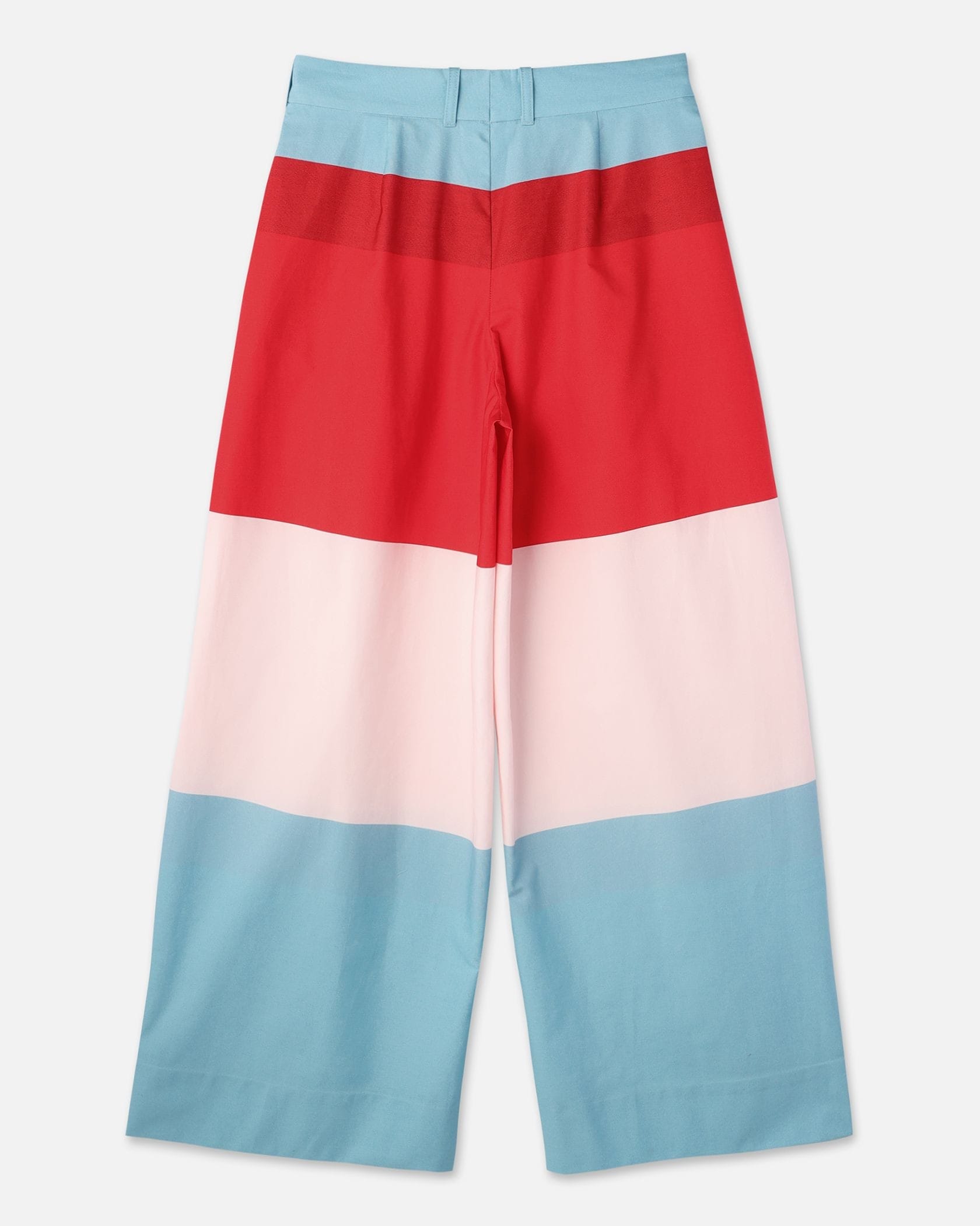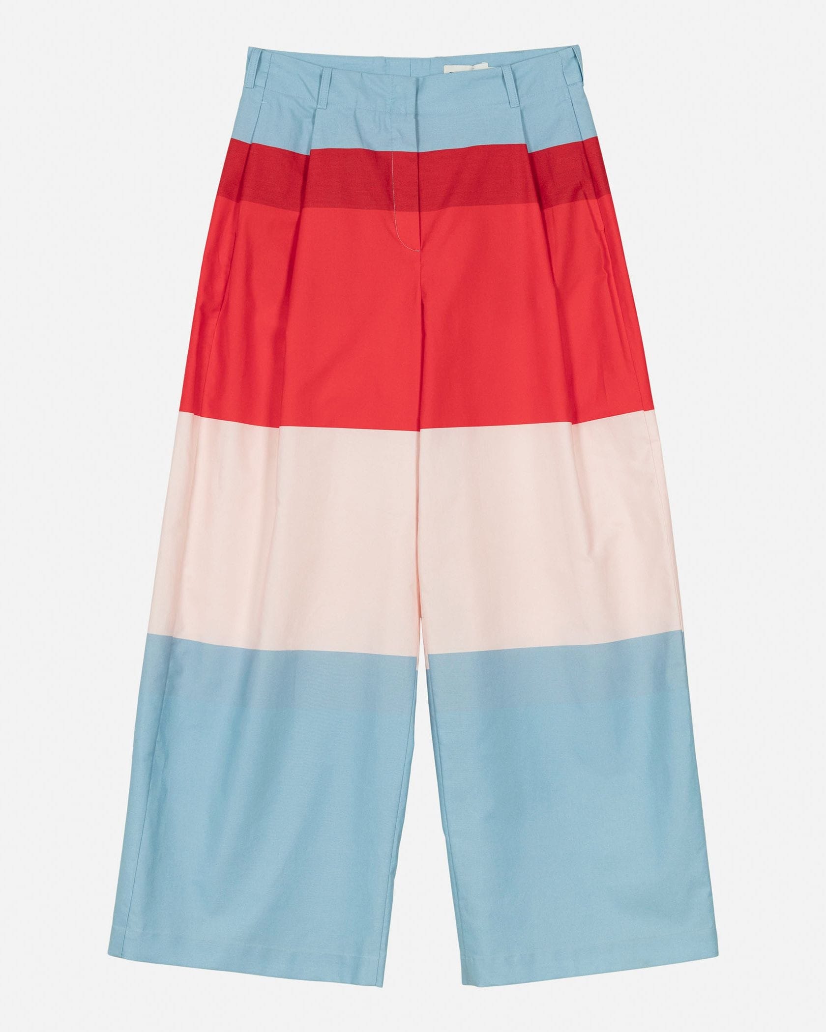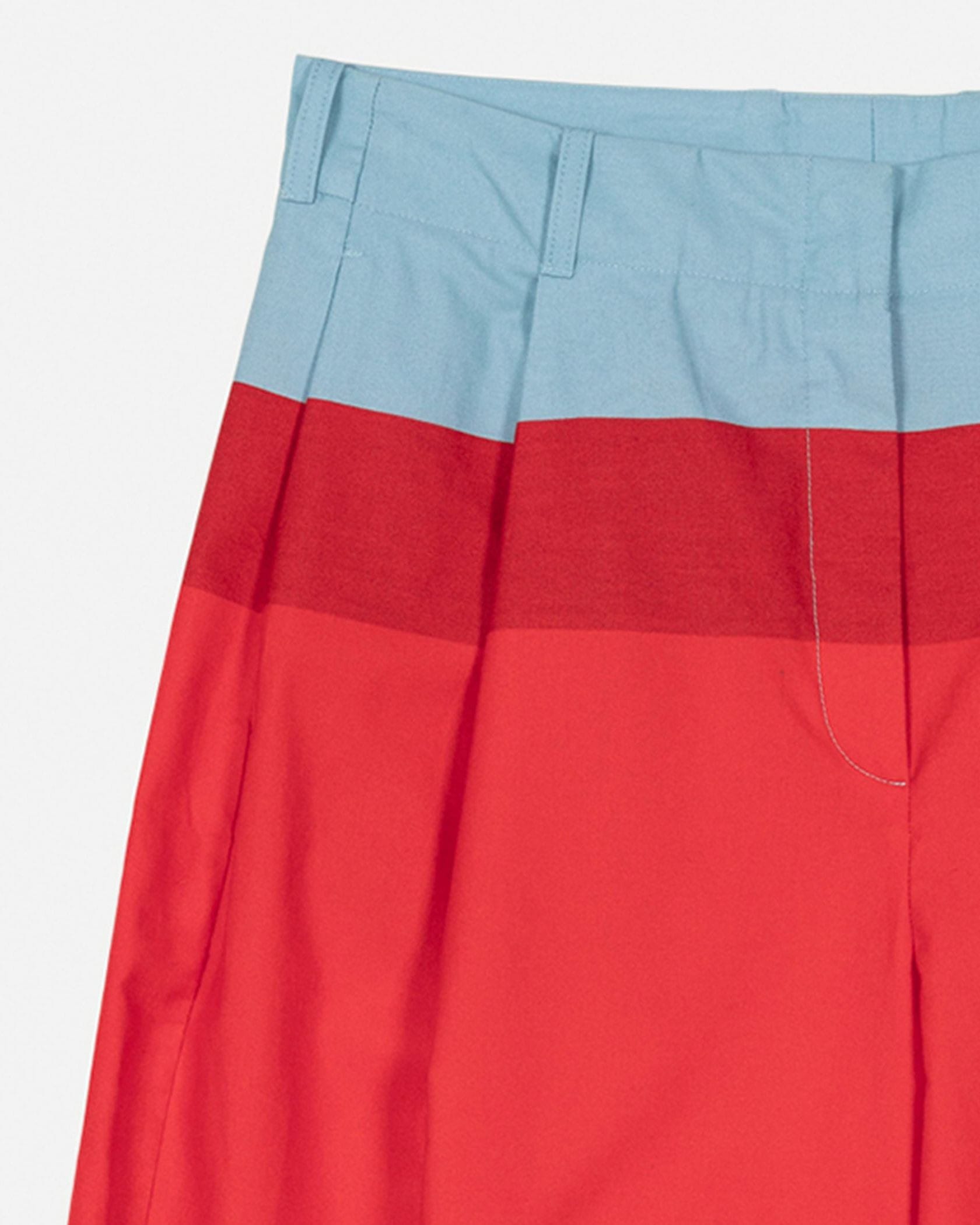 レッド、ピンク、ライトブルーで切り替えたHennikaパターンのパンツ。タックをあしらい、ゆったりとしたリラックスワイドシルエットに仕上げています。サイドポケット、ウエストラインにはベルトループ付き。ハイウエストデザインはトップスインスタイルと相性が良くおすすめです。