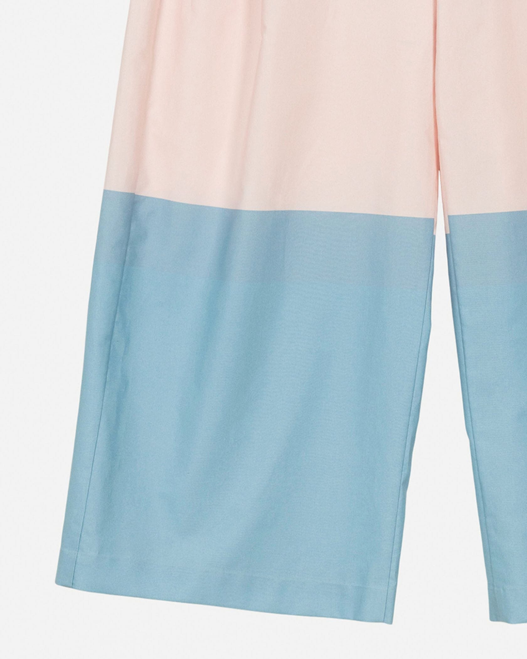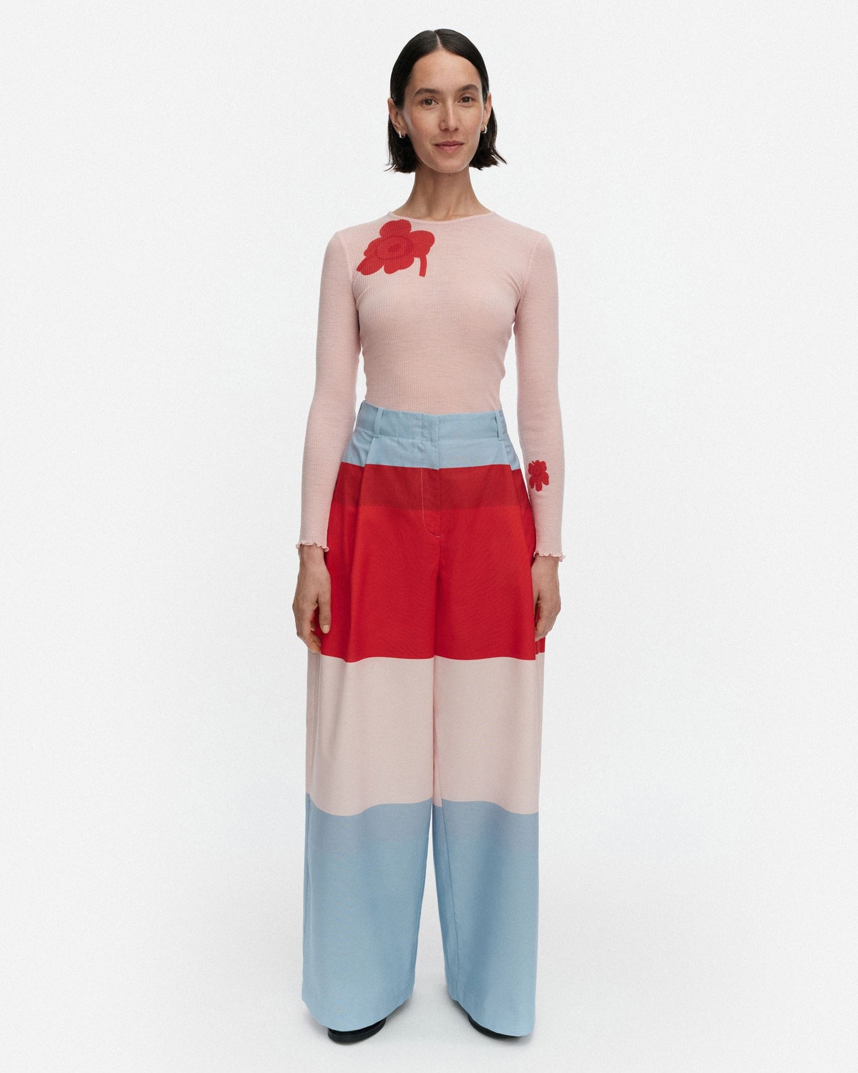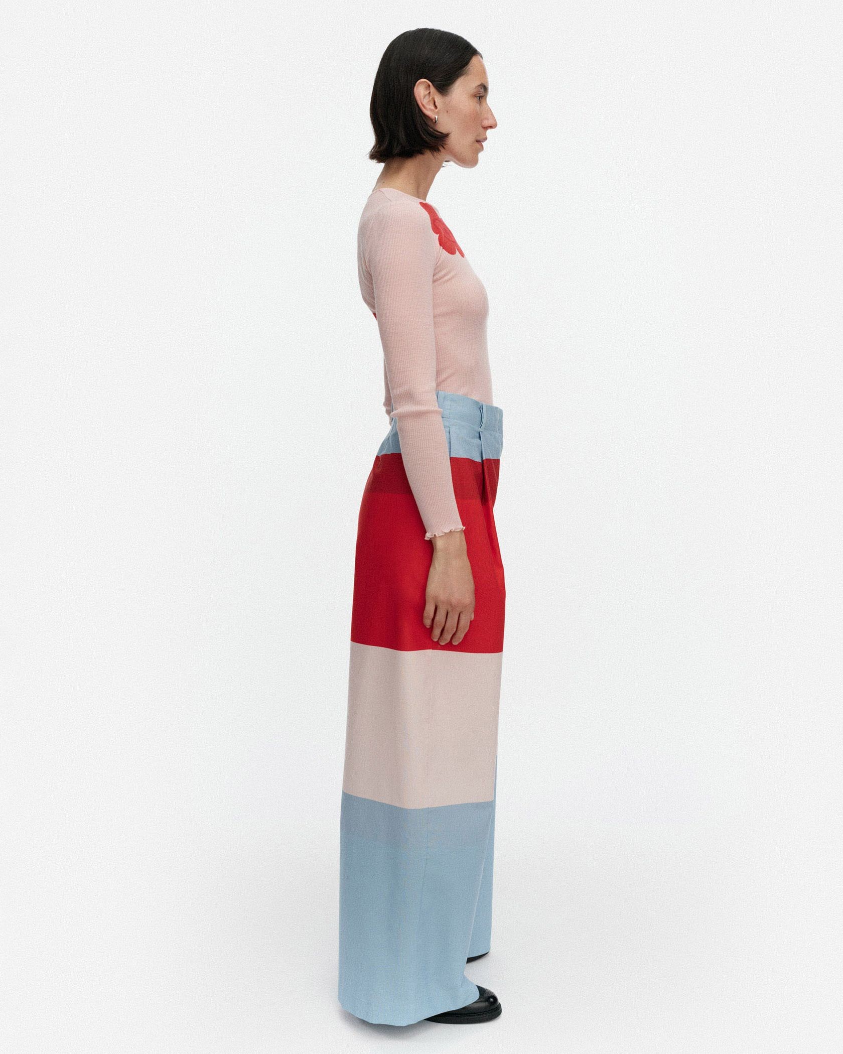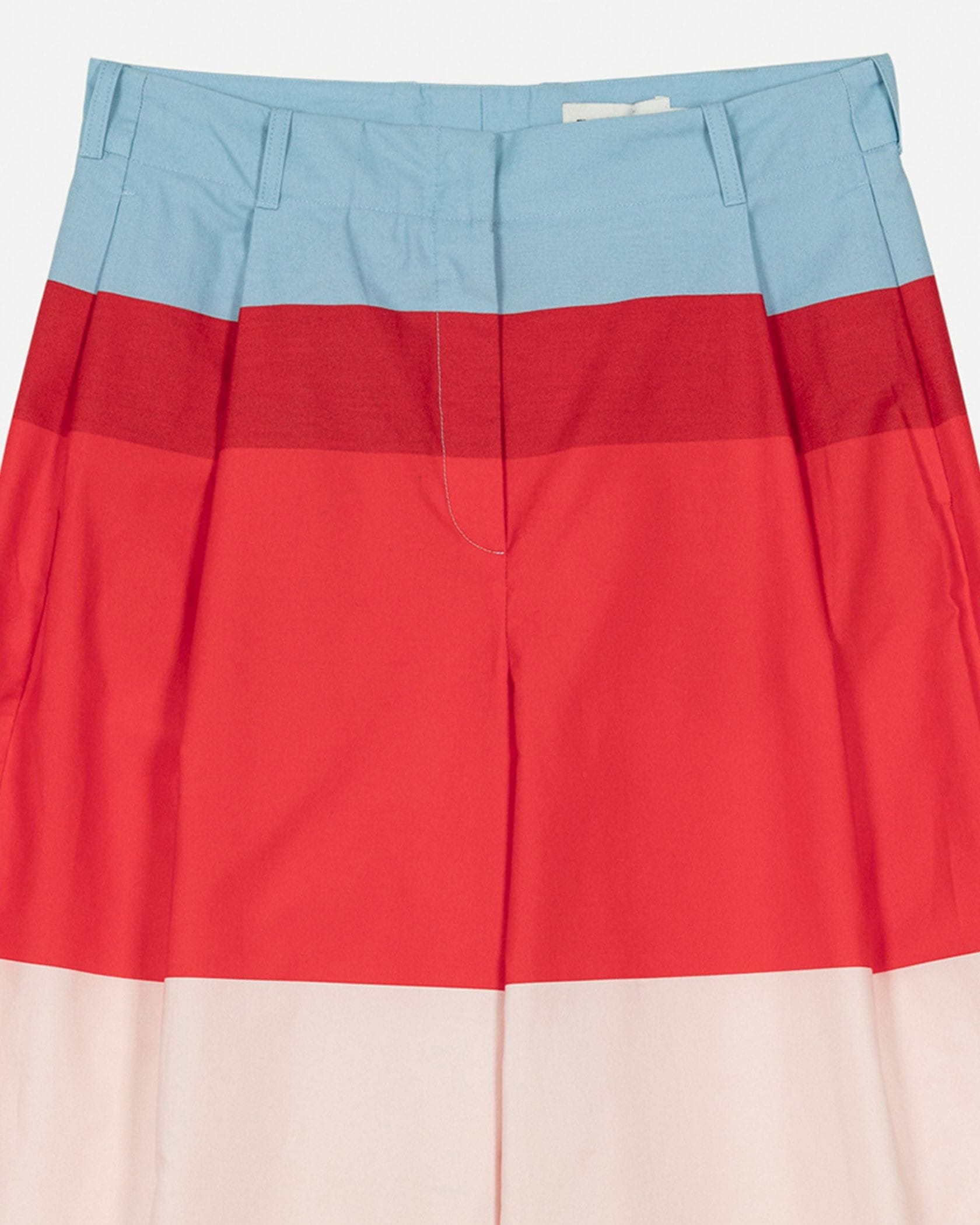 レッド、ピンク、ライトブルーで切り替えたHennikaパターンのパンツ。タックをあしらい、ゆったりとしたリラックスワイドシルエットに仕上げています。サイドポケット、ウエストラインにはベルトループ付き。ハイウエストデザインはトップスインスタイルと相性が良くおすすめです。