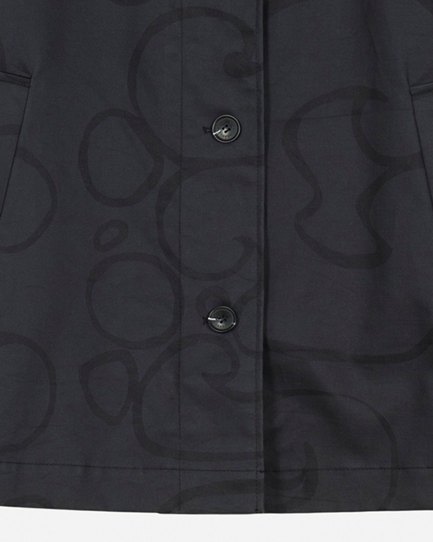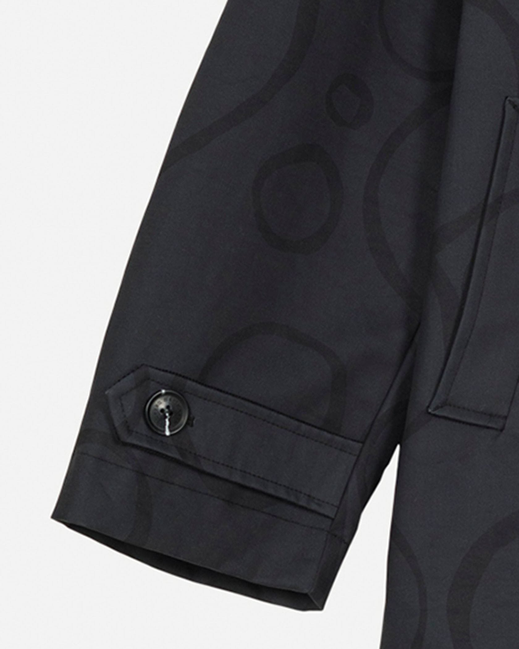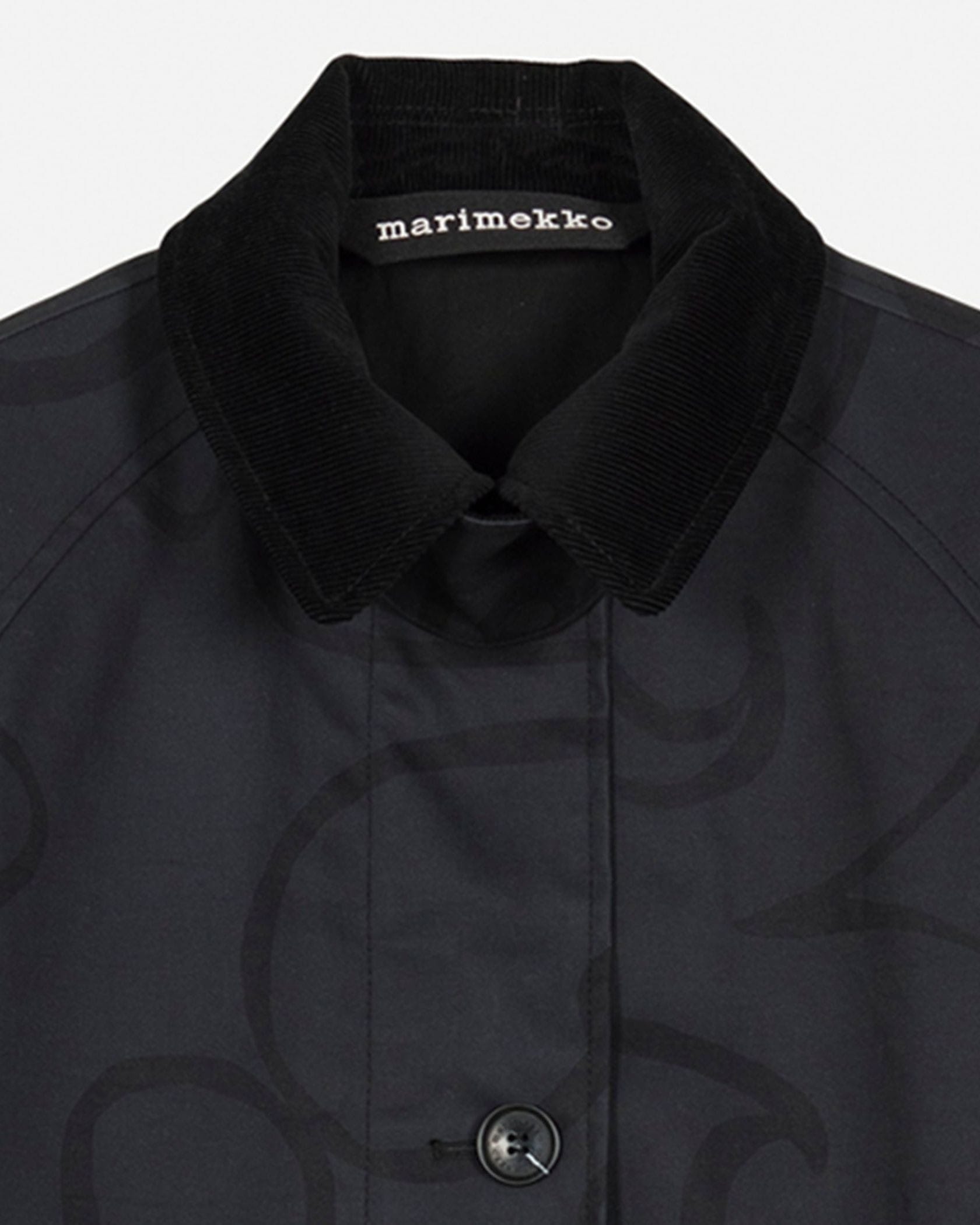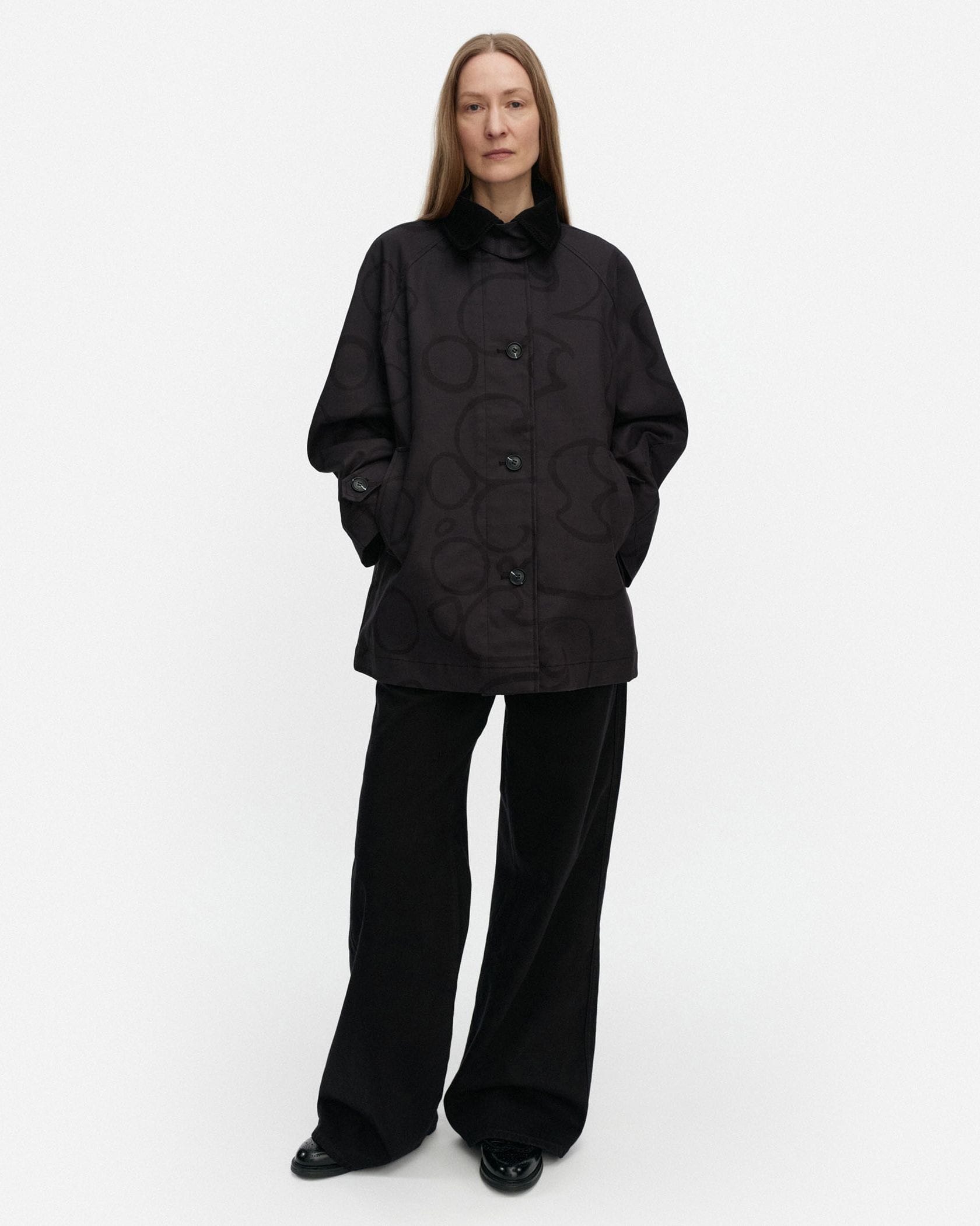 衿をコーデュロイ素材で切り替えたKeidasパターンのコート。程よくゆとりのあるシルエットでカジュアルに羽織れます。フロントはボタン留め、左右にポケットを配置。ラグランスリーブにボタンタブがあしらわれたデザイン。ブラックでシックにまとめたアイテムです。