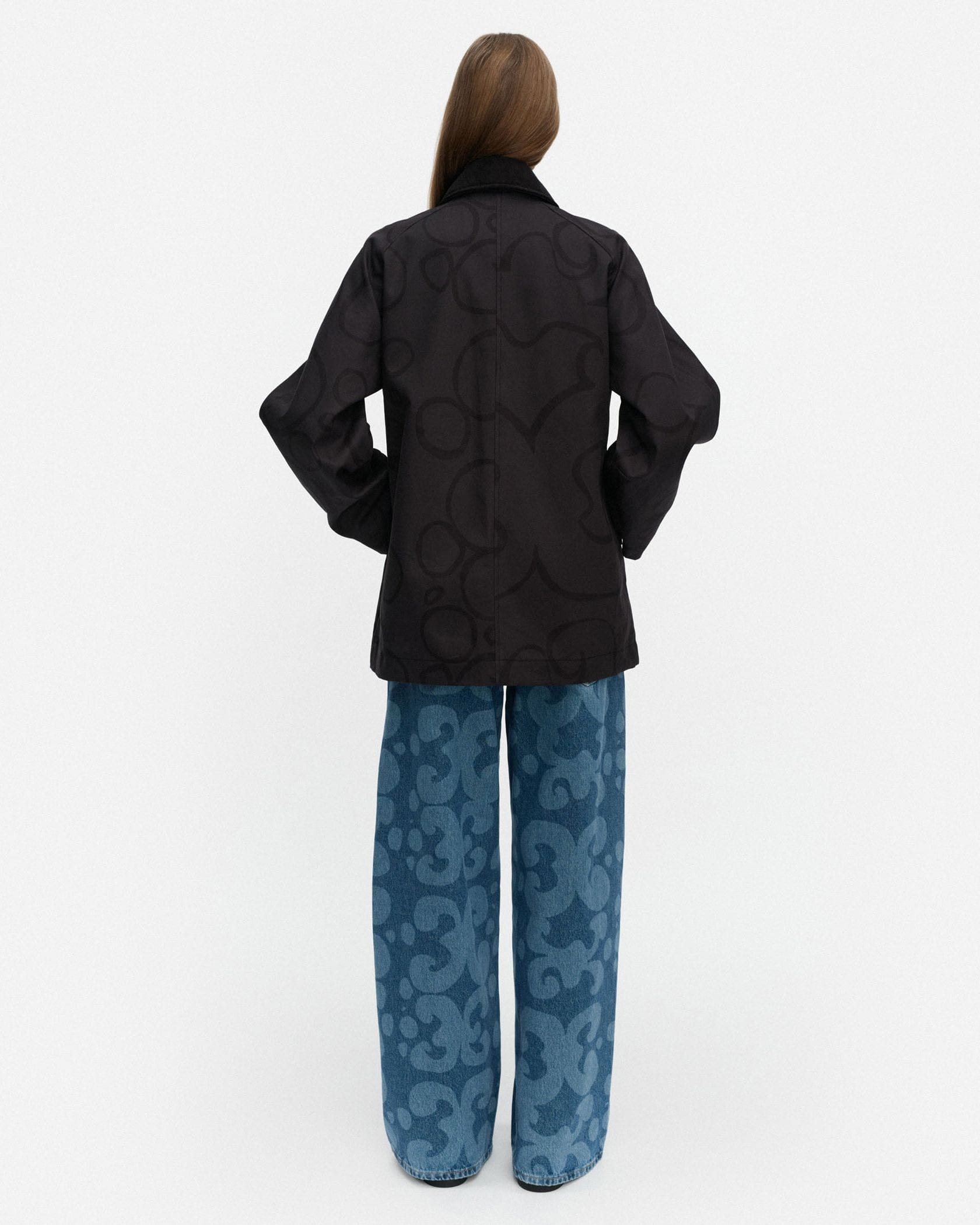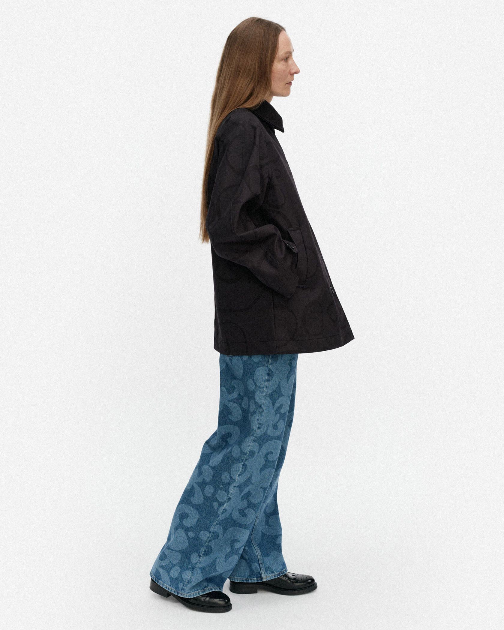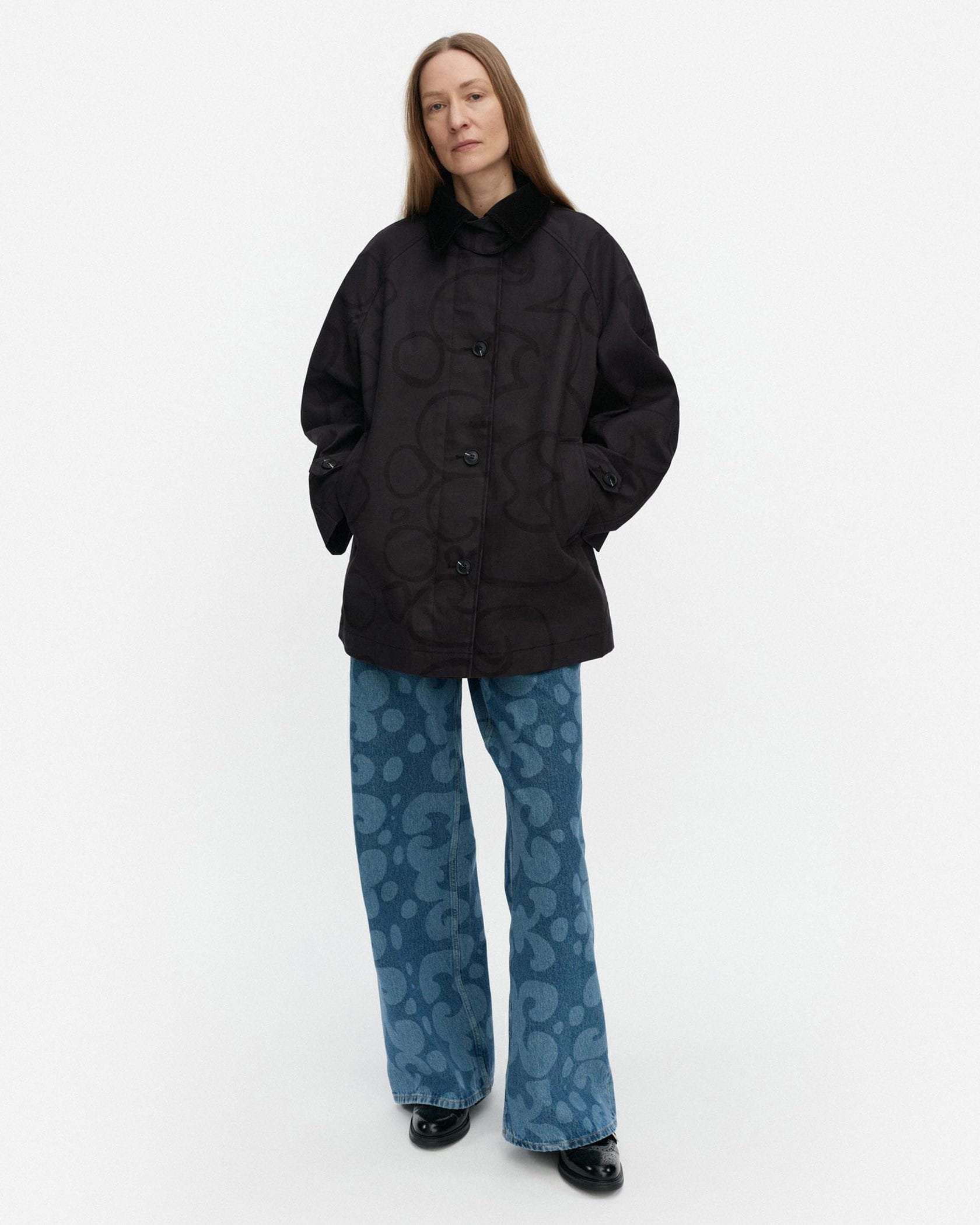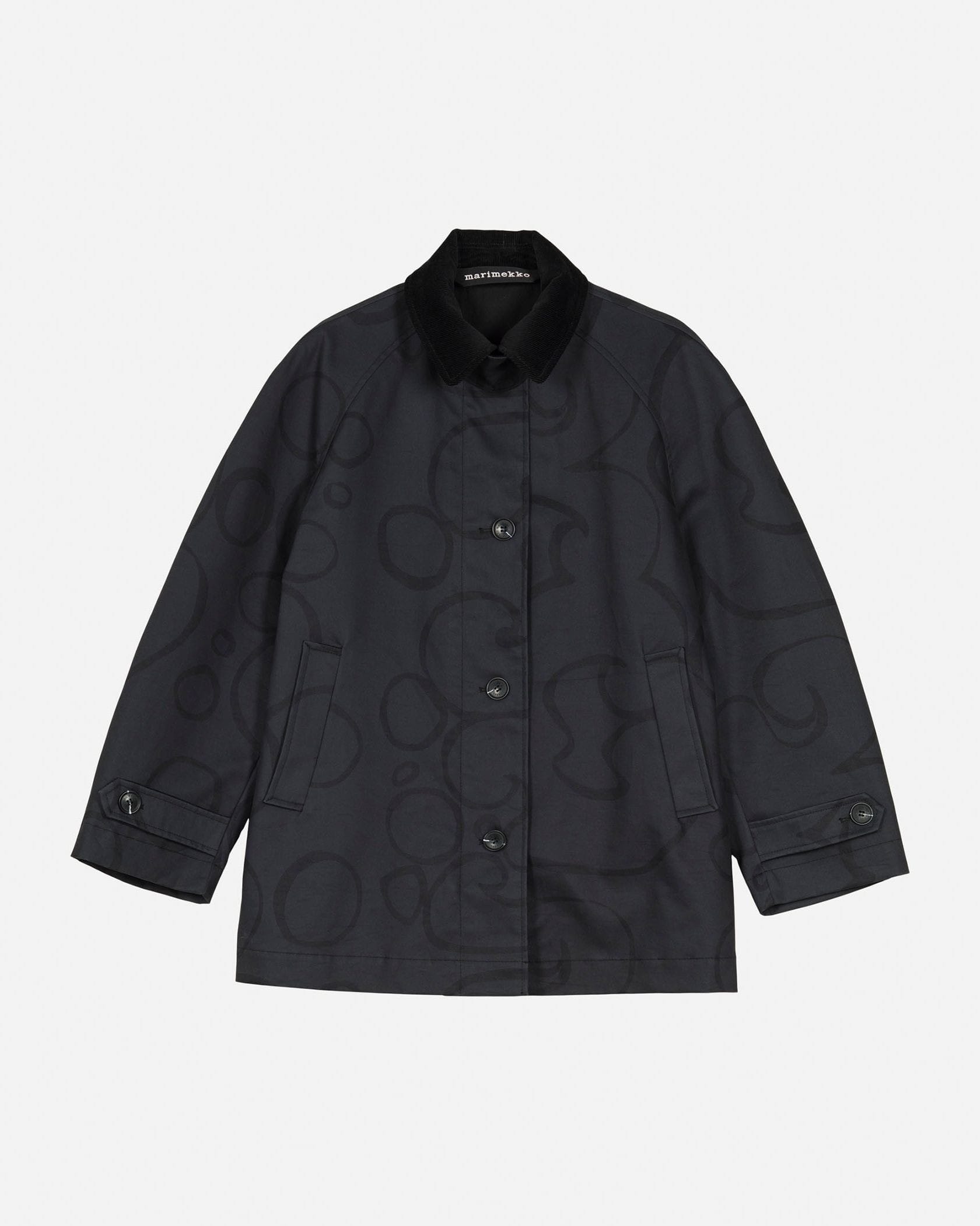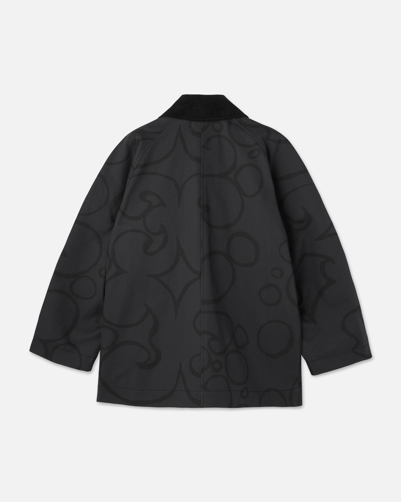 衿をコーデュロイ素材で切り替えたKeidasパターンのコート。程よくゆとりのあるシルエットでカジュアルに羽織れます。フロントはボタン留め、左右にポケットを配置。ラグランスリーブにボタンタブがあしらわれたデザイン。ブラックでシックにまとめたアイテムです。