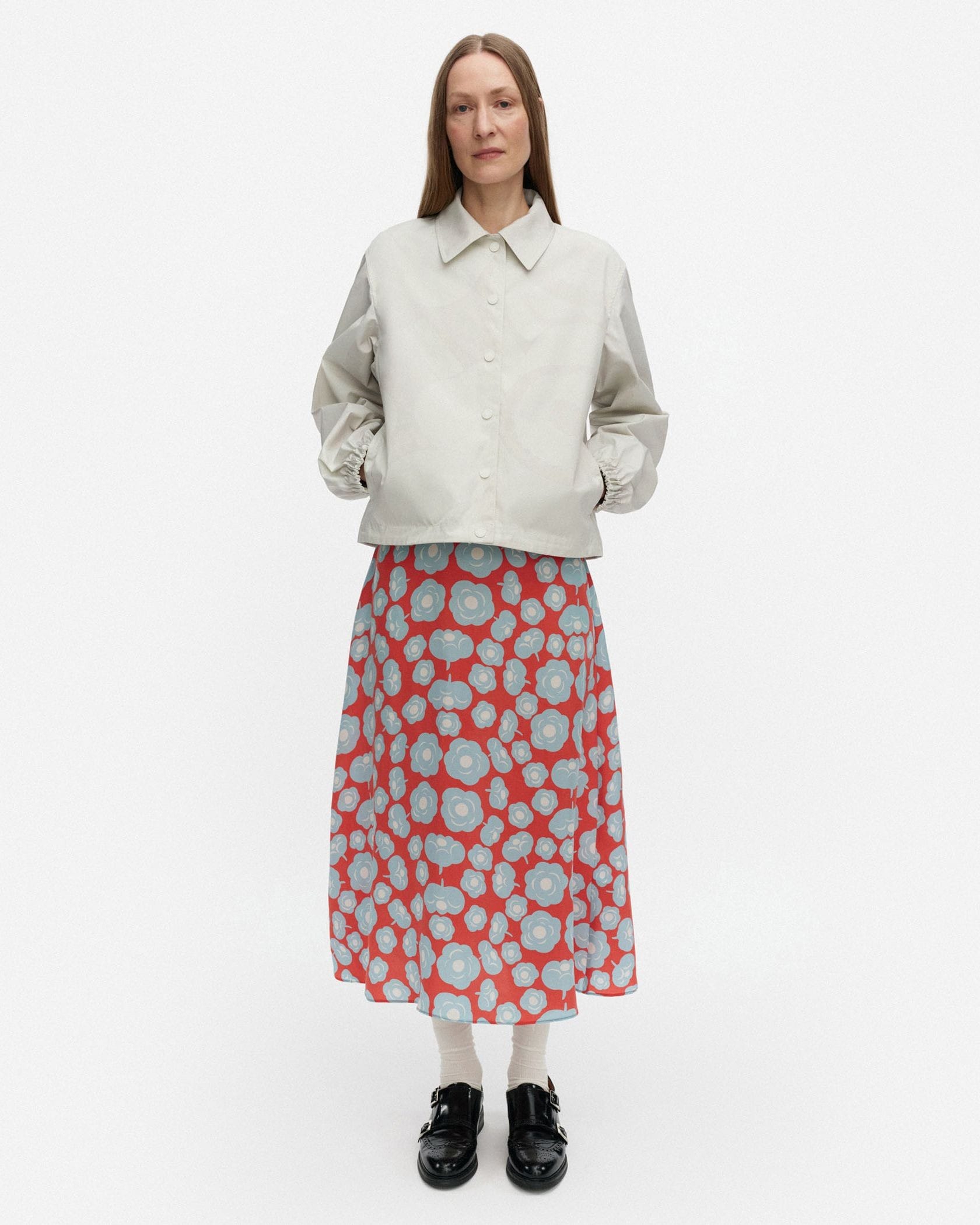 unikko柄のモチーフを大きくプリントしたショート丈コート。春夏シーズンにぴったりな軽やかなコットン生地。ゆったりとしたフィット感がモダンなシルエット。袖口は、クシュっとしたゴムギャザーが愛らしいデザインアクセント。大きなフラワーモチーフながら、主張しすぎないカラートーンで様々な着こなしにマッチします。