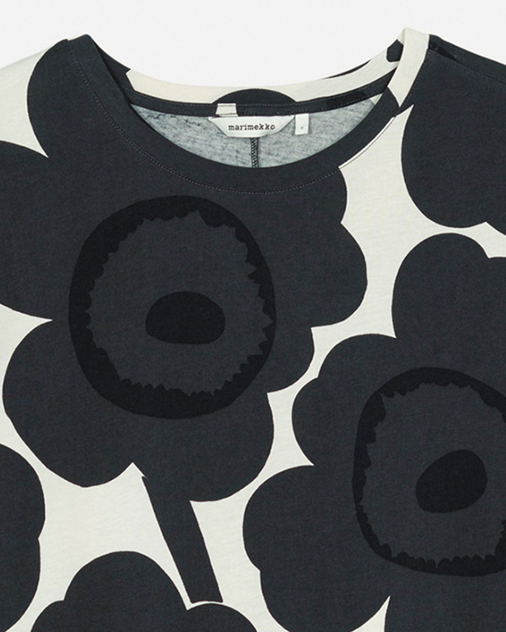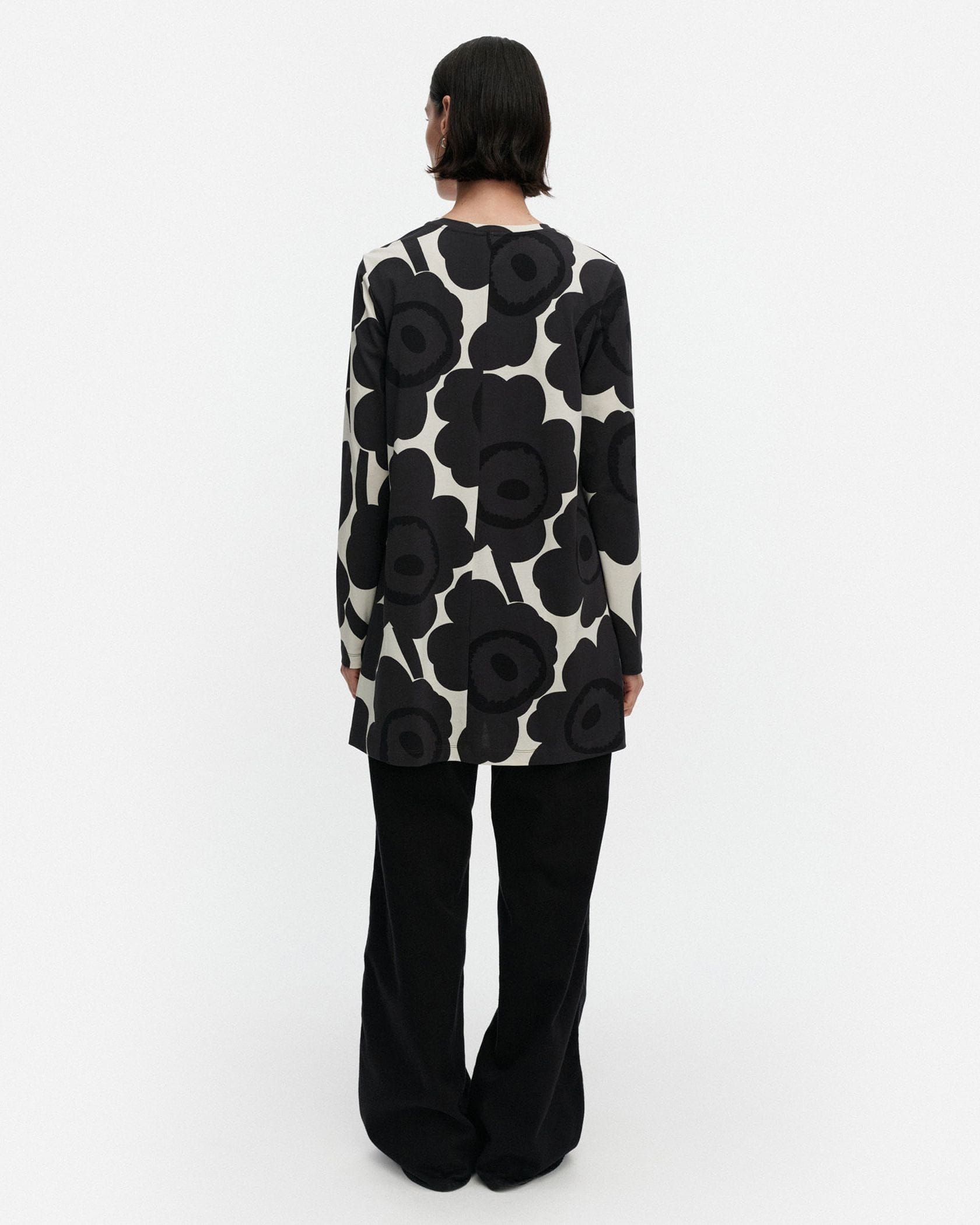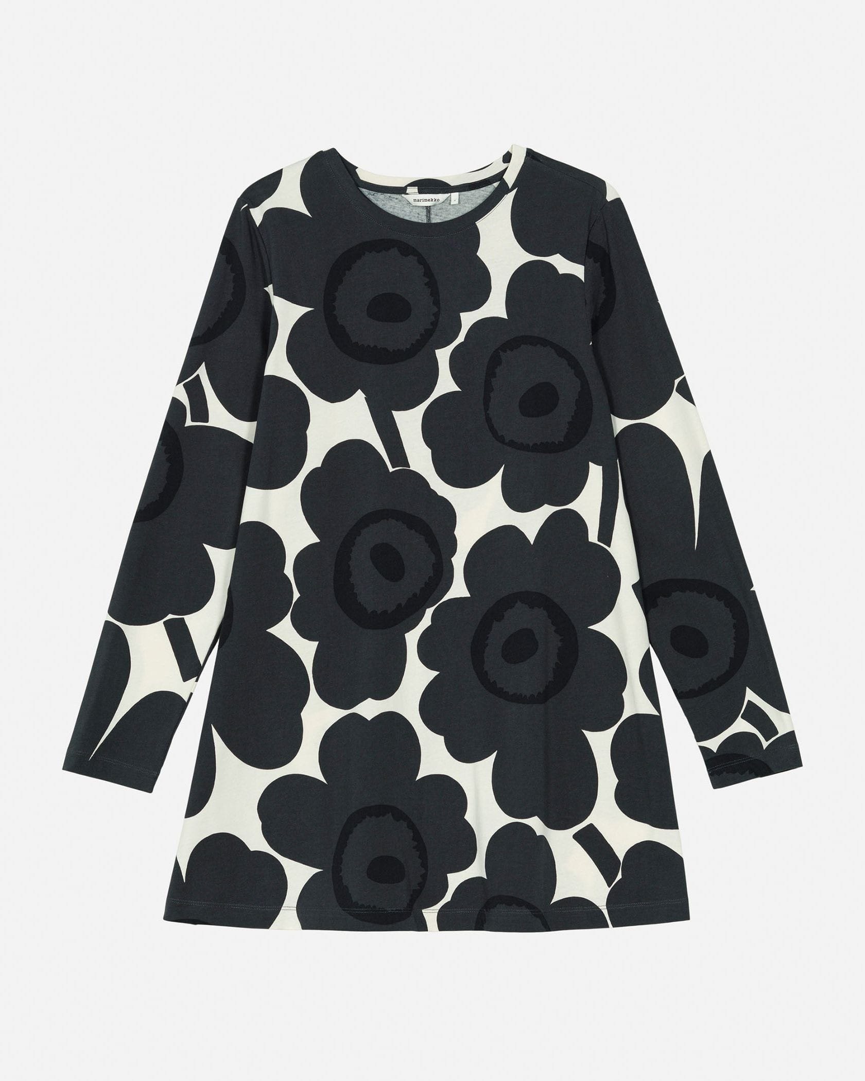 Marimekkoを代表するUnikko柄モチーフのチュニック。大きくプリントされたフラワーモチーフが華やかなデザイン。スリムフィットのトップから裾に向かってAラインに広がる少し長めの丈感がフェミニンさのあるシルエット。お手持ちのボトムを合わせるだけでスタイリッシュなコーディネートが実現します。