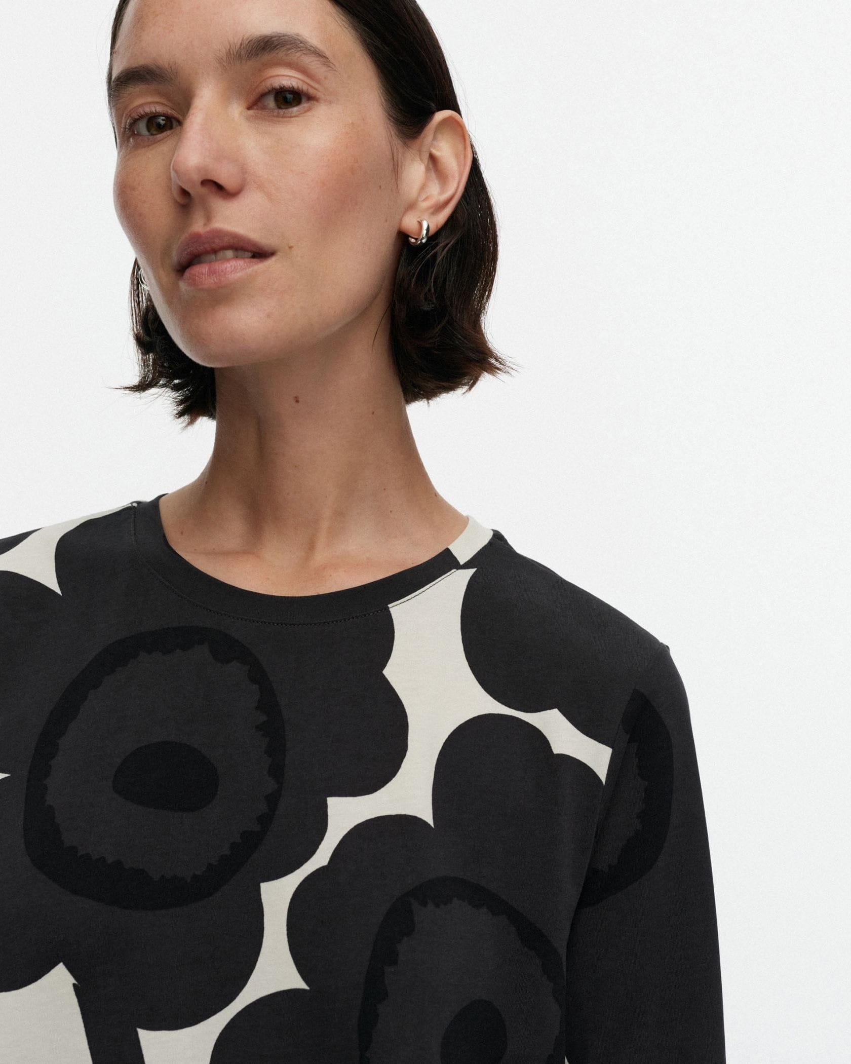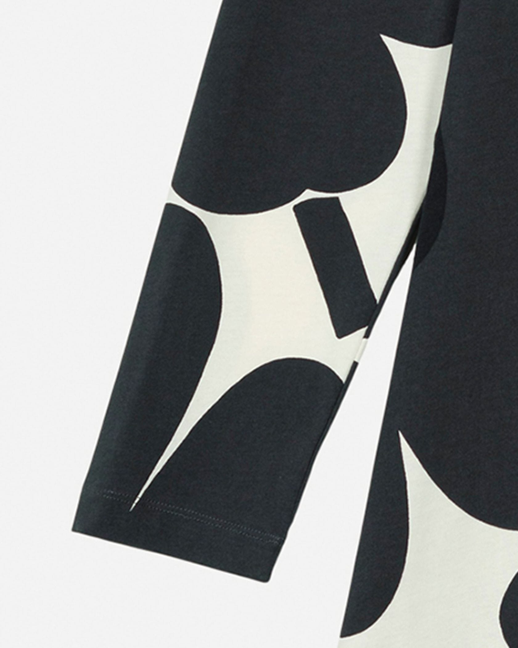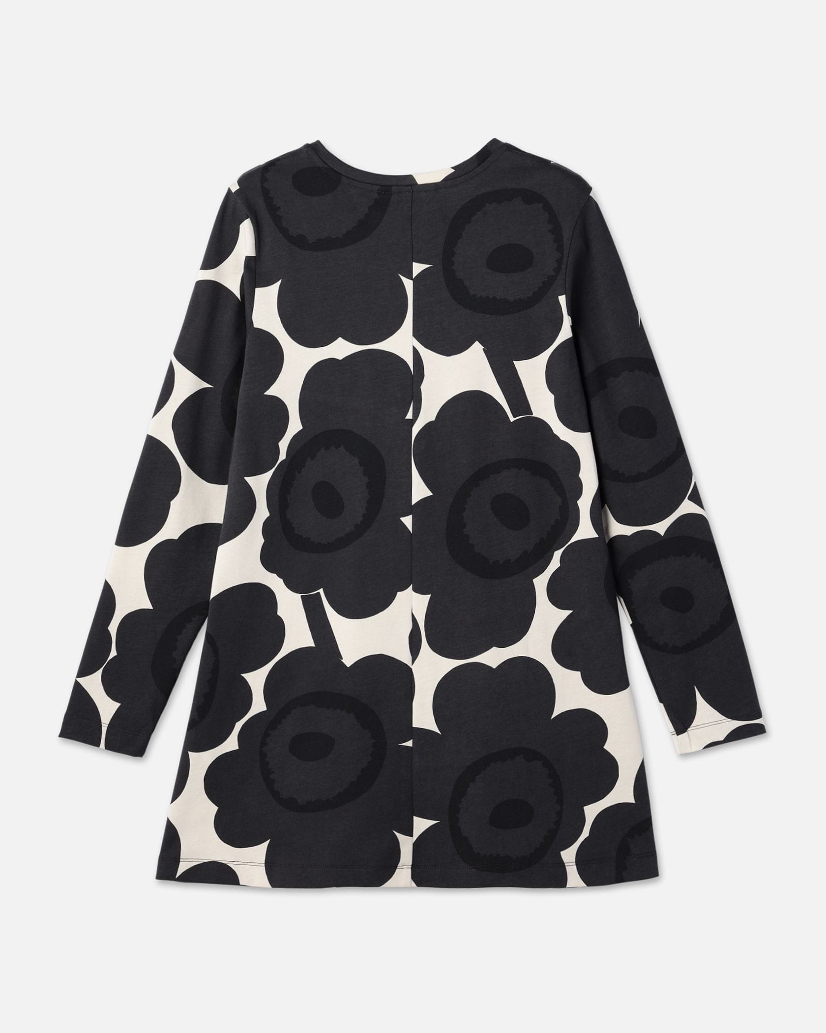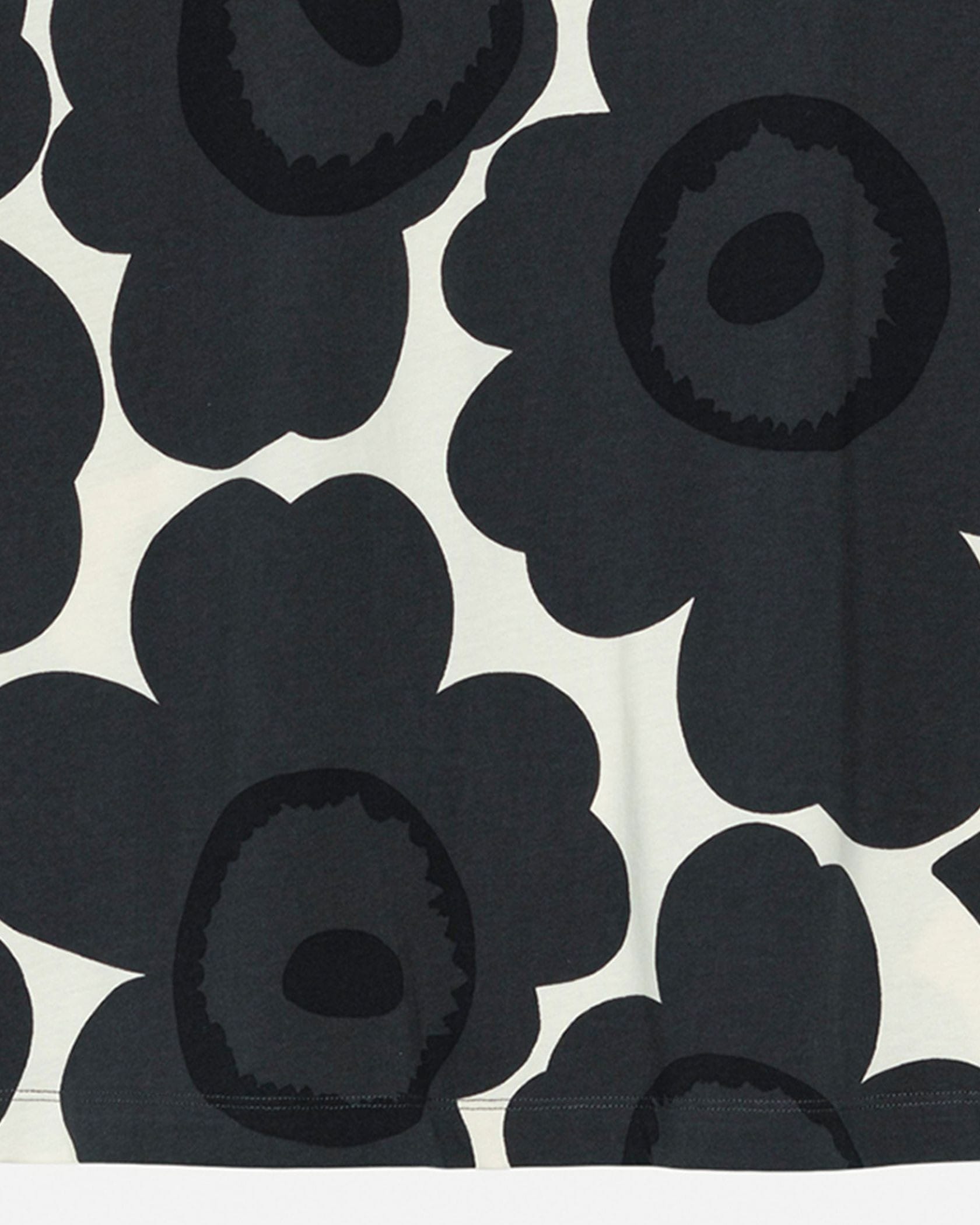 Marimekkoを代表するUnikko柄モチーフのチュニック。大きくプリントされたフラワーモチーフが華やかなデザイン。スリムフィットのトップから裾に向かってAラインに広がる少し長めの丈感がフェミニンさのあるシルエット。お手持ちのボトムを合わせるだけでスタイリッシュなコーディネートが実現します。