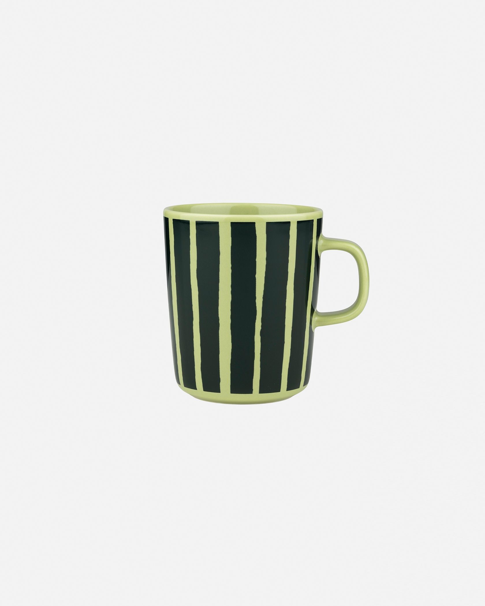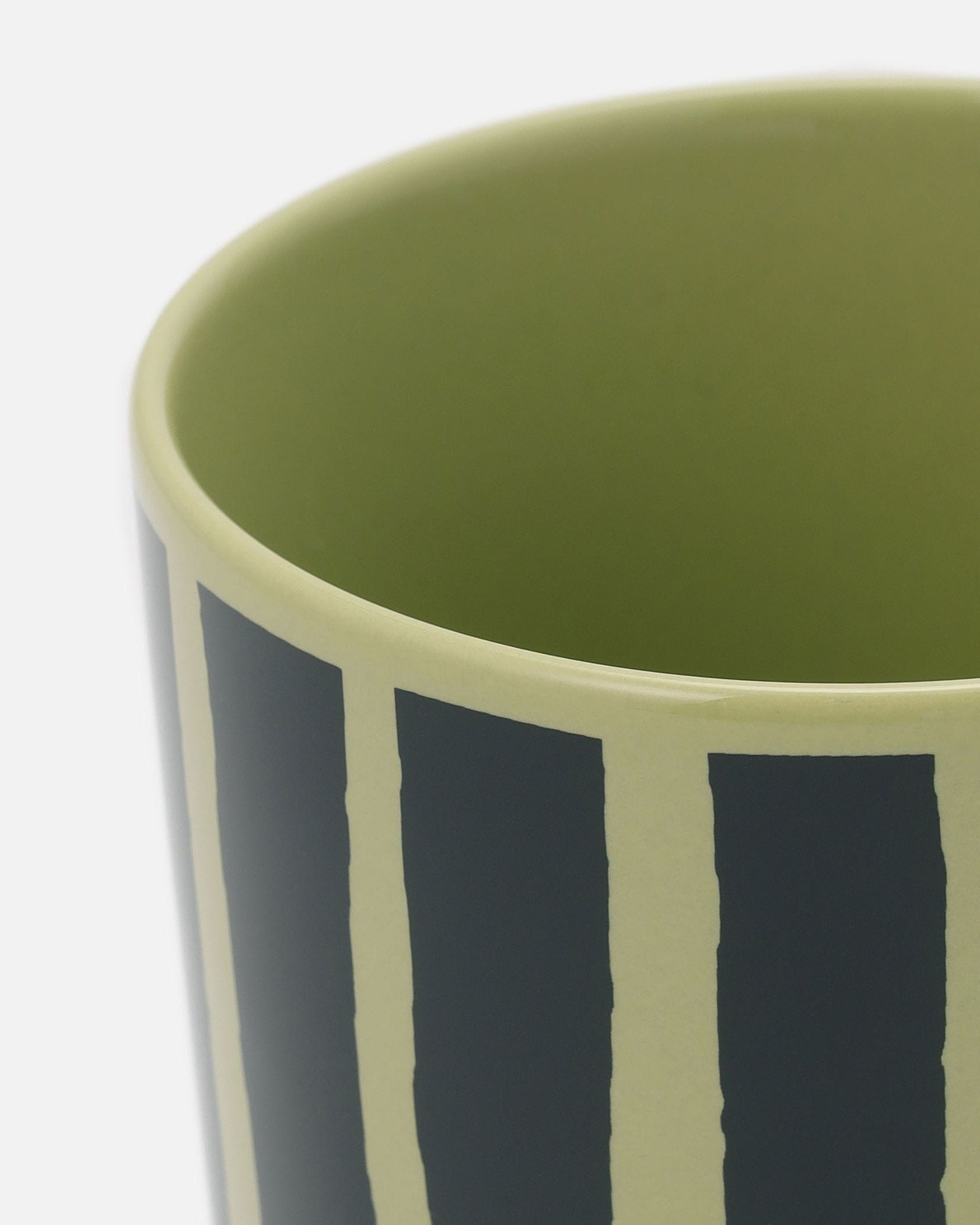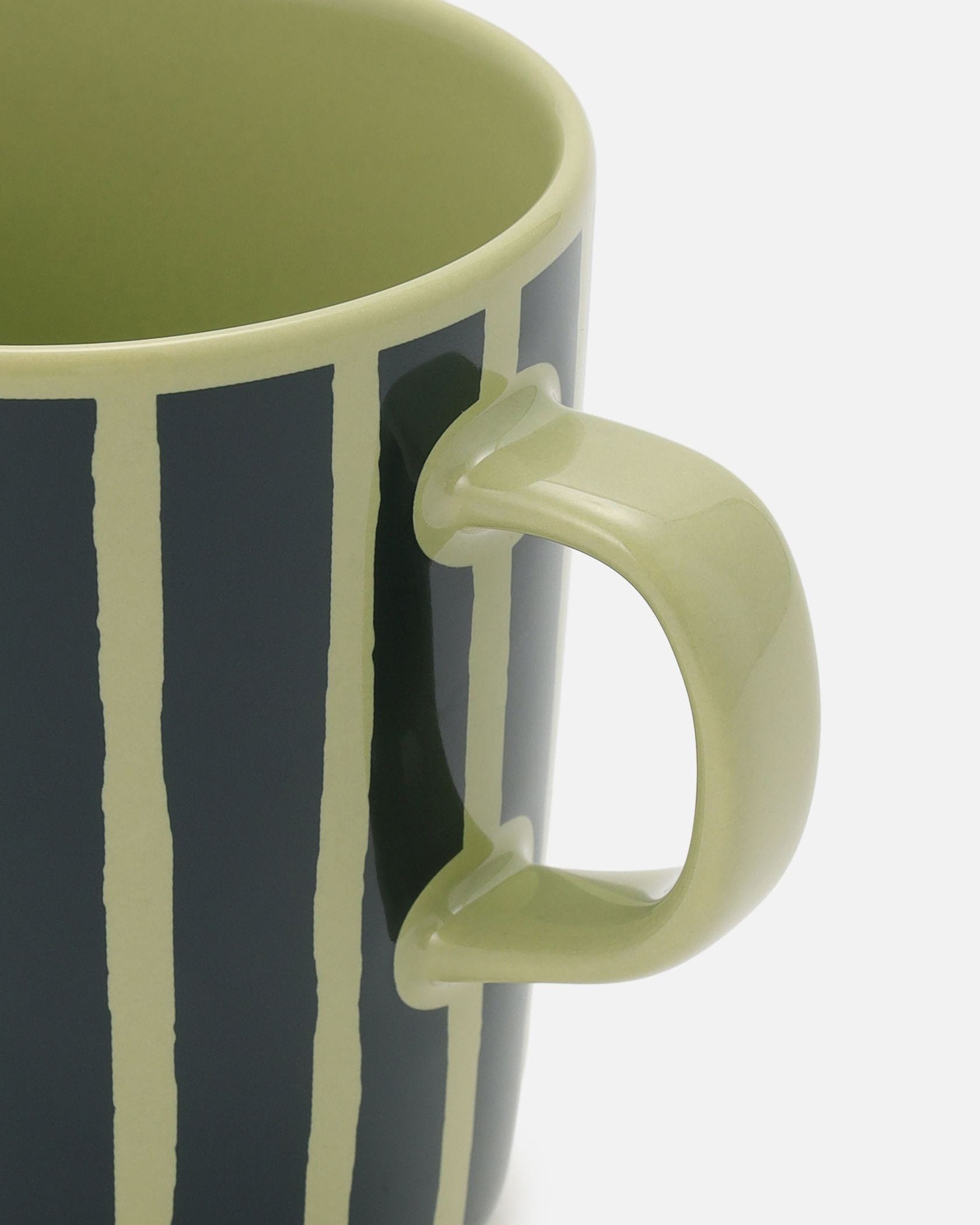 温もりを感じさせる手描きタッチのストライプ柄を用いたマグカップ。手にしっくりとなじむ250mlサイズ。温かいお湯などをこまめに飲みたい時にも最適な大きさです。グリーンを基調としているため、リラックスタイムのお供にも最適。新生活を始める方へのギフトにもおすすめのアイテムです。
