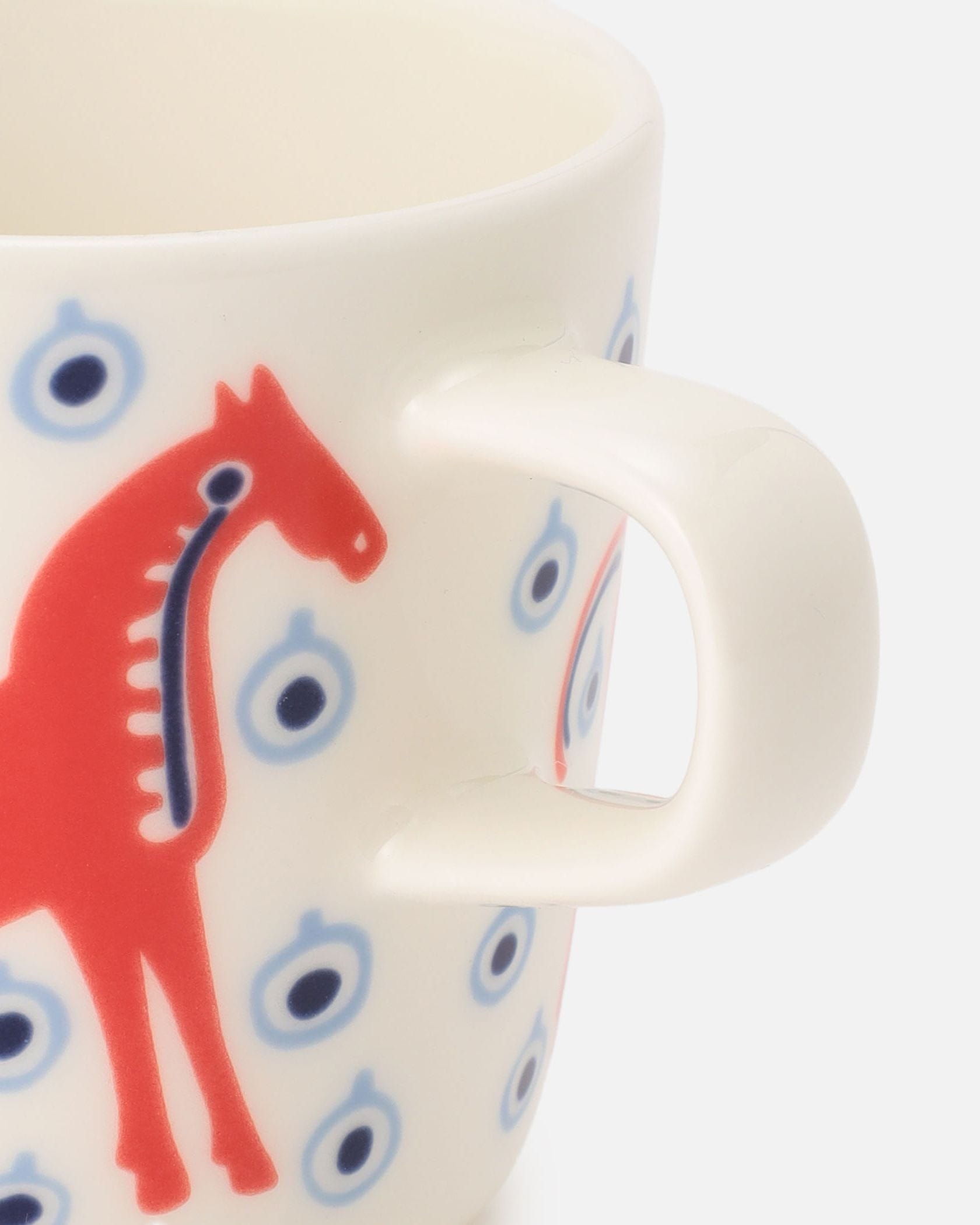 200ml容量でやや浅めのマグカップ。コーヒーや紅茶などの飲み物にはもちろん、食事の際のスープカップ、食後のデザートカップなどにも重宝します。グリップしやすいコンパクトな持ち手は、お年寄りから子供まで、家族みんなで使いやすいのも魅力です。“黒い牝馬”を意味する「Musta tamma」柄を、午年のお祝いにぜひお迎え入れください。