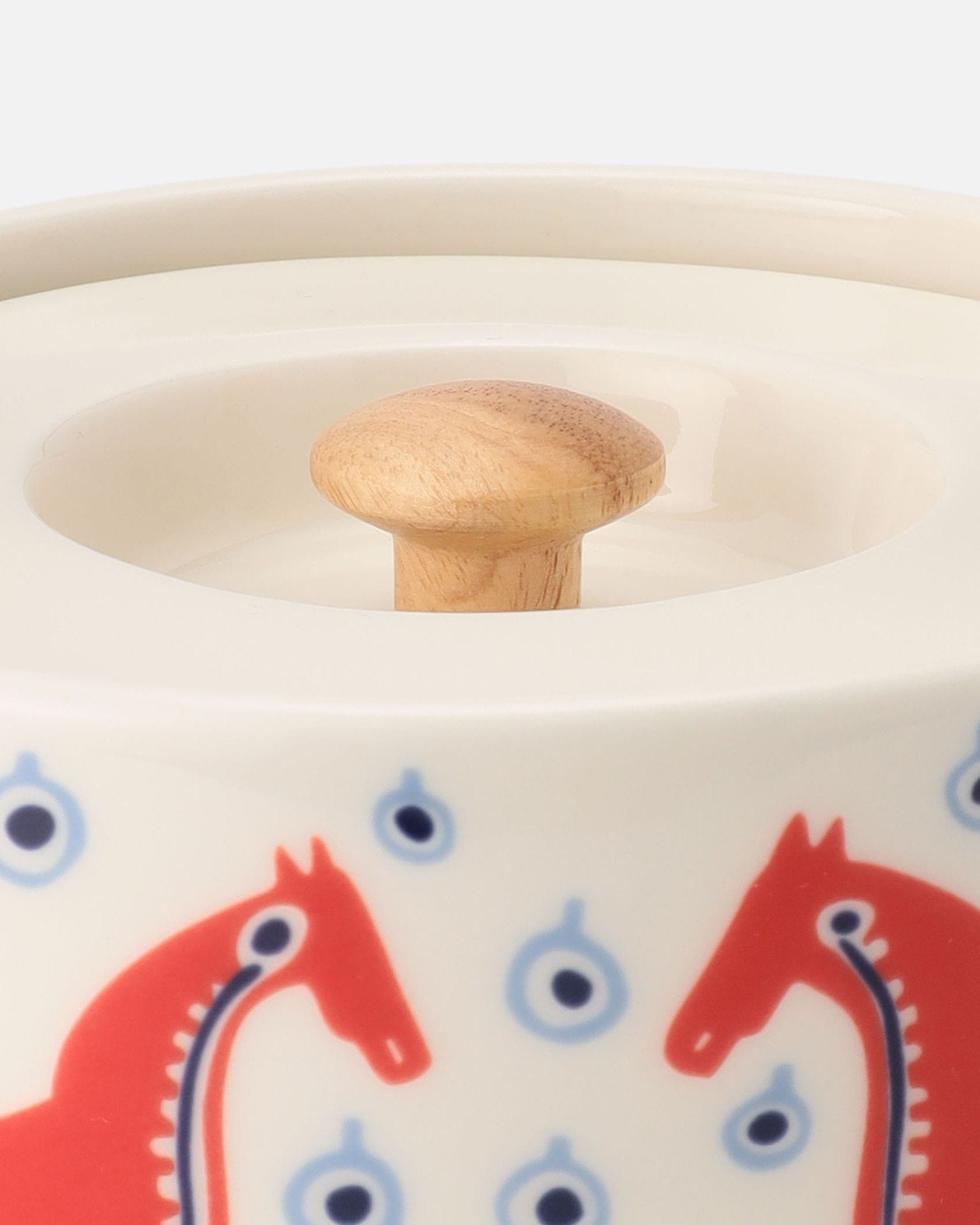 2026年の新年を、干支の午とともに祝う縁起の良いティーポット。木目のディテールなどに和のエッセンスがほんのり感じられ、日本茶をいただくときにも、ゲストへお茶を振る舞うときにもおすすめの一品です。ビビッドな馬の色合いが、テーブルを華やかに彩ります。底部には特別なメッセージ入りです。