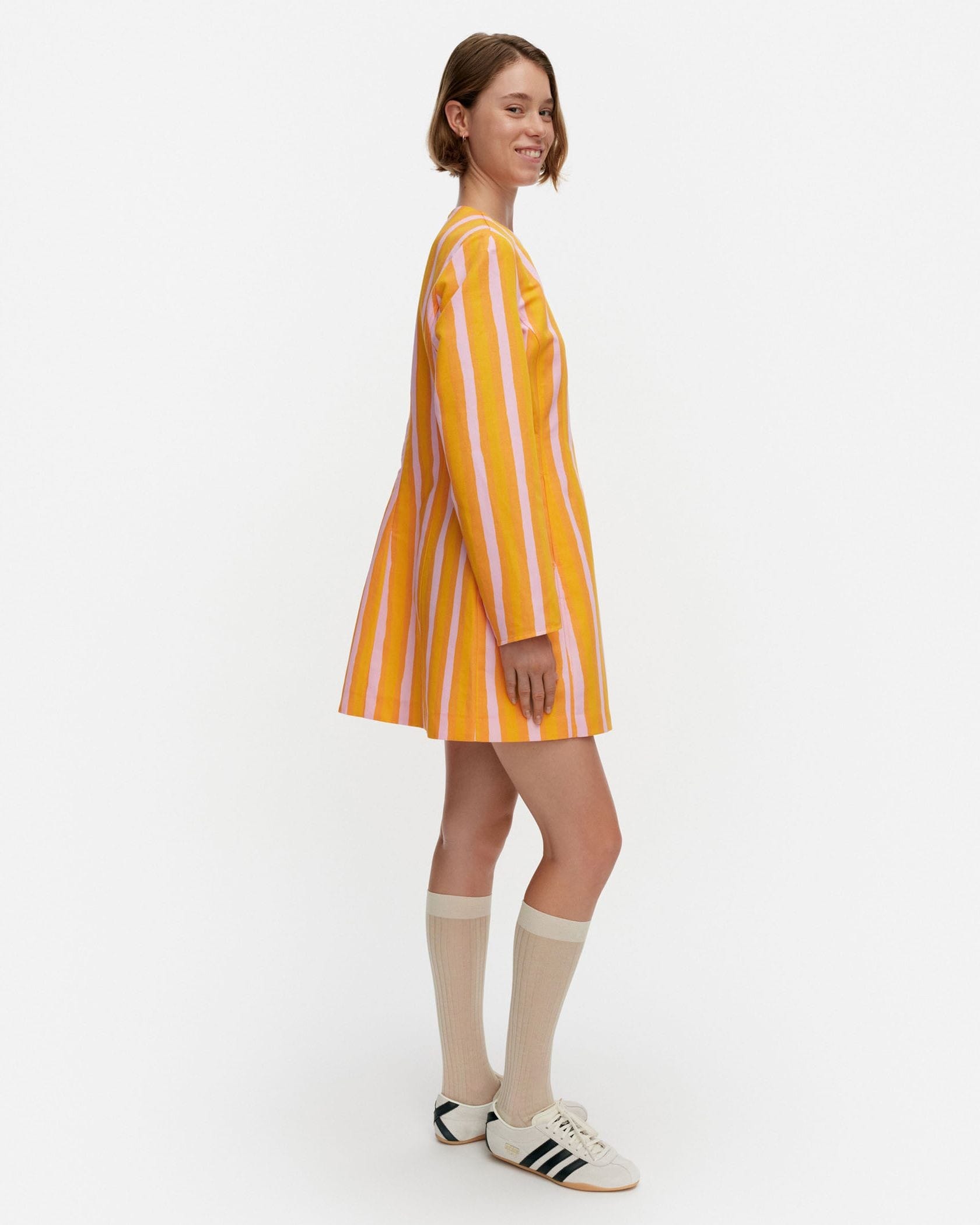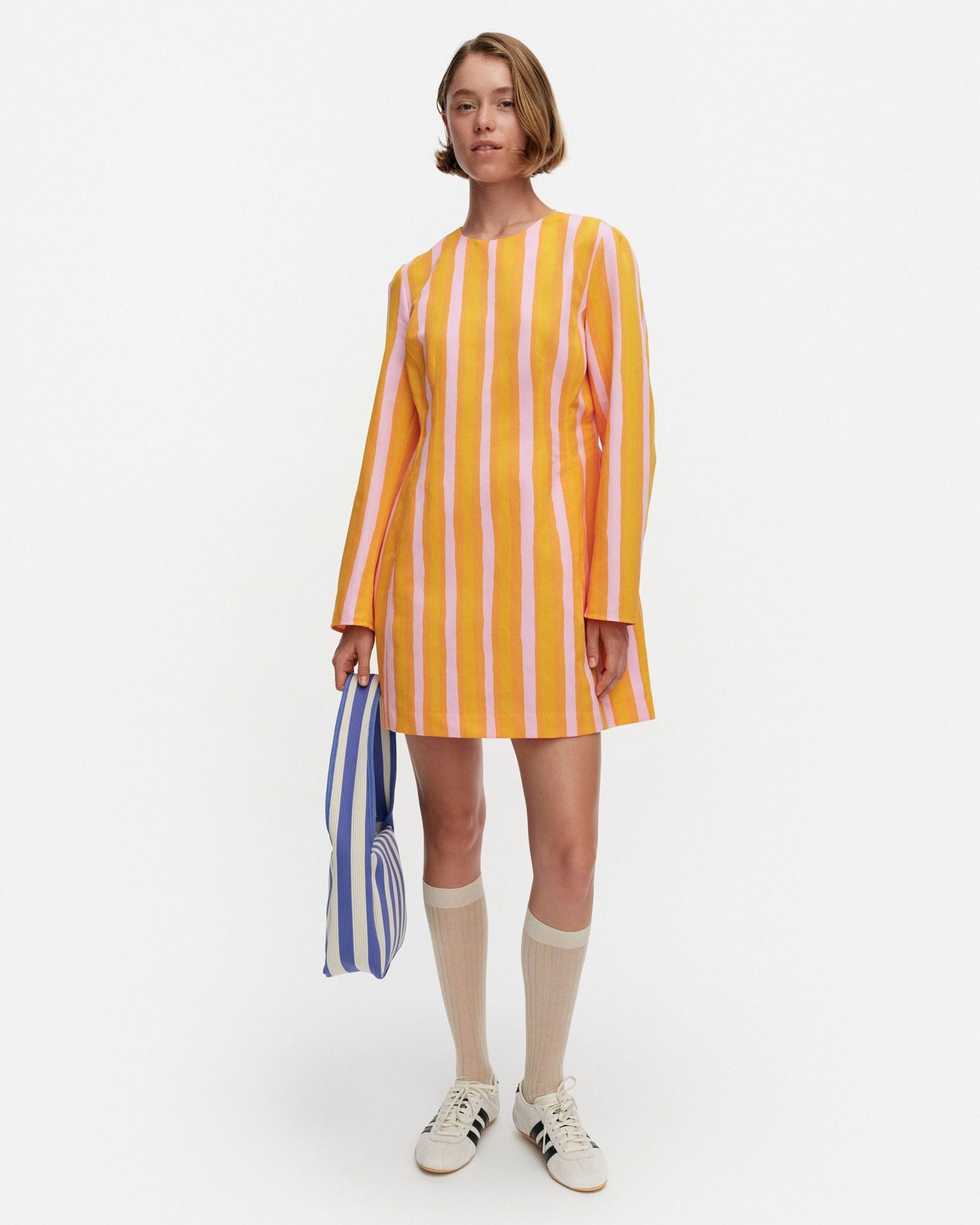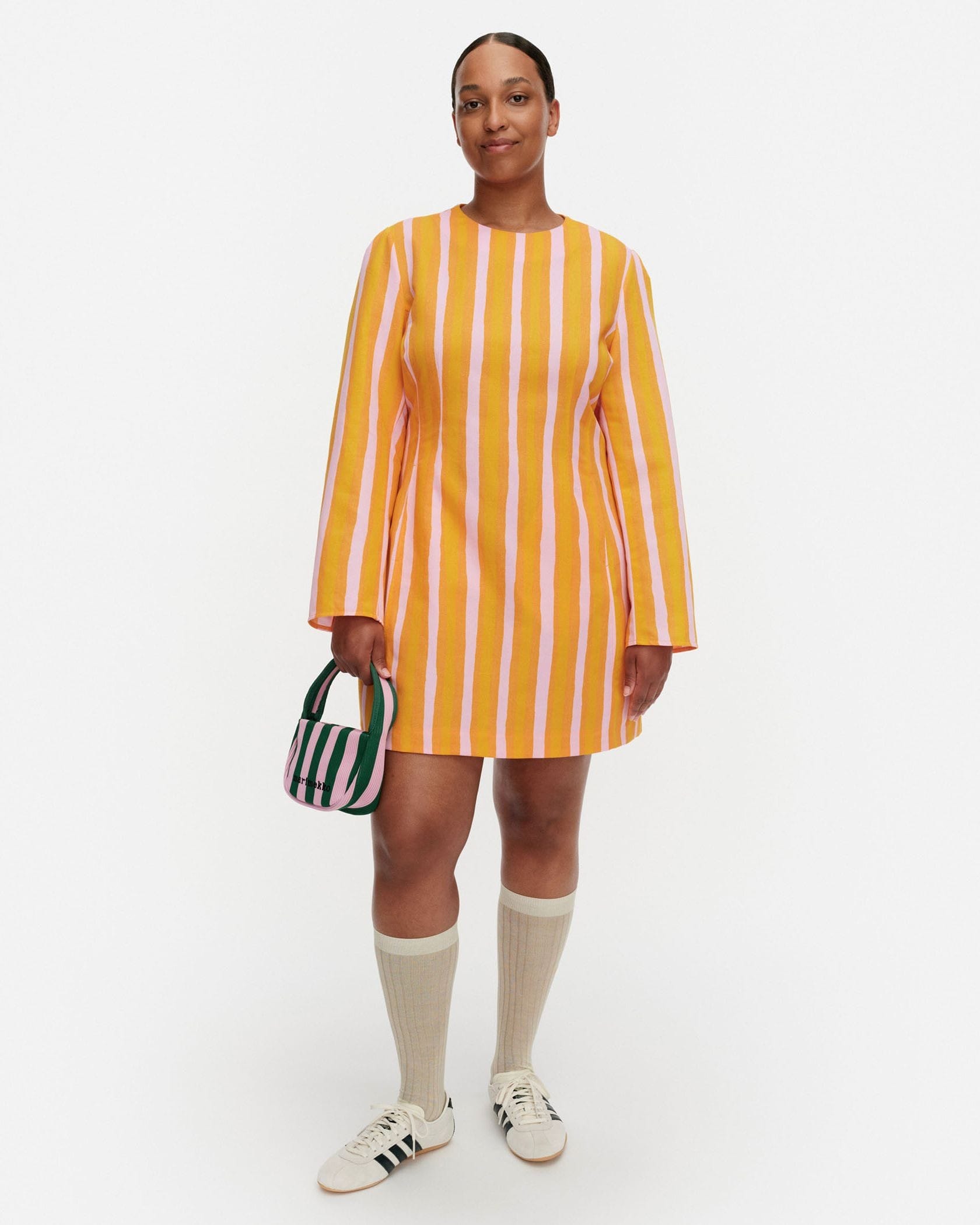 日常をドレスアップしてくれるIloinen Piccoloワンピースです。目が覚めるような鮮やかなストライプ柄が魅力、遠目にも存在感たっぷりにデザインしました。くびれコンシャスなウエストから広がる大人可愛く着られるミニ丈もポイント、ブーツやハイソックスとあわせるのもおすすめです。