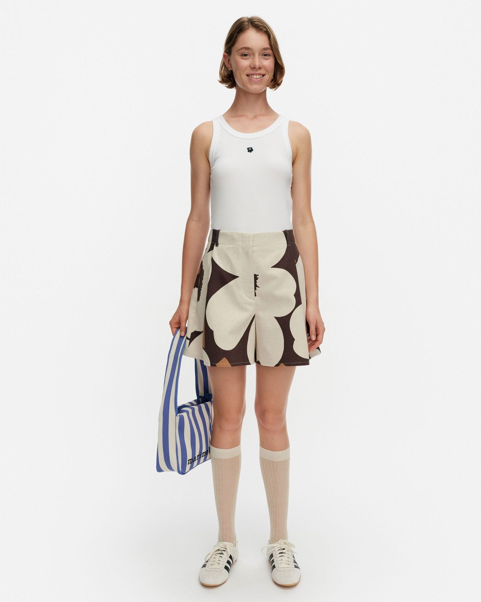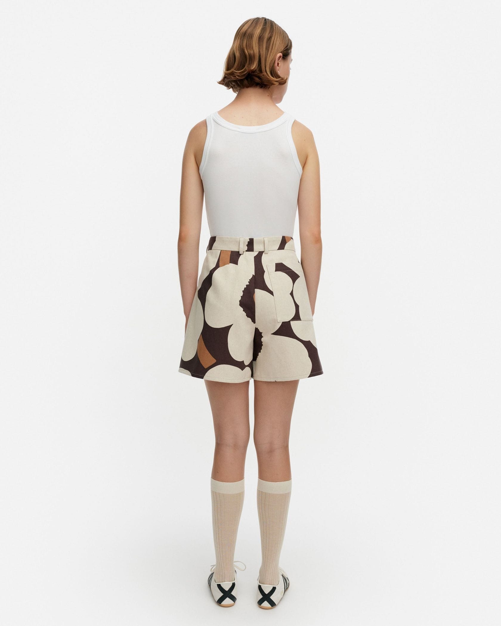 大きなUnikko柄が遠目にもアイキャッチな、Pruukat Unikkoショートパンツです。スカートライクに着られる女性らしいフレアシルエット、くびれコンシャスなハイウエスト仕様でトップスINもすっきりと決まります。同柄のオーバーシャツとあわせたセットアップスタイルもおすすめです。