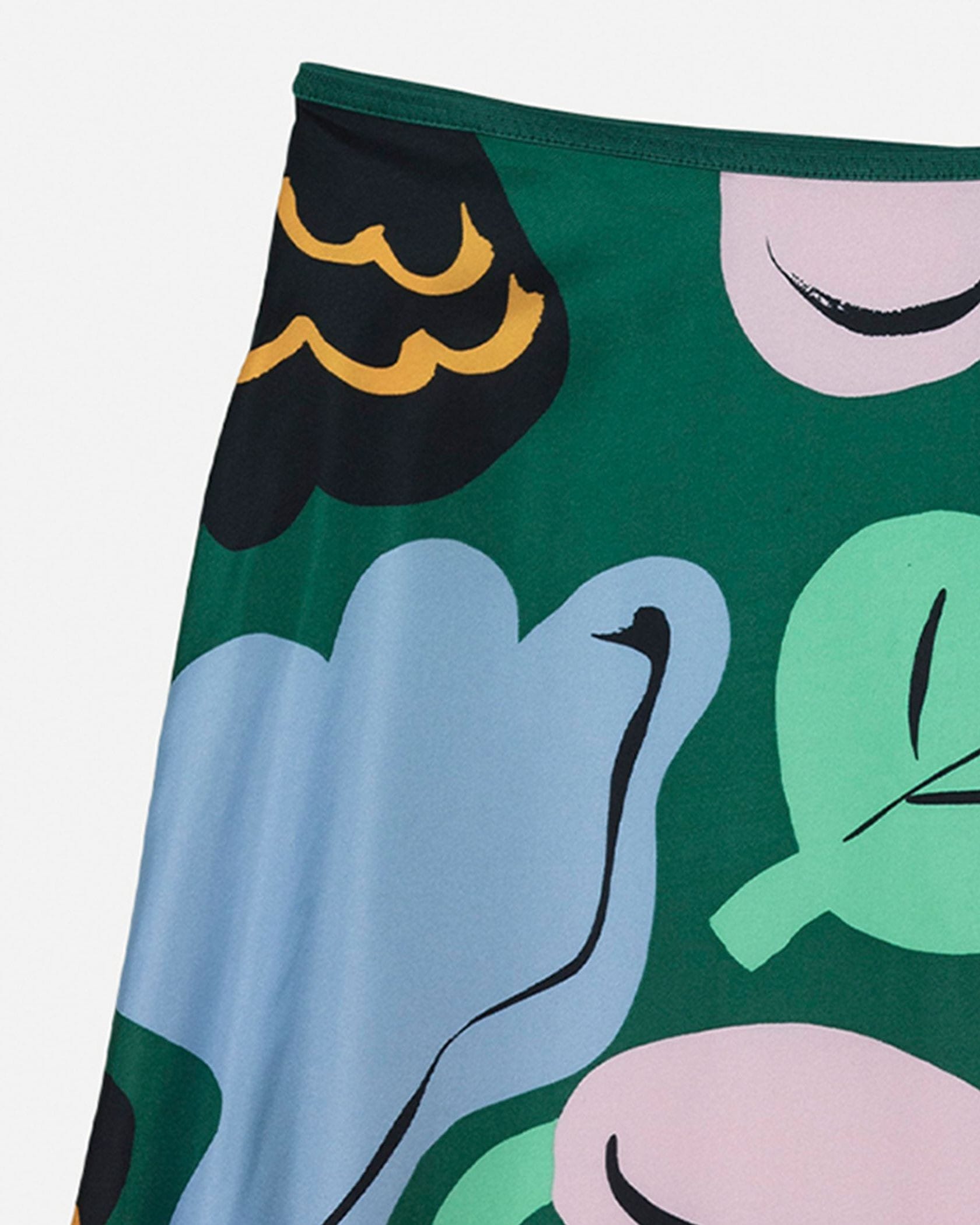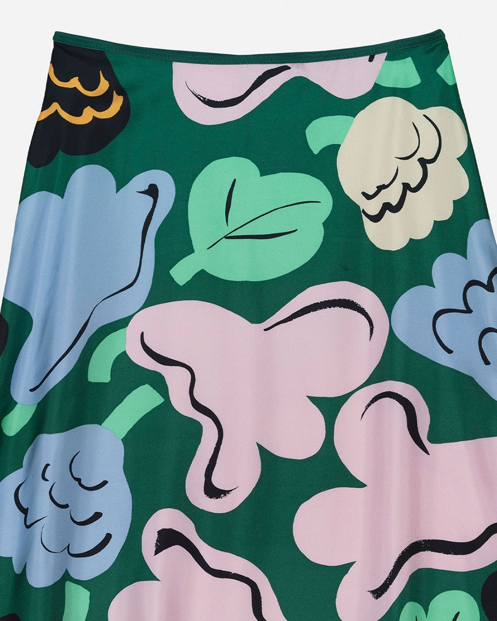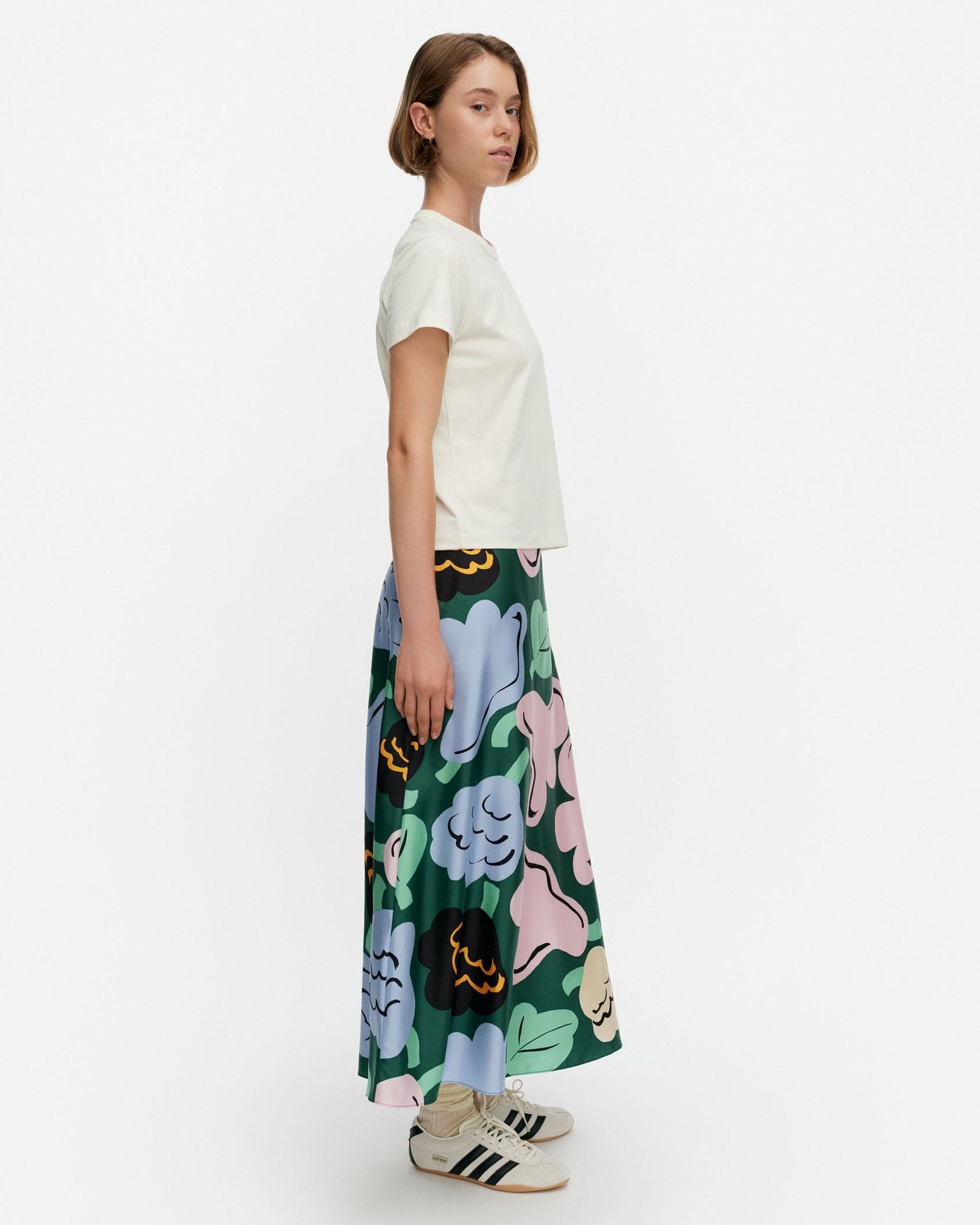 遠目にも鮮やかなKoostumus Kukasta Kukkaanスカートです。色彩豊かなプリント柄がコーデに華やかさをプラス、いつもの着こなしをドレスアップしてくれます。動きにあわせてふんわり揺れる素材感とフレアシルエットもポイント、手持ちのTシャツとあわせたカジュアルスタイルもおすすめです。