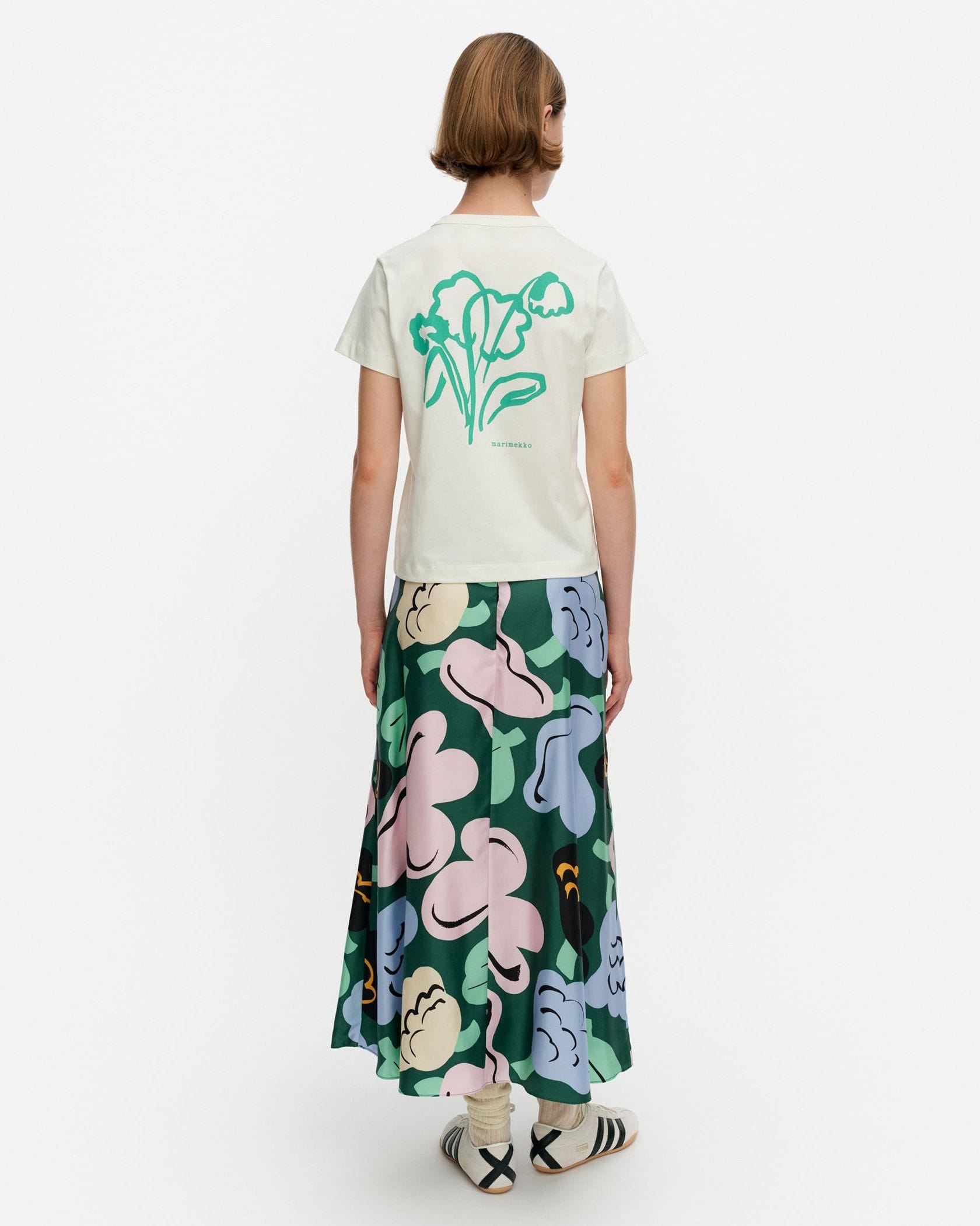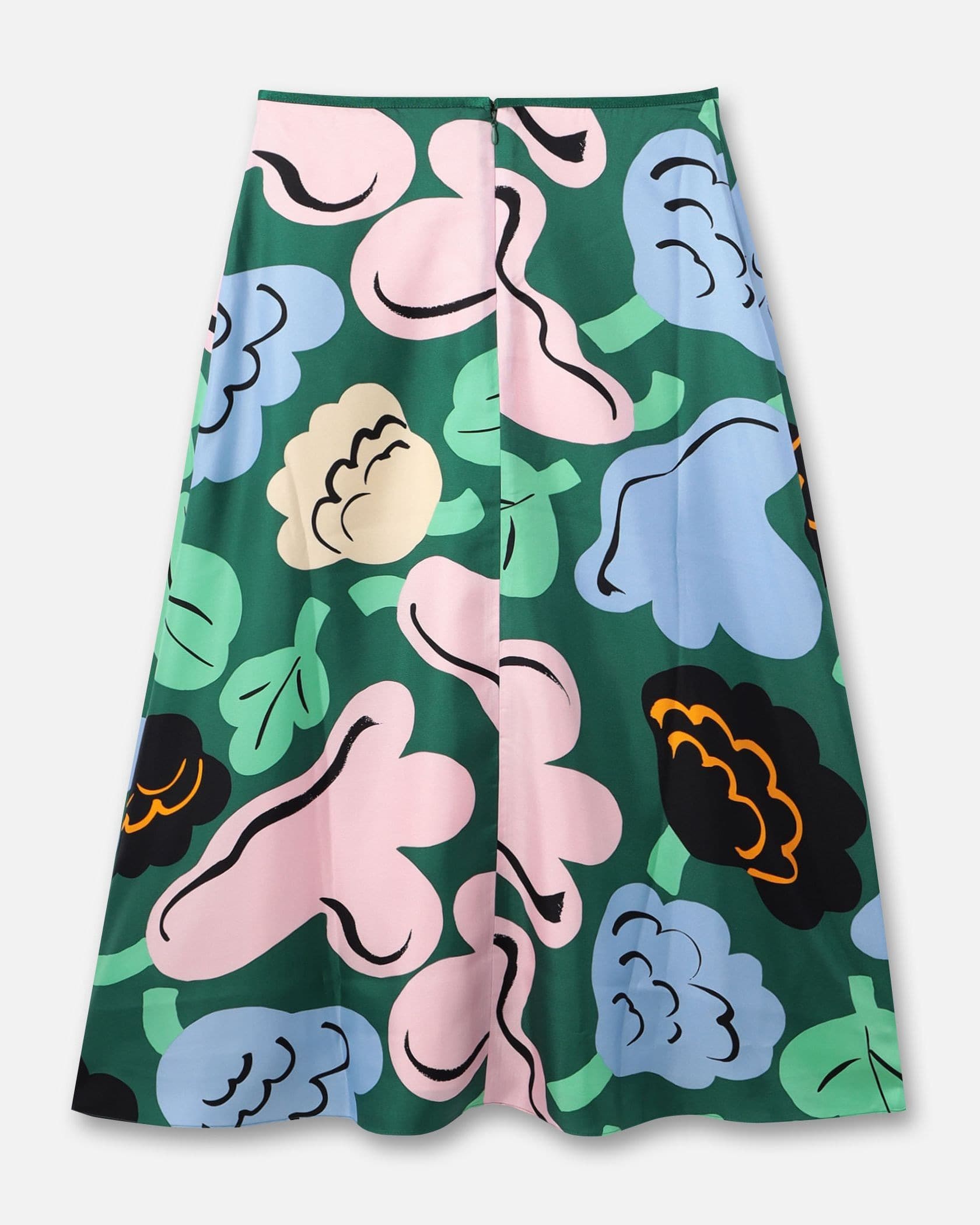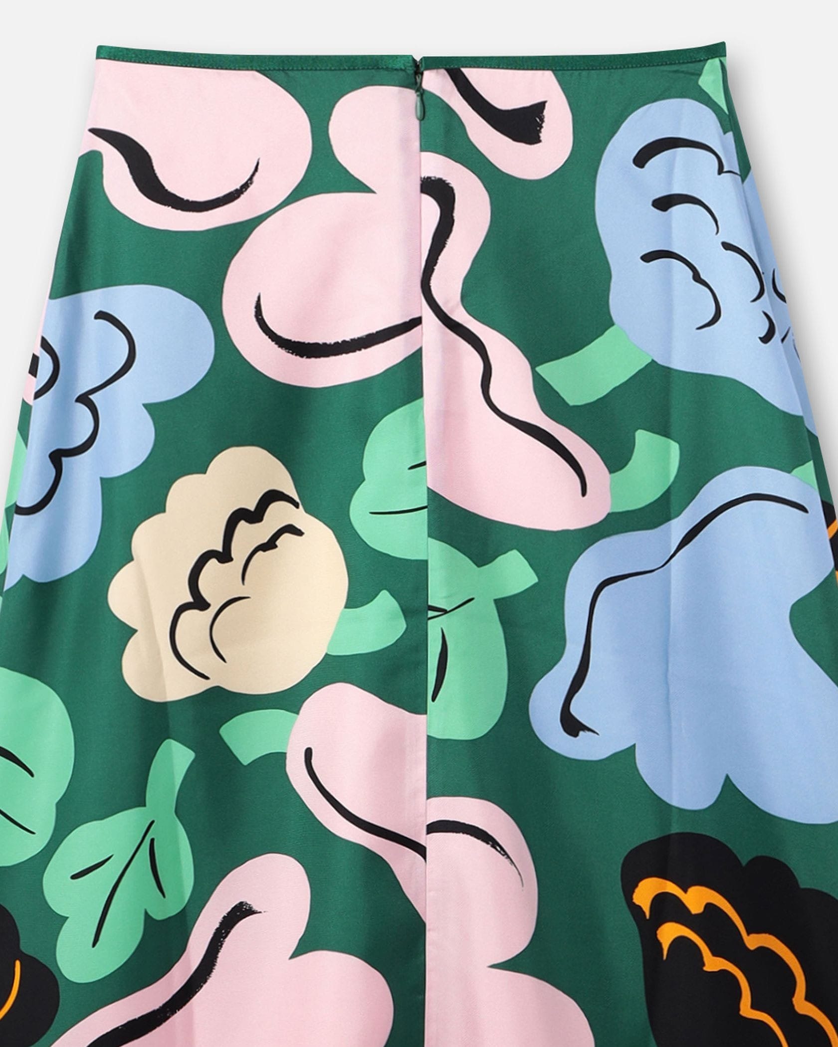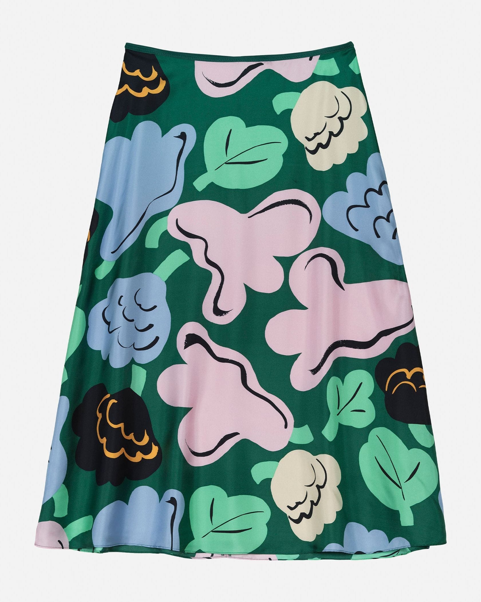 遠目にも鮮やかなKoostumus Kukasta Kukkaanスカートです。色彩豊かなプリント柄がコーデに華やかさをプラス、いつもの着こなしをドレスアップしてくれます。動きにあわせてふんわり揺れる素材感とフレアシルエットもポイント、手持ちのTシャツとあわせたカジュアルスタイルもおすすめです。
