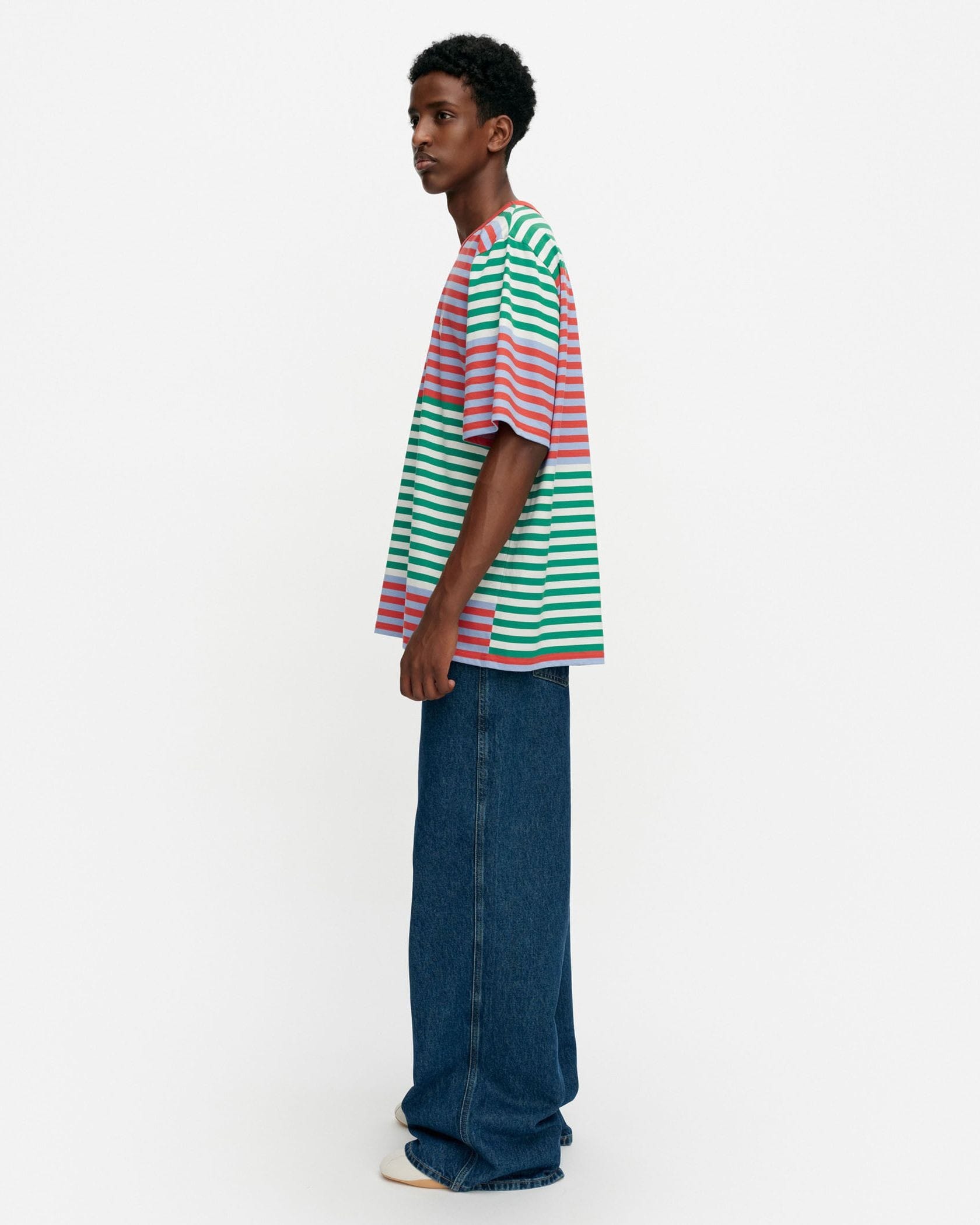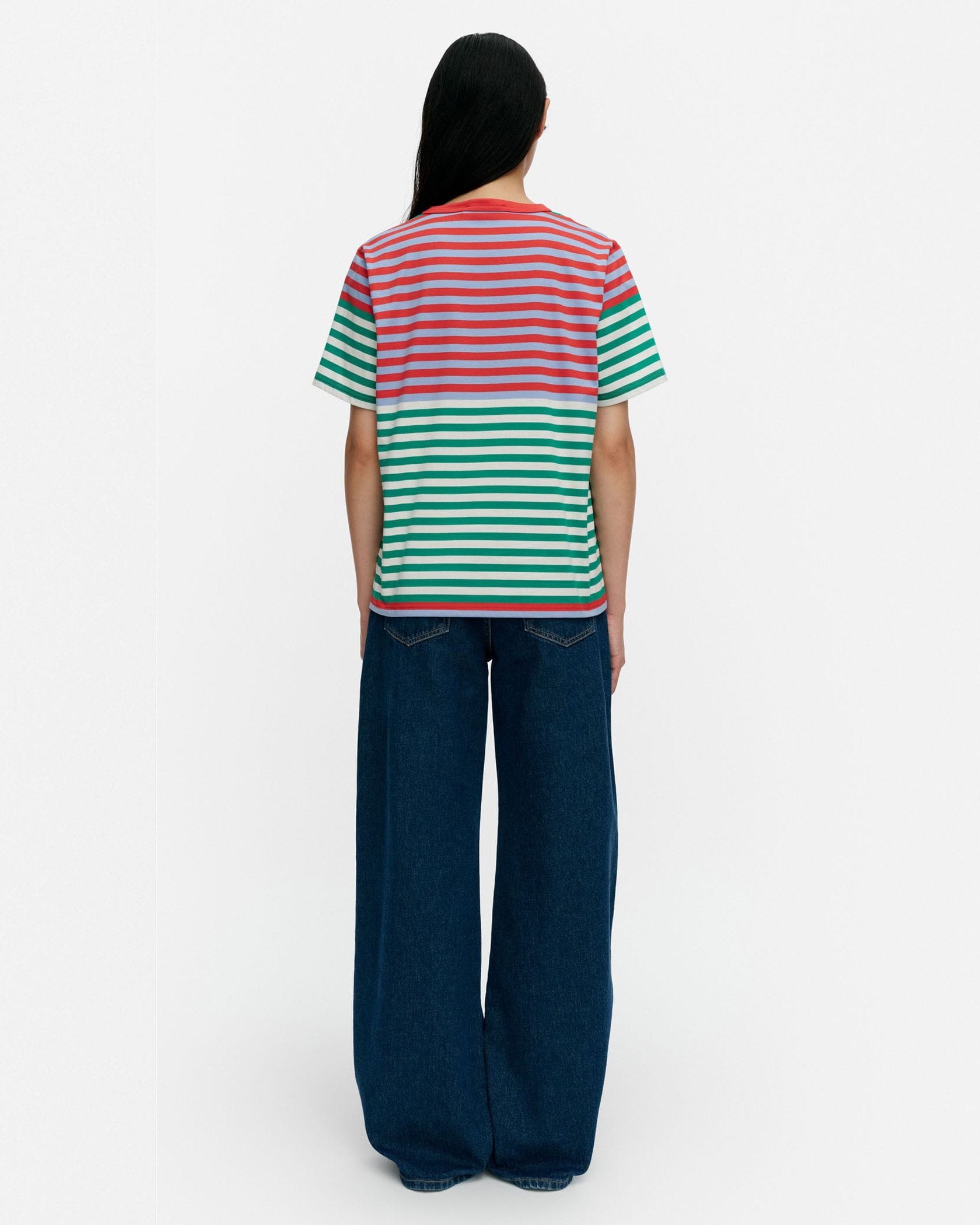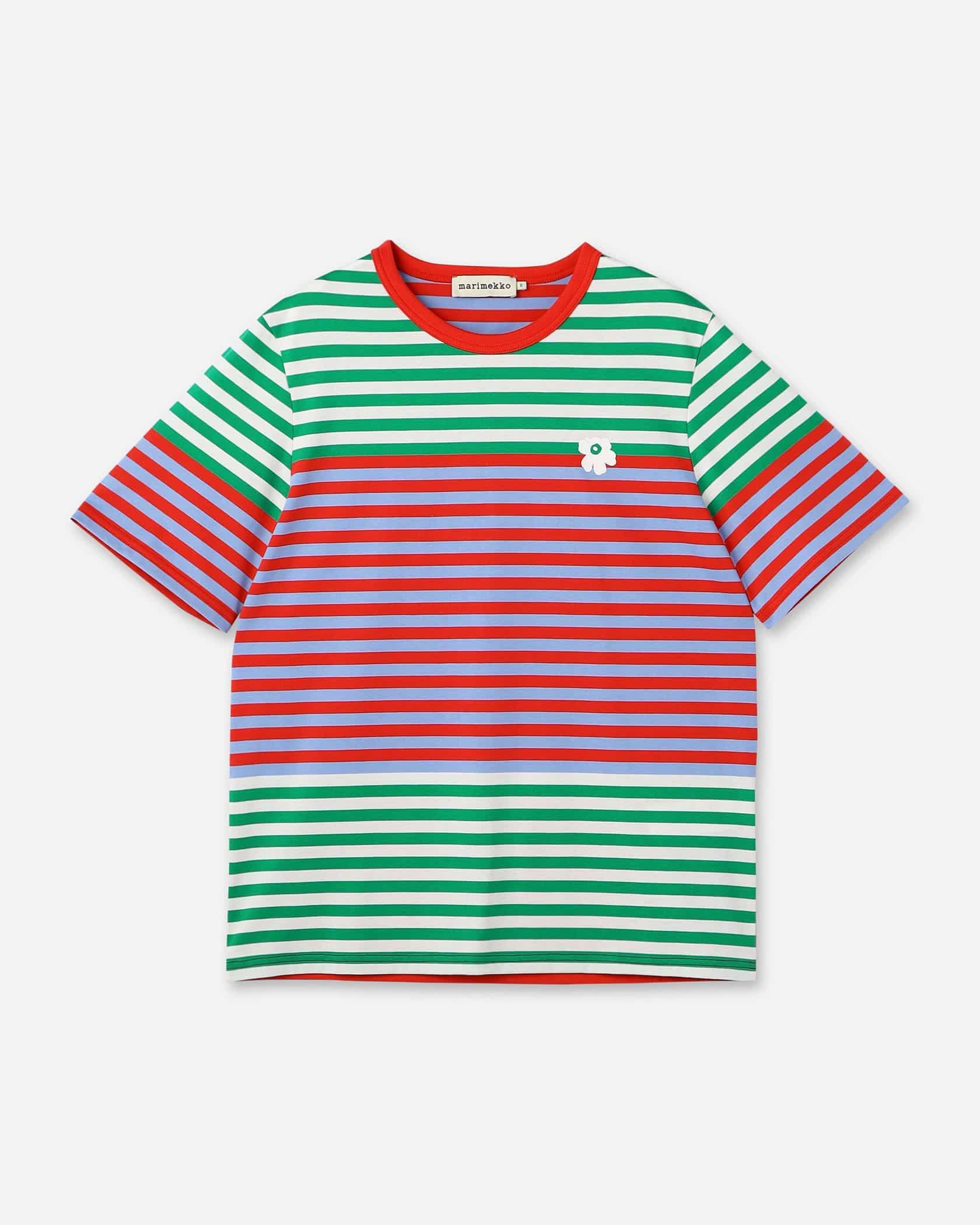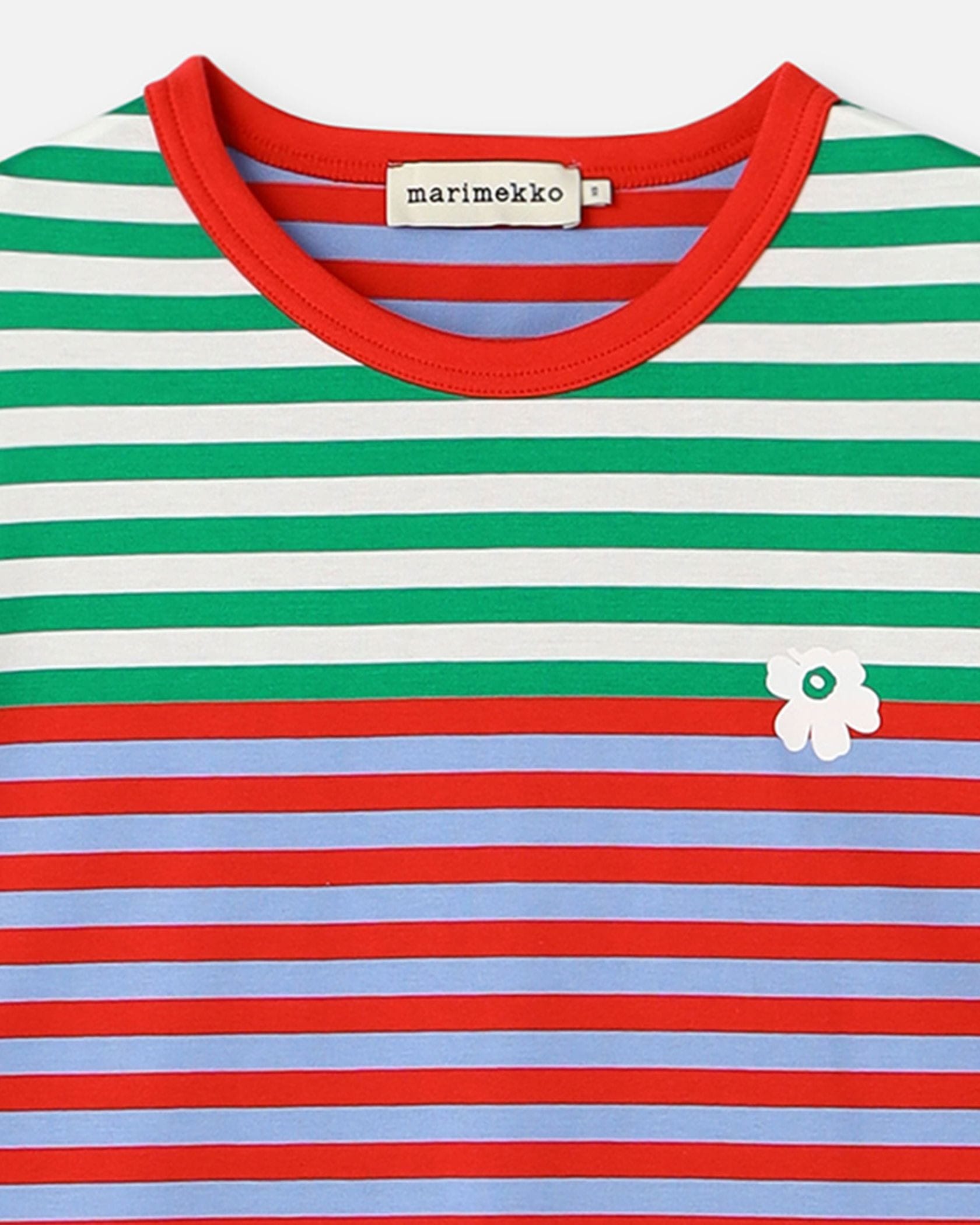 Marimekkoを代表する横縞と花モチーフを組み合わせたTasaraita Unikko柄のクルーネックTシャツ。モダンなマルチカラーデザインで、コーディネートの主役として活躍します。胸元にはお馴染みの花モチーフを配置。ソフトなコットン素材、かつリラックス感のあるシルエットで着心地も快適です。