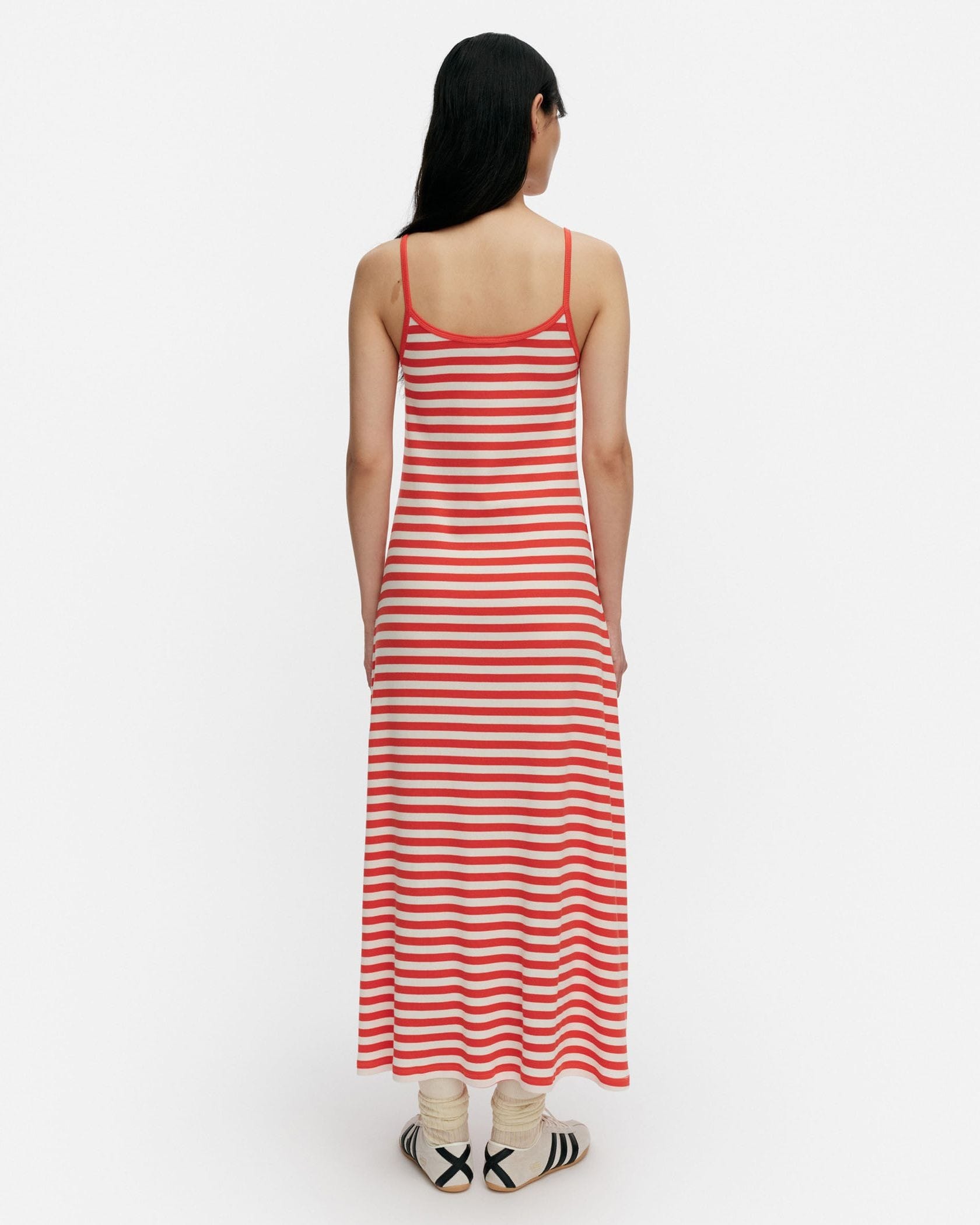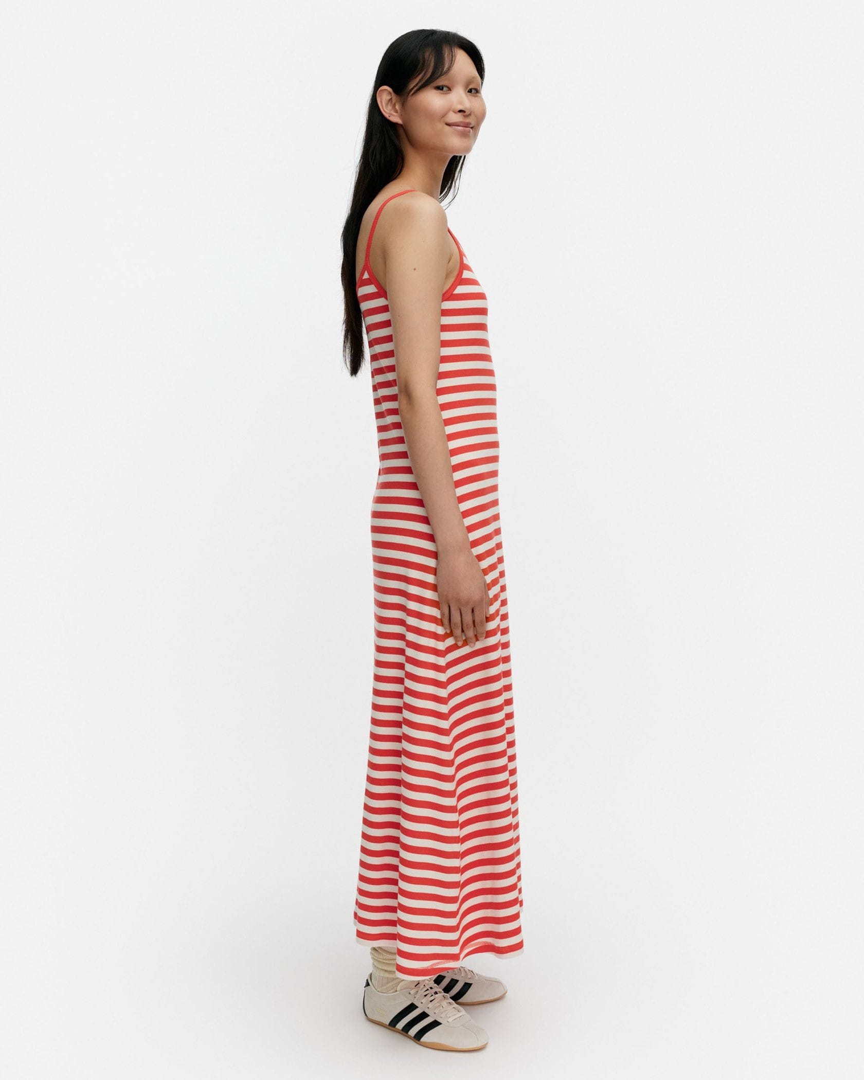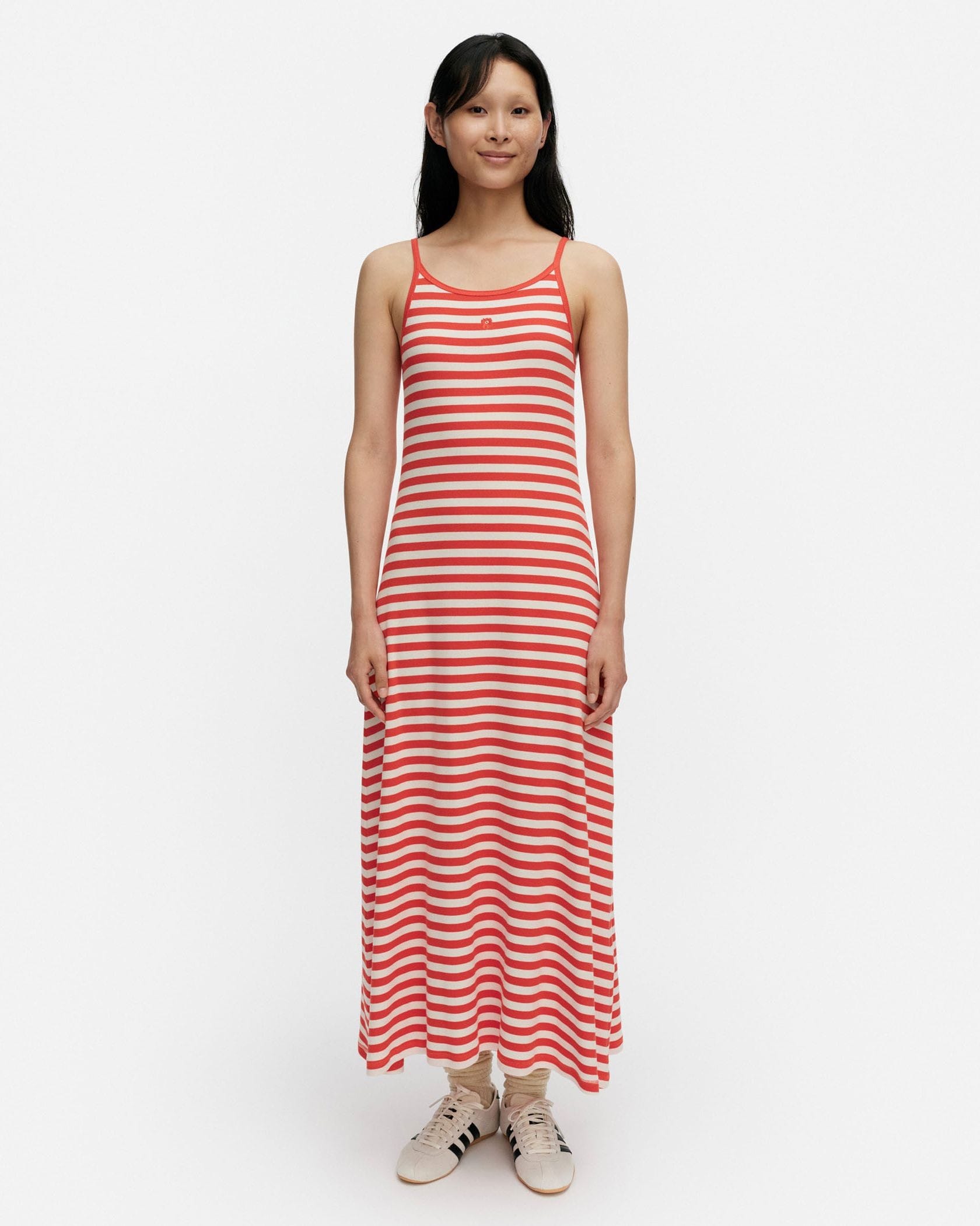 Marimekkoを代表する横縞と花モチーフを組み合わせたTasaraita Unikko柄のキャミソールワンピース。ソフトでフィット感のあるリブ生地を用い、裾に向かって広がるフレアシルエットに仕上げています。フロントの小さな花刺繍がワンポイント。街中はもちろん、ビーチやレジャーシーンにも映える一枚です。