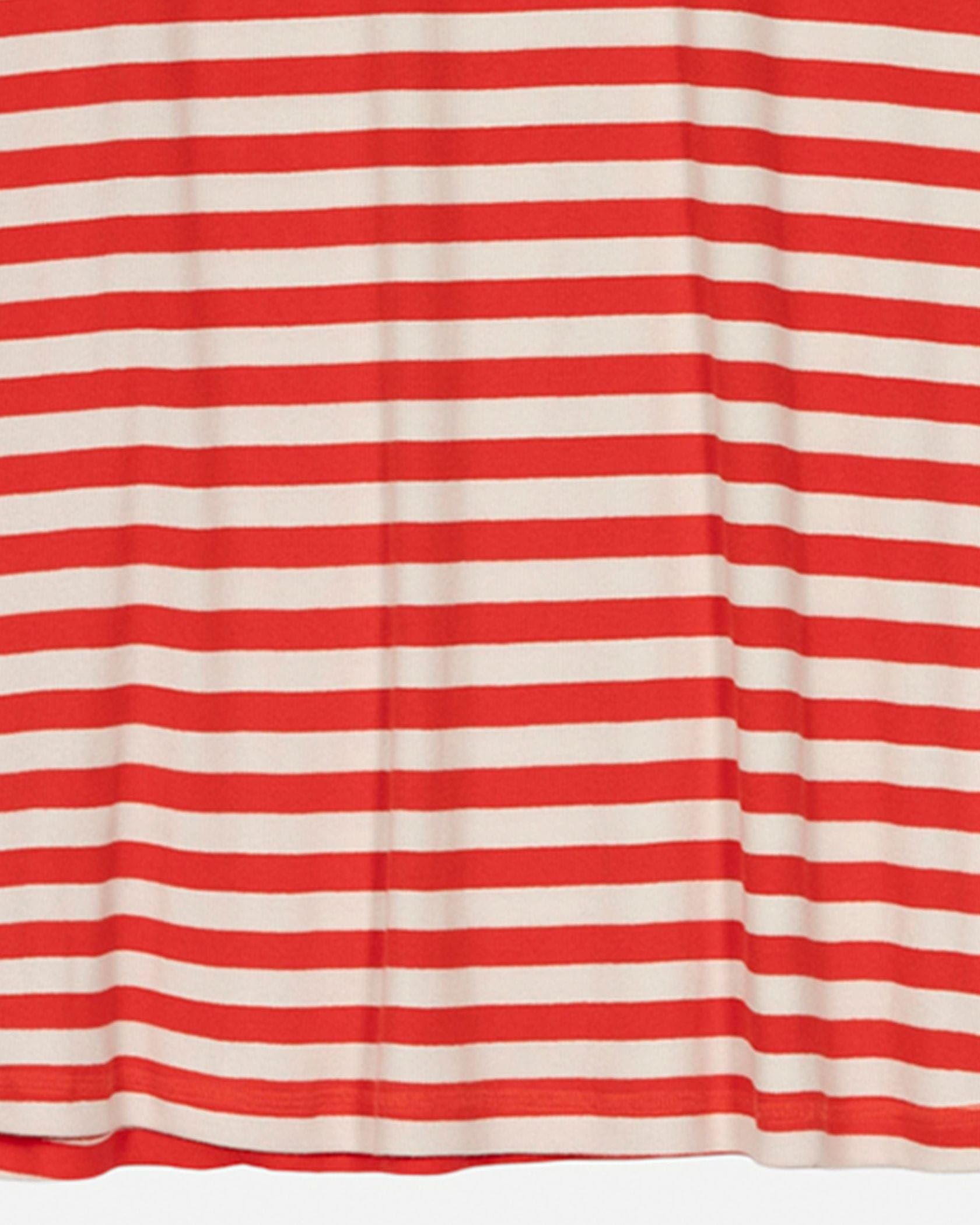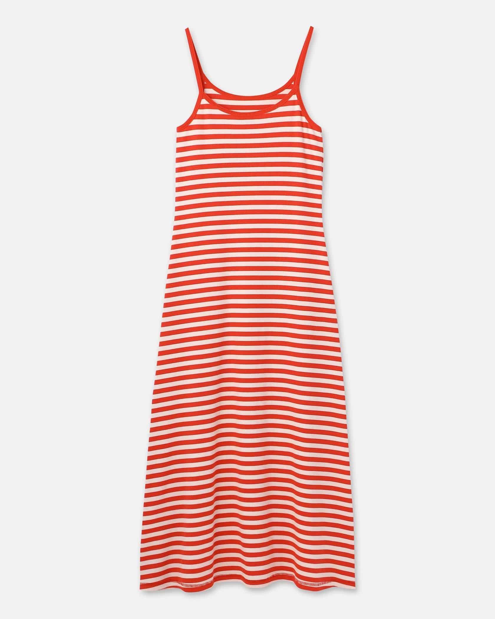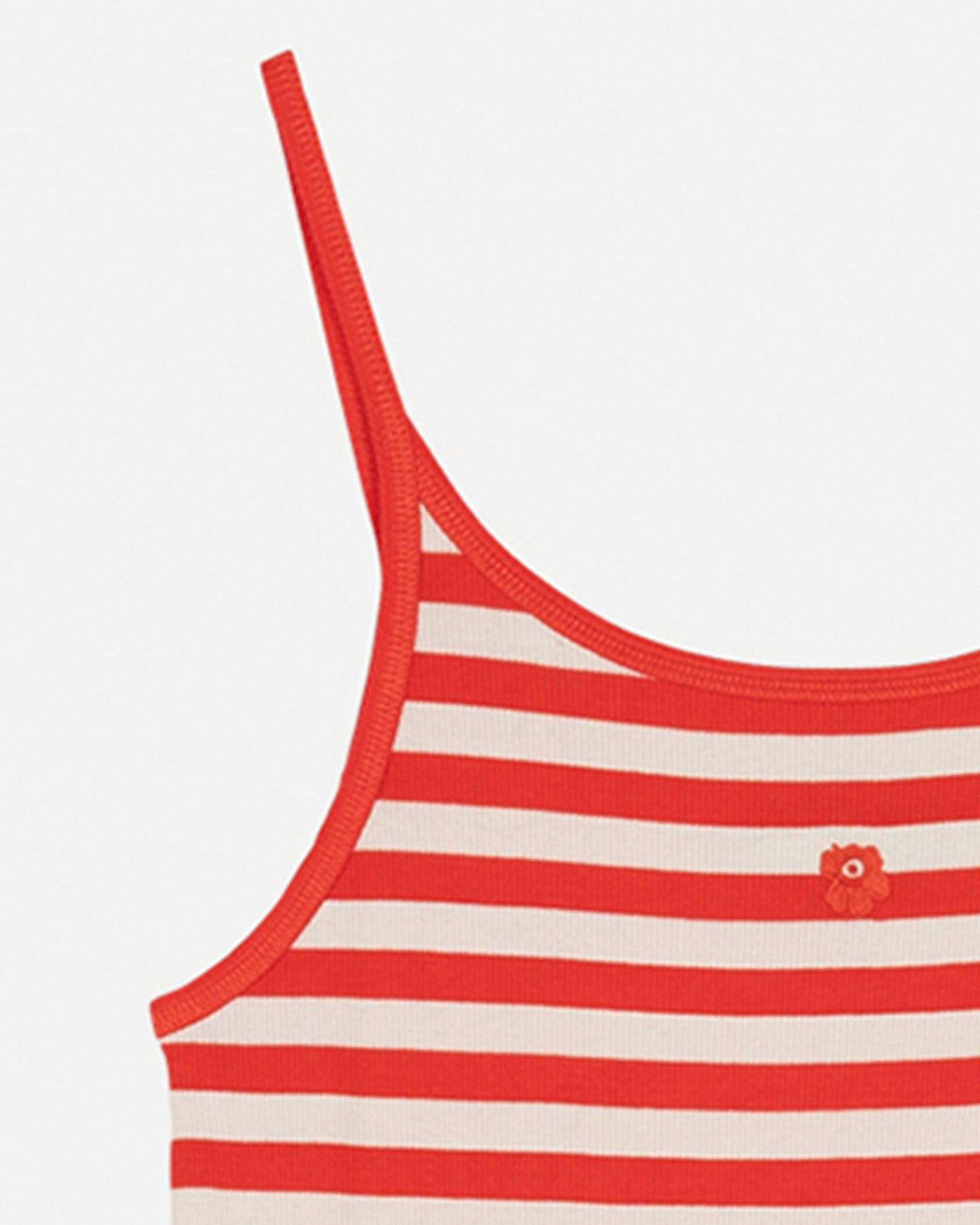 Marimekkoを代表する横縞と花モチーフを組み合わせたTasaraita Unikko柄のキャミソールワンピース。ソフトでフィット感のあるリブ生地を用い、裾に向かって広がるフレアシルエットに仕上げています。フロントの小さな花刺繍がワンポイント。街中はもちろん、ビーチやレジャーシーンにも映える一枚です。