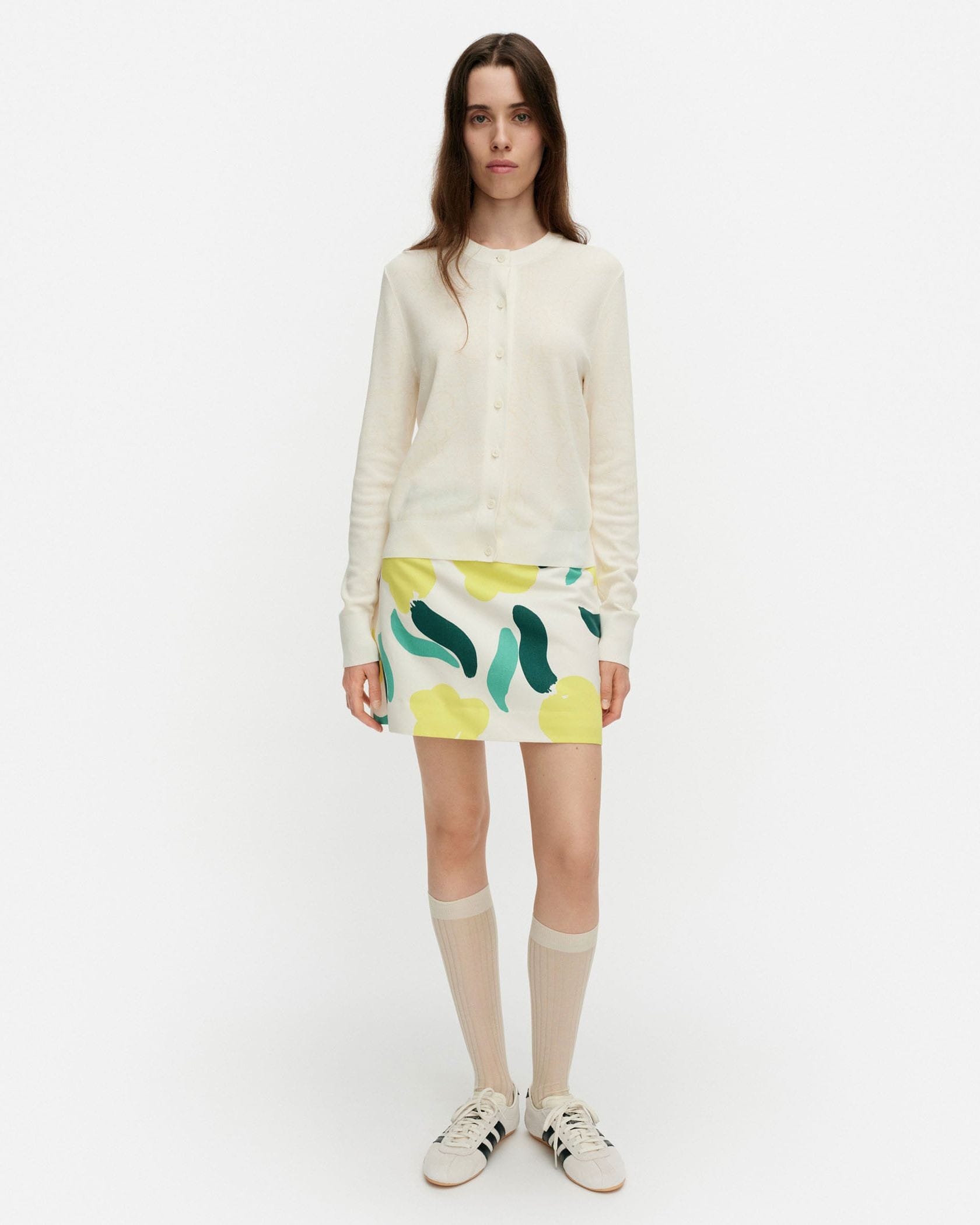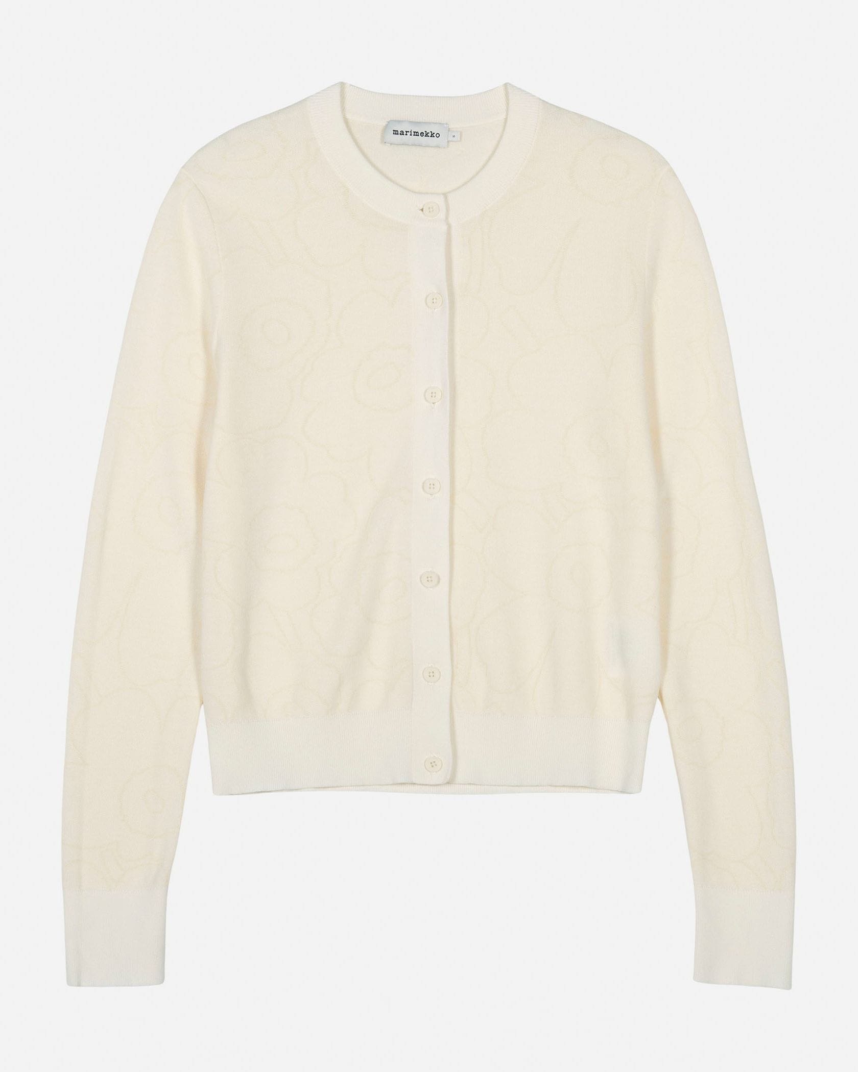 ジャカード編みのUnikko柄が華やかなニットカーディガン。袖口と裾の細めのリブ編み、ストレートなシルエットが特徴。コットン100%で仕立てた、春夏シーズンに最適な生地感。フロントボタンが首元まであるので、トップスとして着こなすことも可能。いつもの着こなしにプラスしてエレガントなスタイリングが完成します。