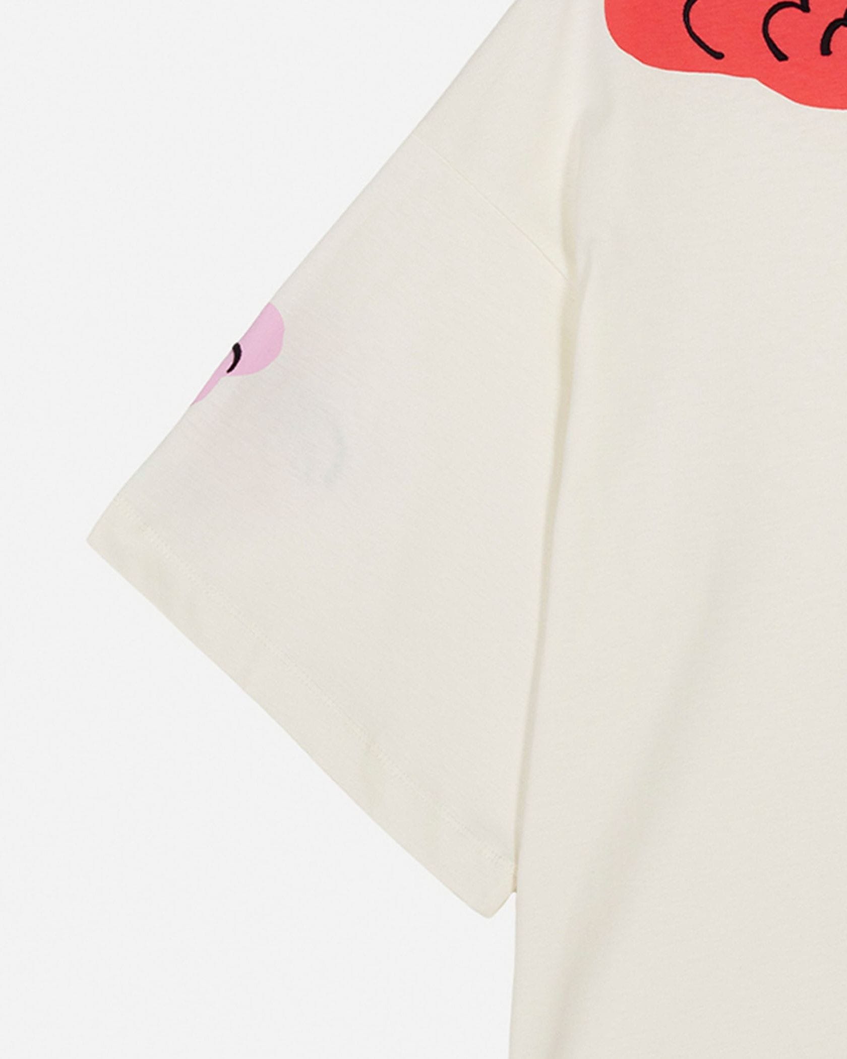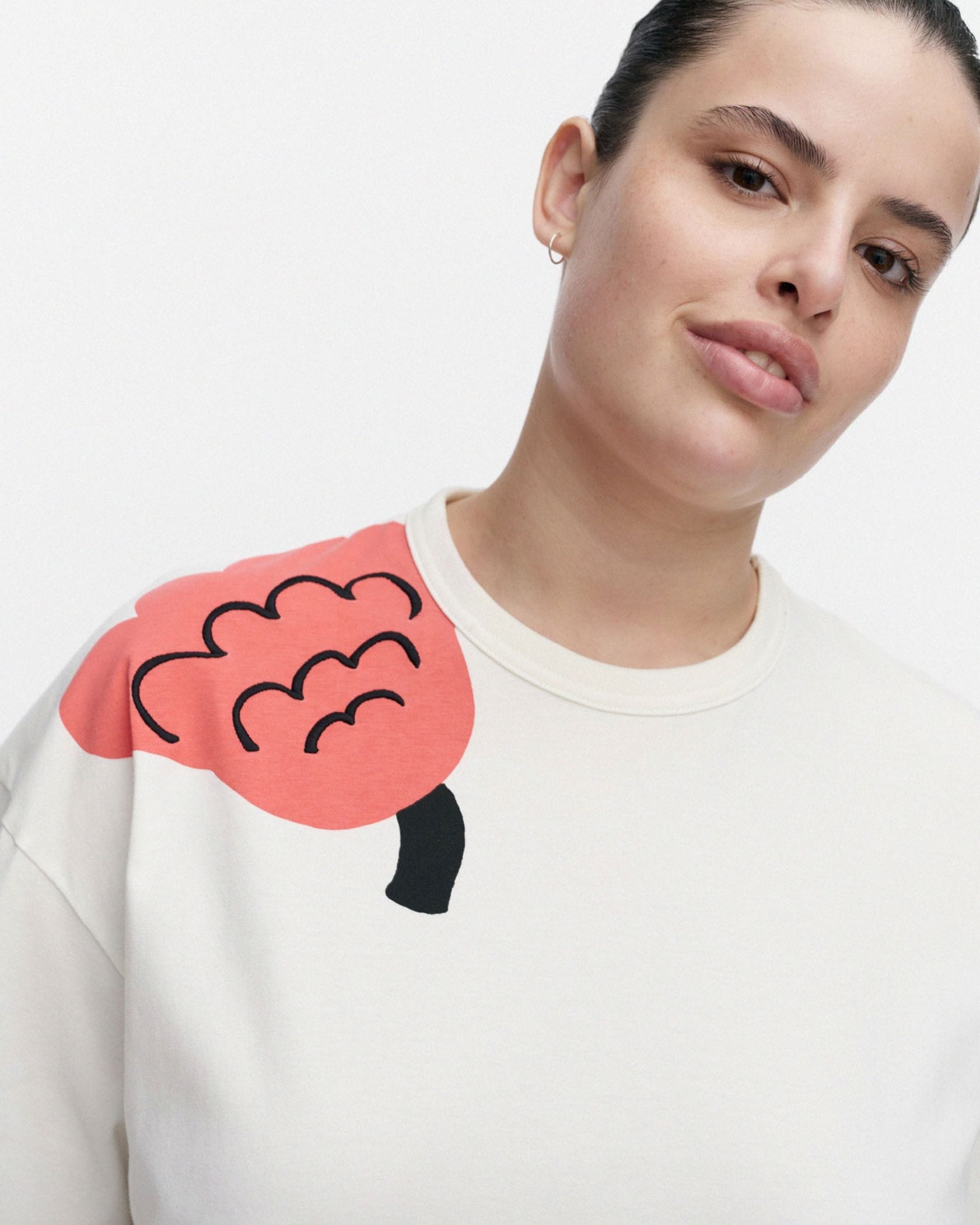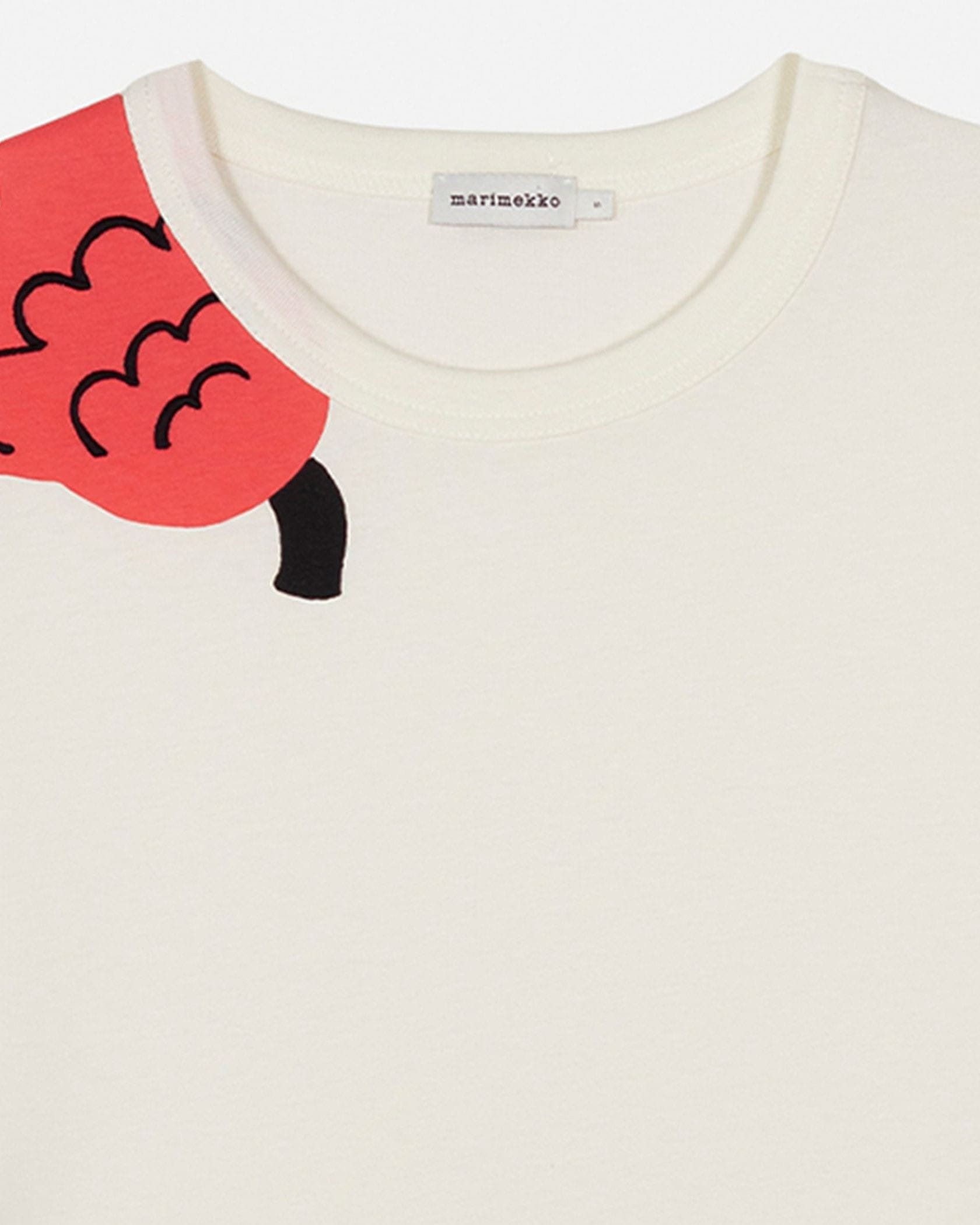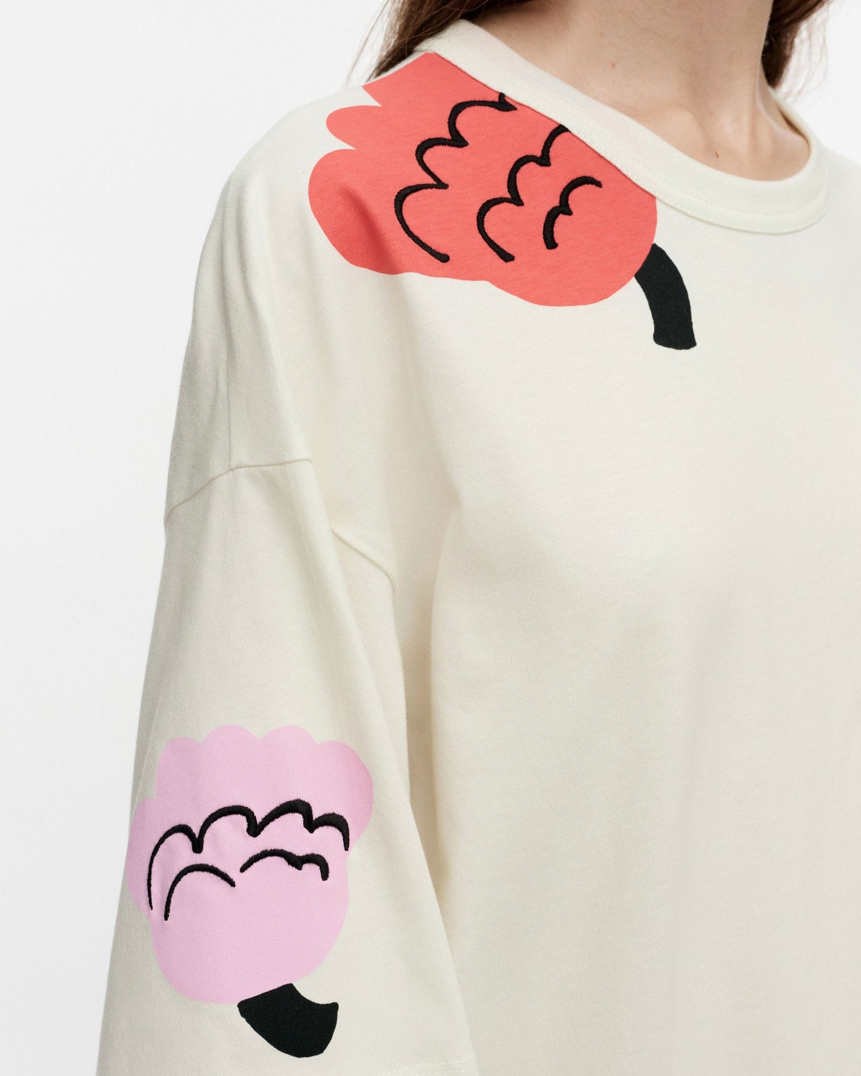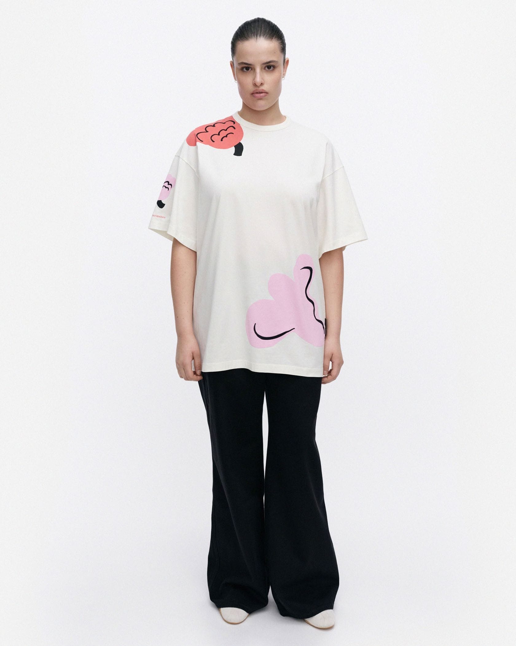 見る角度によって色んな表情が楽しめるPuhua Kukasta KukkaanTシャツです。肩や袖、裾部分などにあしらわれたプリント柄で、大人の遊び心あふれるデザインに仕上げました。ラフに着られるオーバーサイズのシルエットもポイント、そのまま着流すのはもちろんボトムINしたスタイリングもおすすめです。