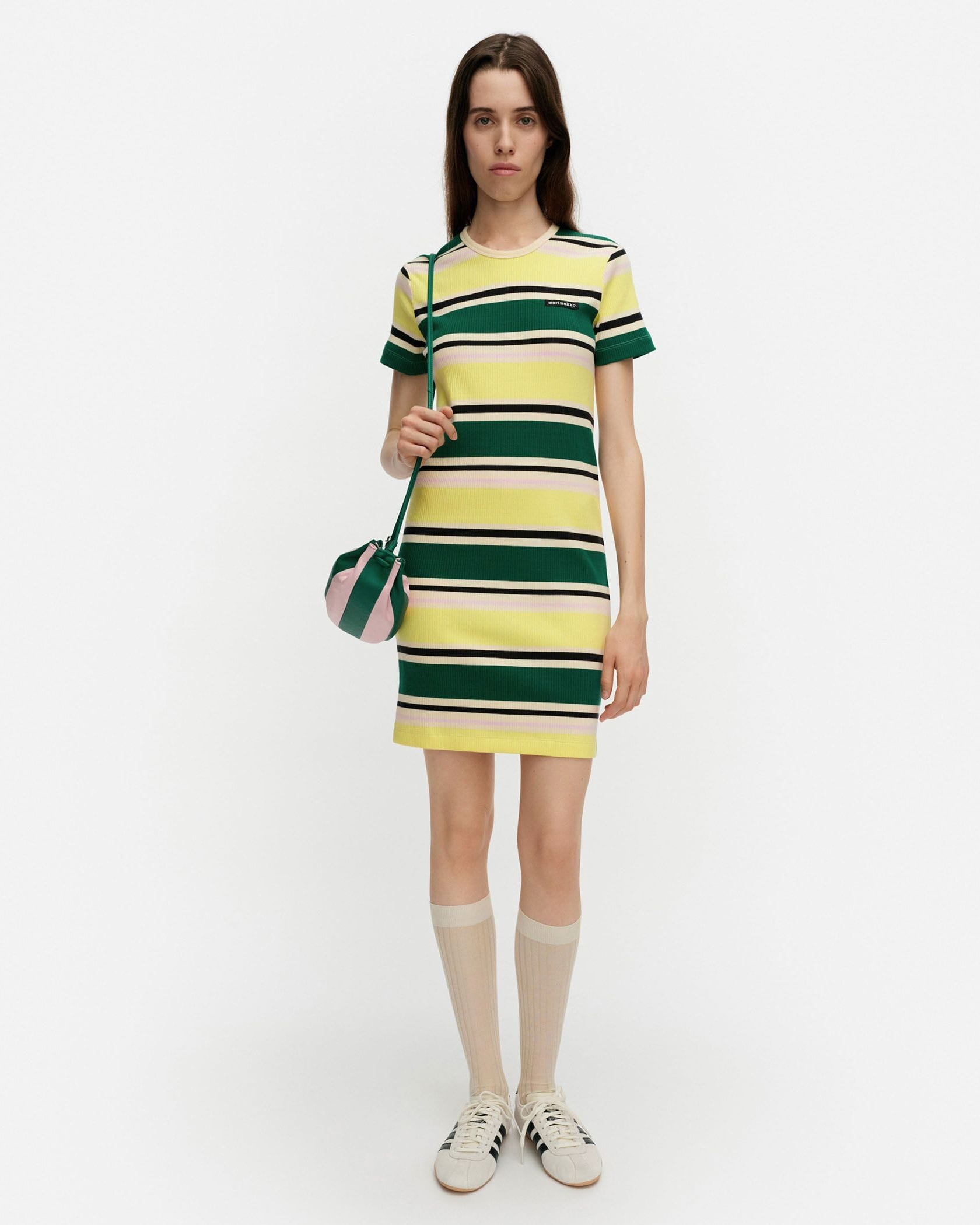 「ストライプ」を意味するHelvi(ヘルヴィ)柄のオンラインストア限定ワンピース。明るい色合いのマルチボーダー柄がインパクトを発揮します。膝上のミニ丈で、程よくボディに寄り沿うシルエット。ハイソックスやスニーカーを合わせて、スポーティに着こなすのがおすすめです。ブランドロゴのワンポイント入り。