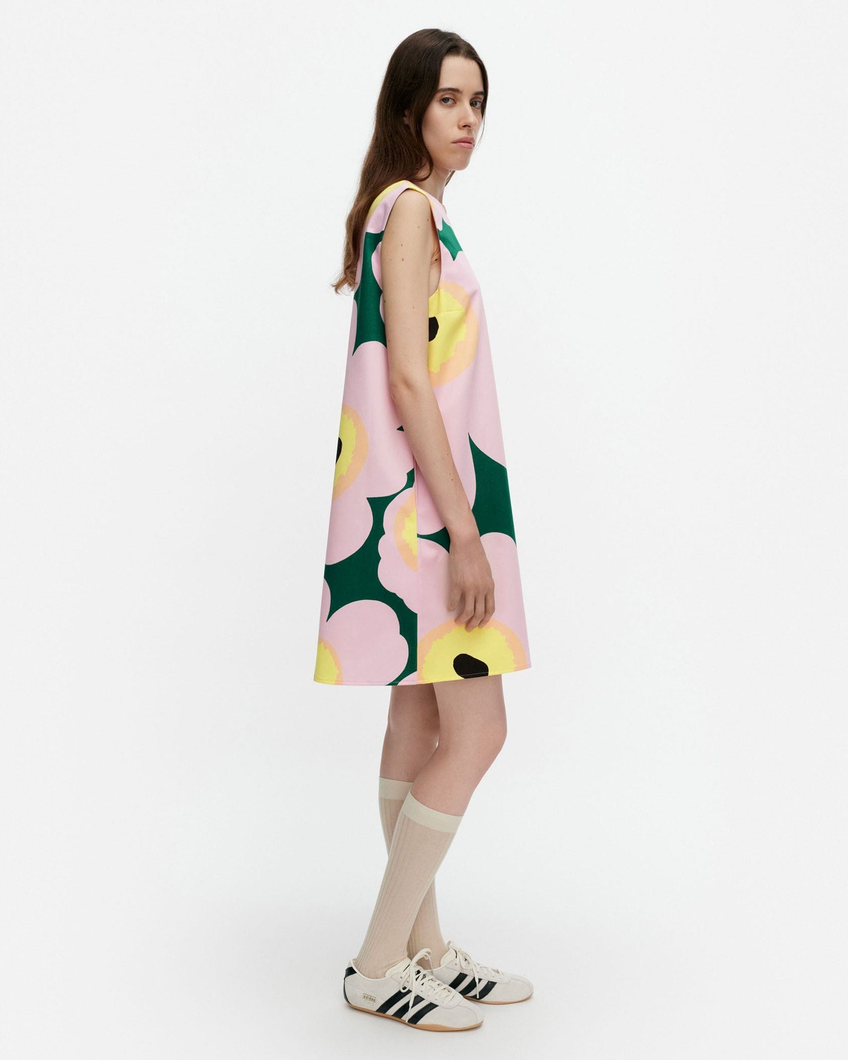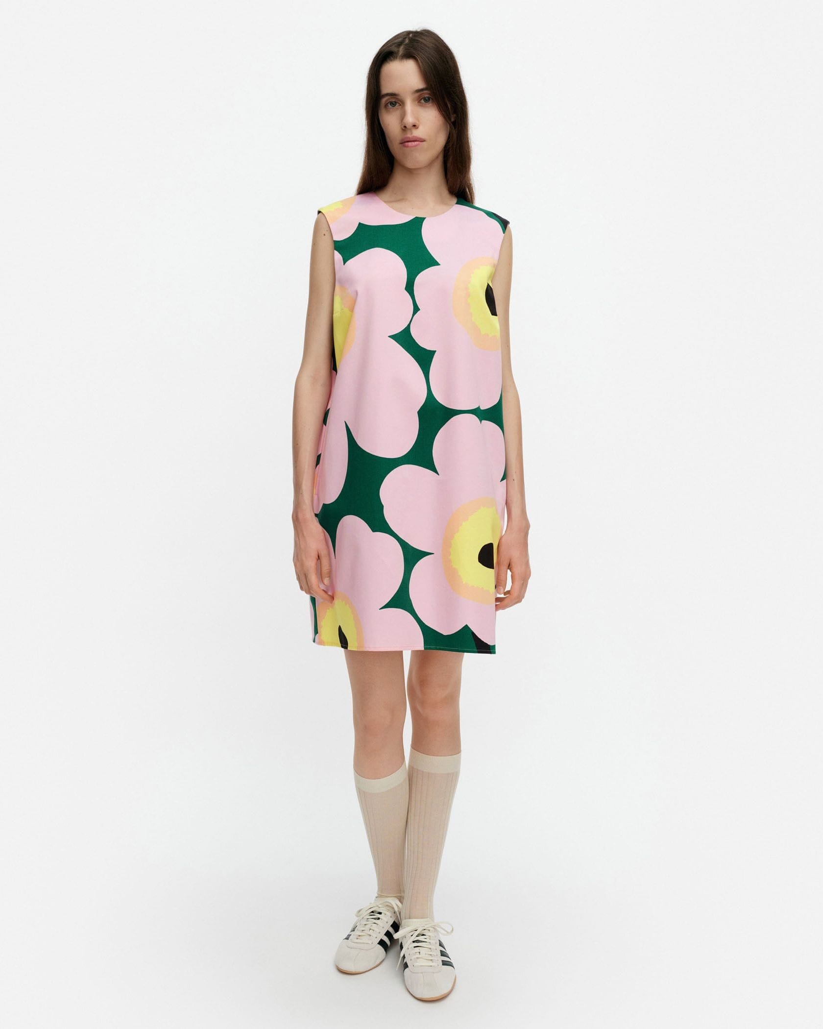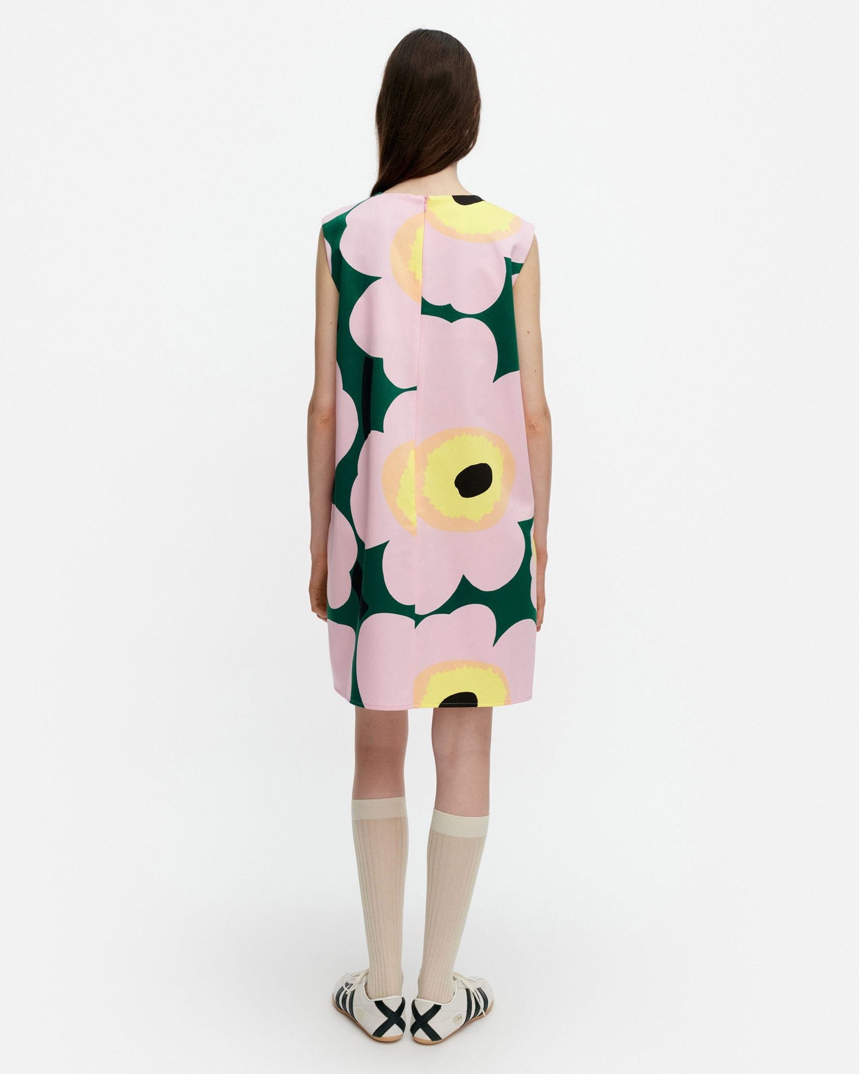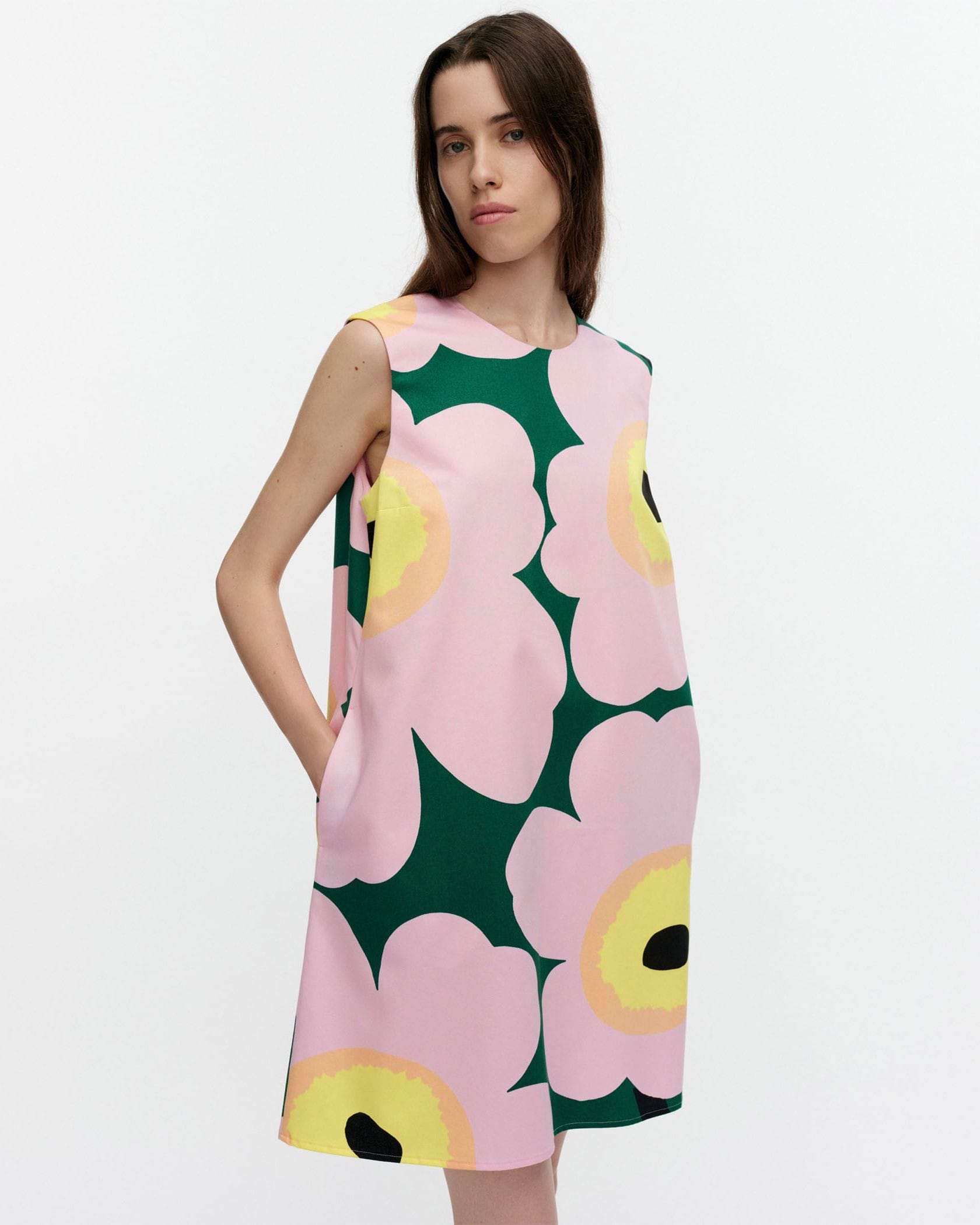 Unikkoモチーフを全面にあしらったワンピース。裾に向かって広がるAライン、バスト部分のダーツ入りの立体的な美しいシルエットが特徴。春夏シーズンにぴったりな涼やかなノースリーブ。すっきりとしたバックシームファスナー、サイドポケット付き。一枚で華やかなお出かけコーディネートが完成する便利なアイテムです。