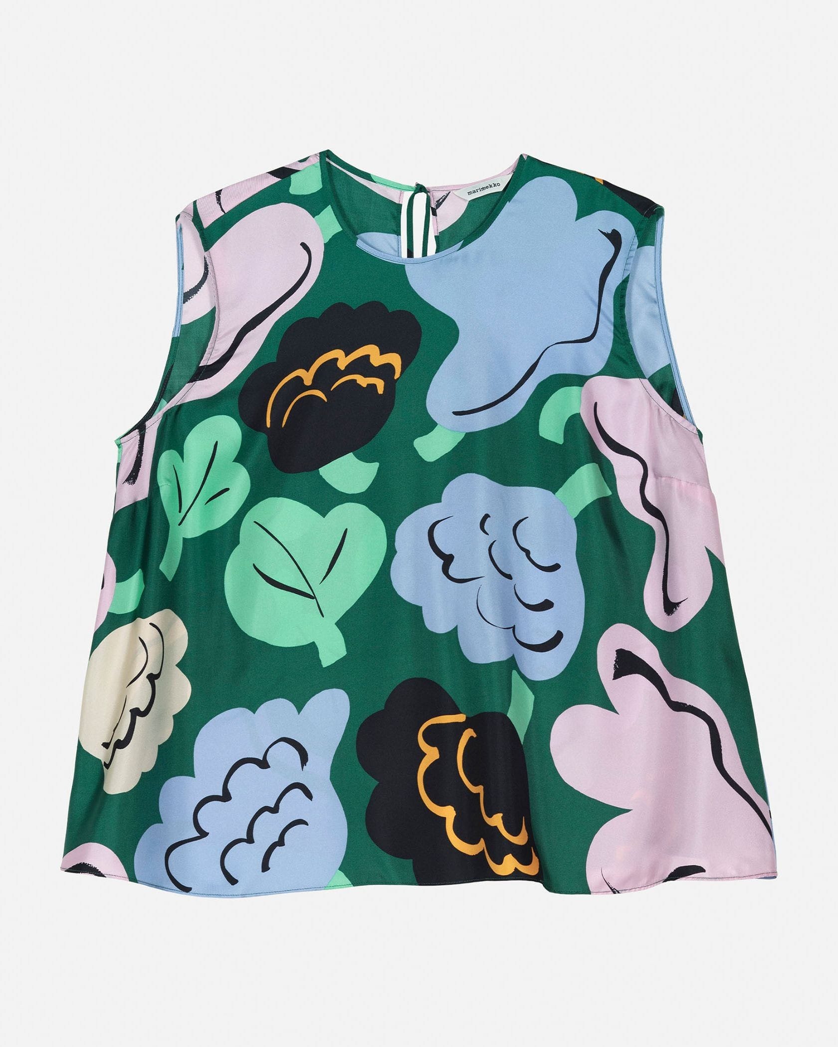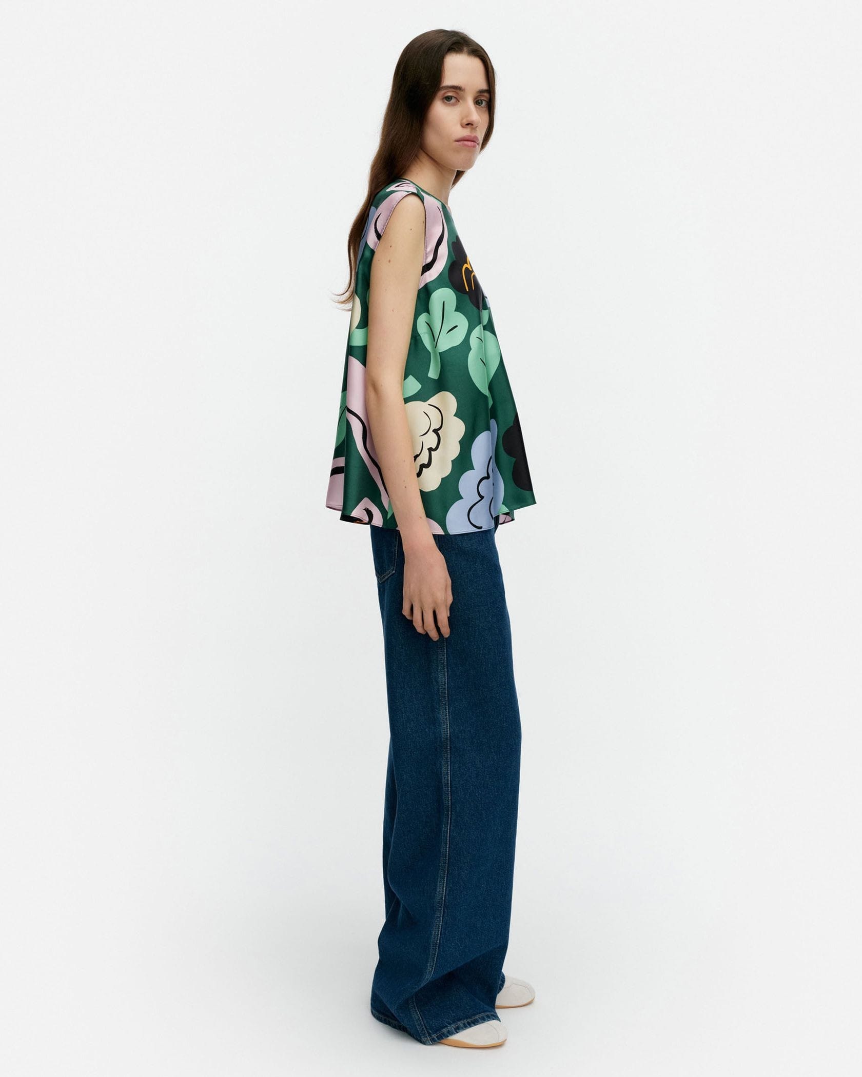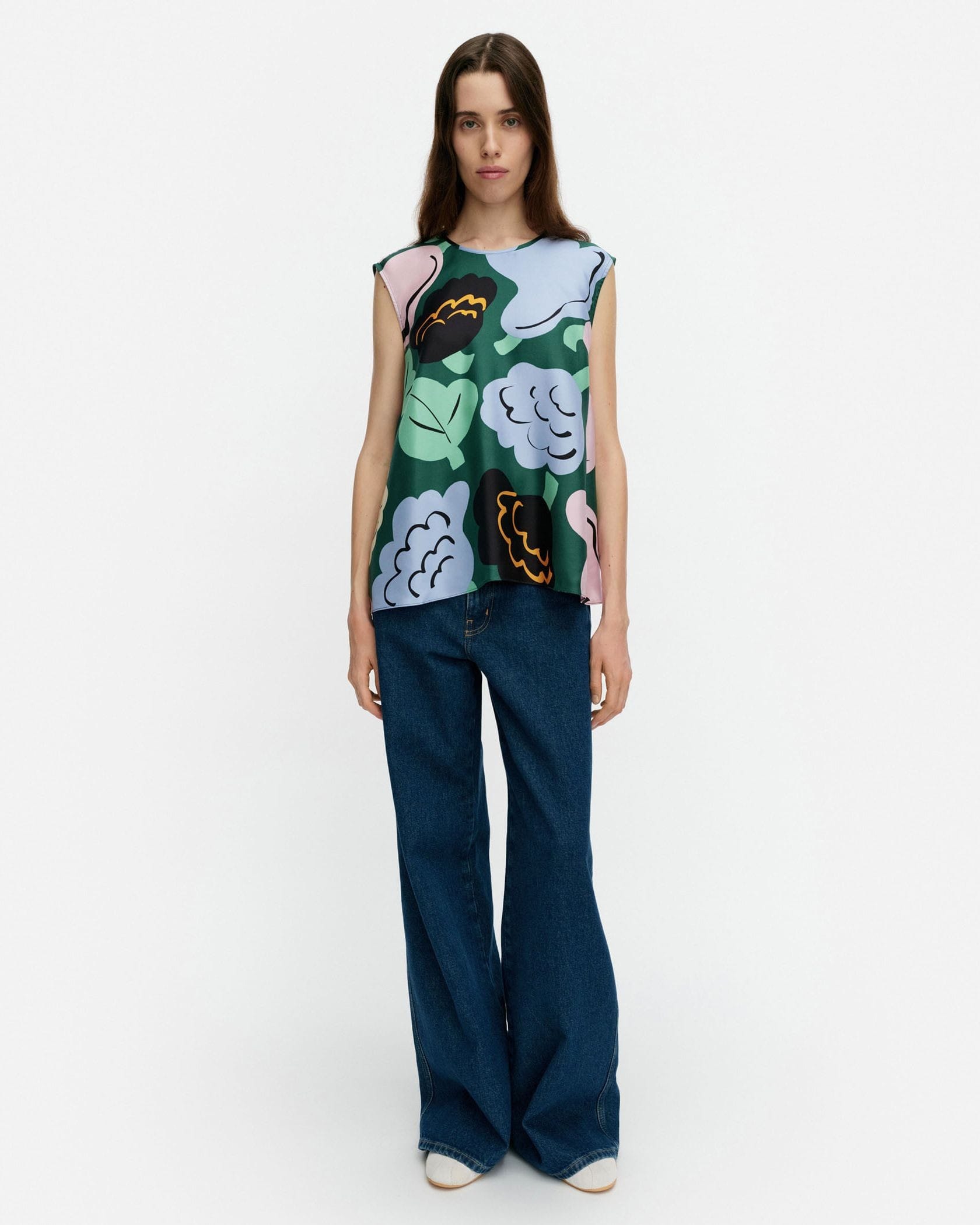 遠目にも鮮やかなKatoava Kukasta Kukkaanノースリーブブラウスです。色彩豊かなプリント柄がコーデに華やかさをプラス、いつもの着こなしをドレスアップしてくれます。動きにあわせてふんわり揺れる素材感とフレアシルエットもポイント、パンツとあわせたマニッシュな着こなしにぴったりです。
