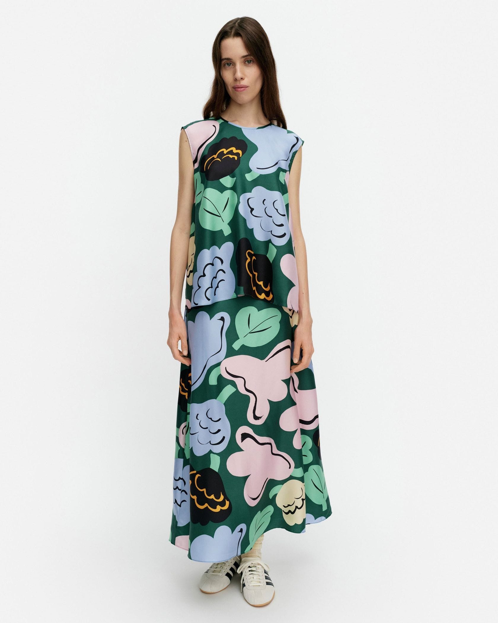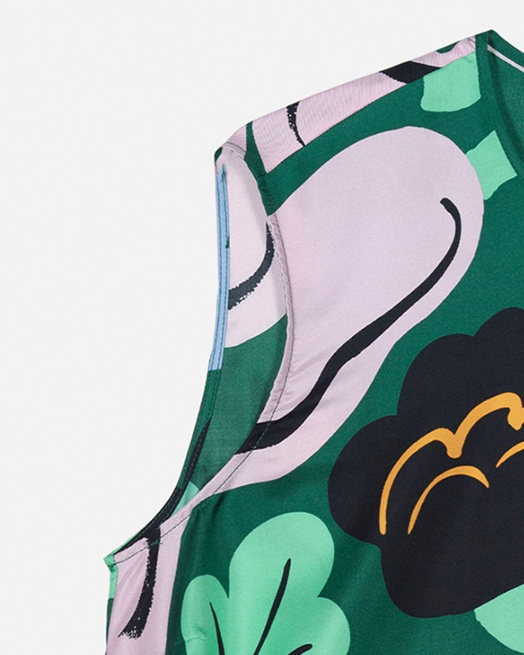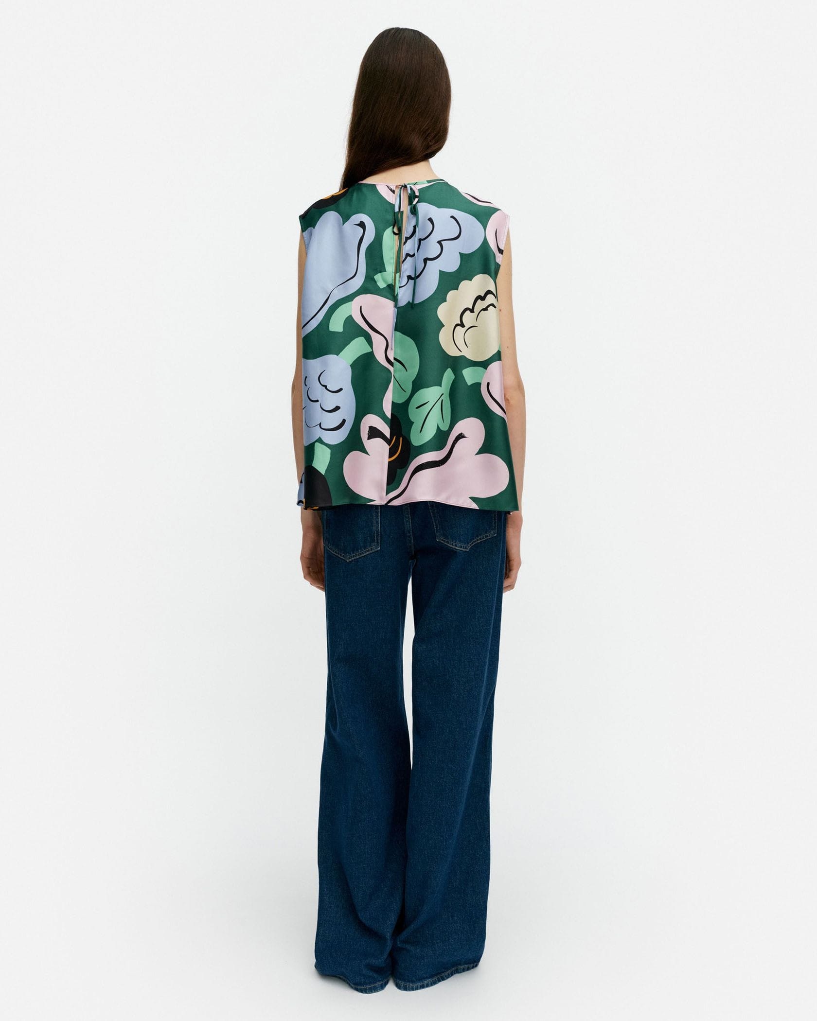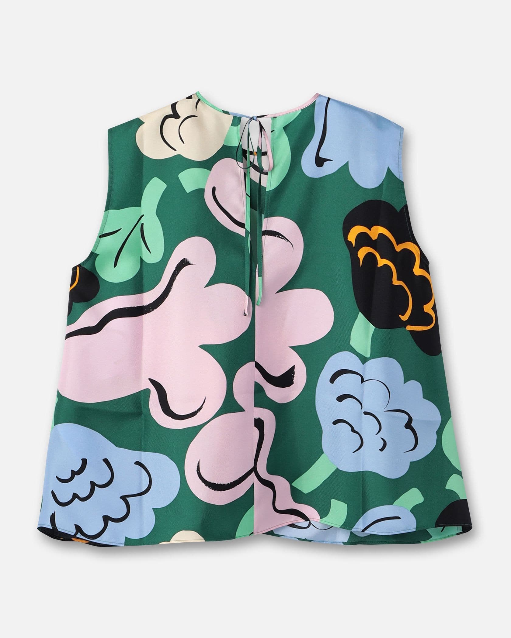 遠目にも鮮やかなKatoava Kukasta Kukkaanノースリーブブラウスです。色彩豊かなプリント柄がコーデに華やかさをプラス、いつもの着こなしをドレスアップしてくれます。動きにあわせてふんわり揺れる素材感とフレアシルエットもポイント、パンツとあわせたマニッシュな着こなしにぴったりです。