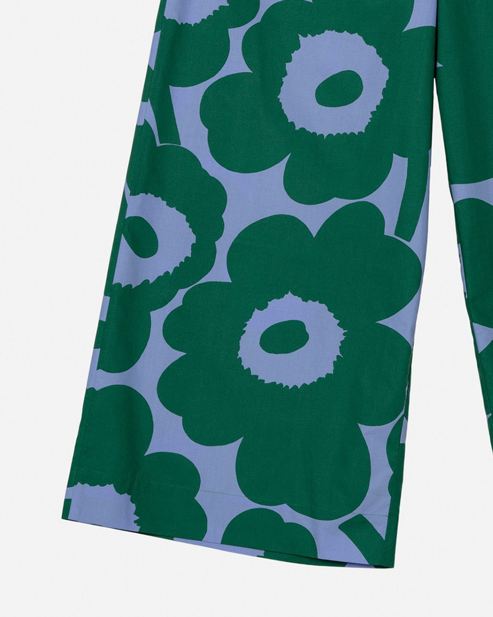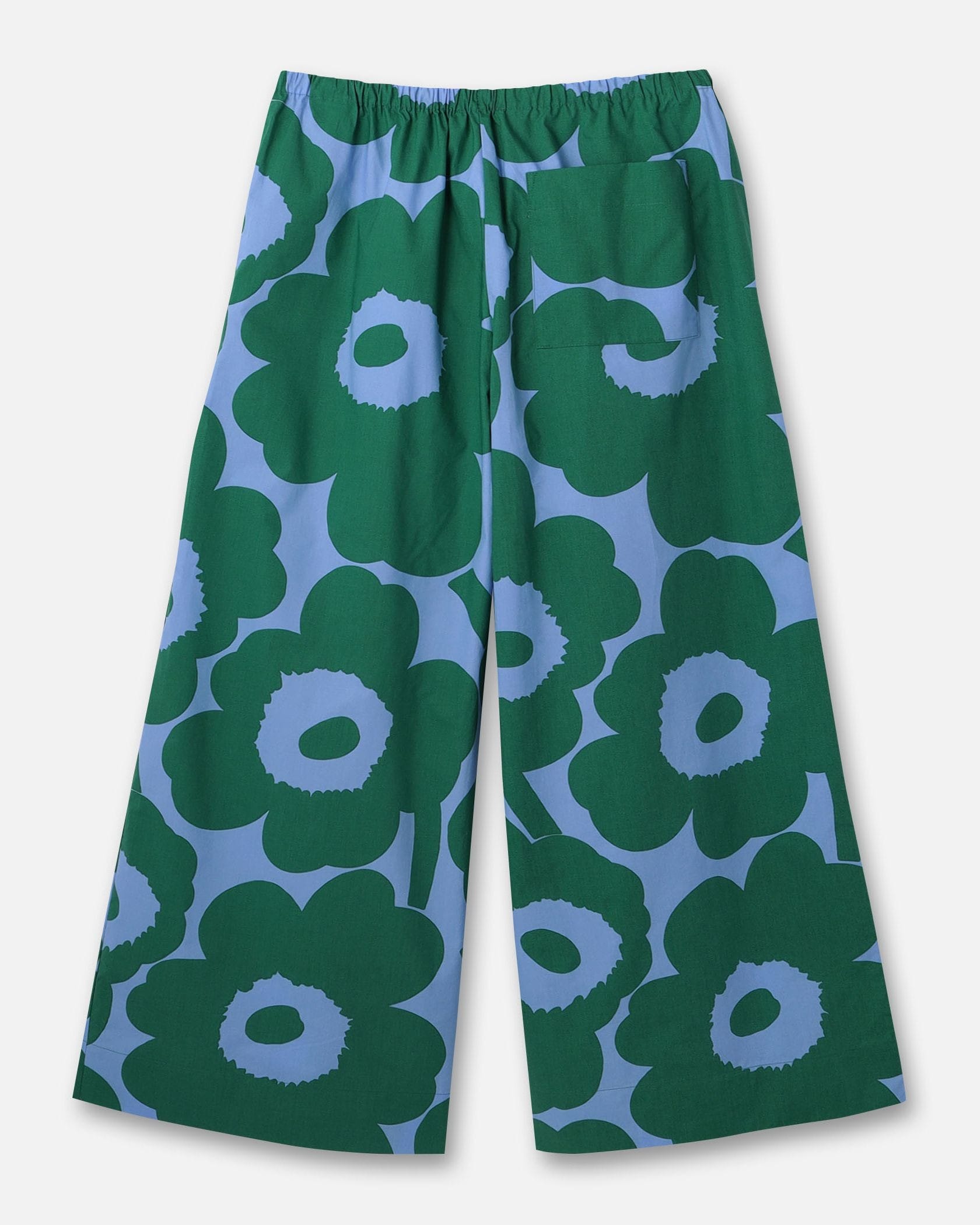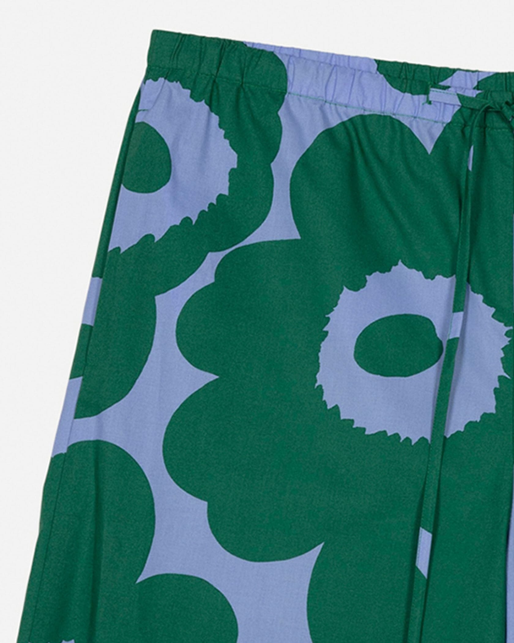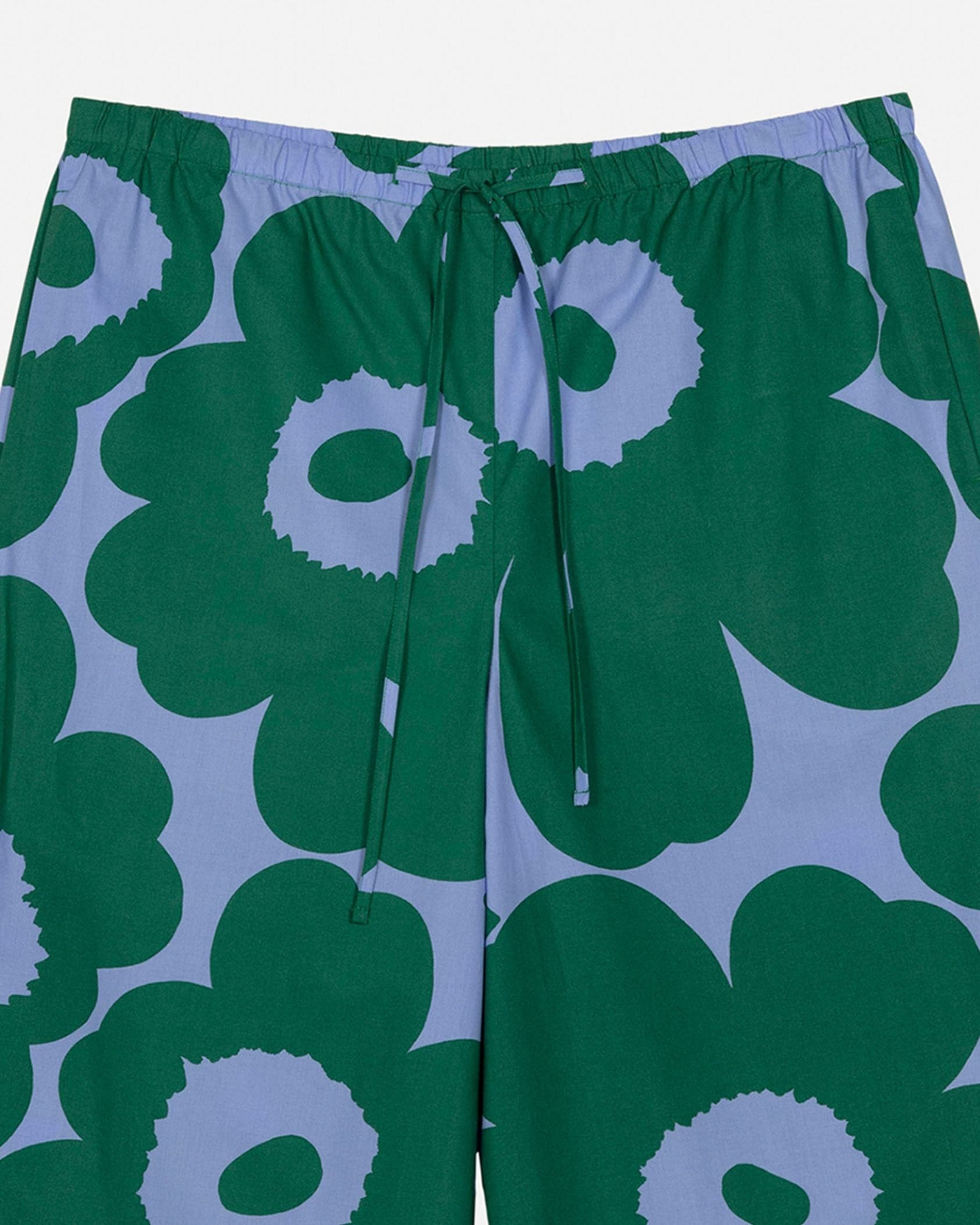 遠目にもMarimekkoだと一目でわかるSh Puoti Unikkoパンツです。存在感たっぷりなUnikko柄でお手軽に北欧スタイルが楽しめます。ゆったりはけるワイドシルエットで気になる下半身をカバーしてくれるのもポイント、ドロスト紐×ゴムのトップスINしやすいデザインです。