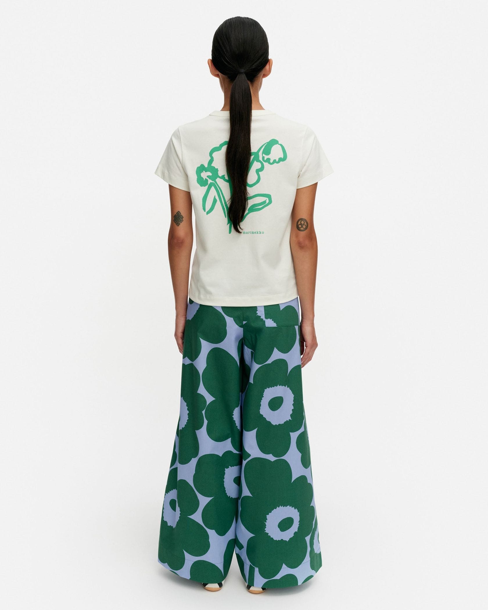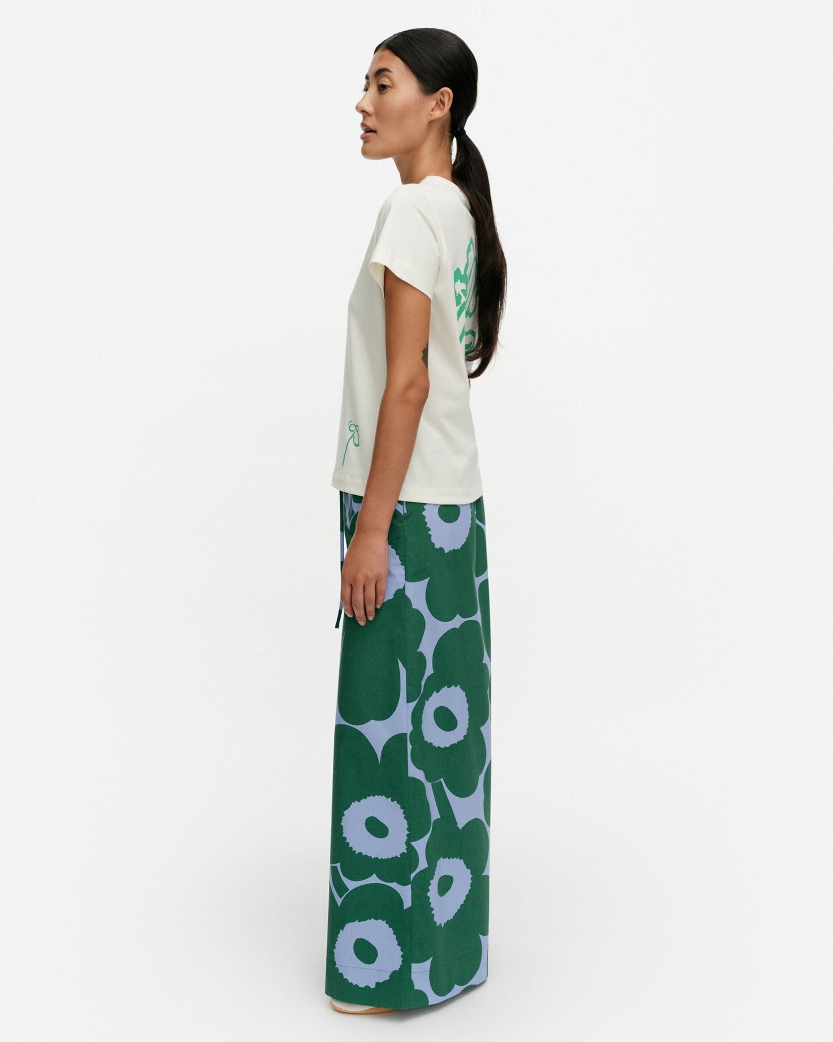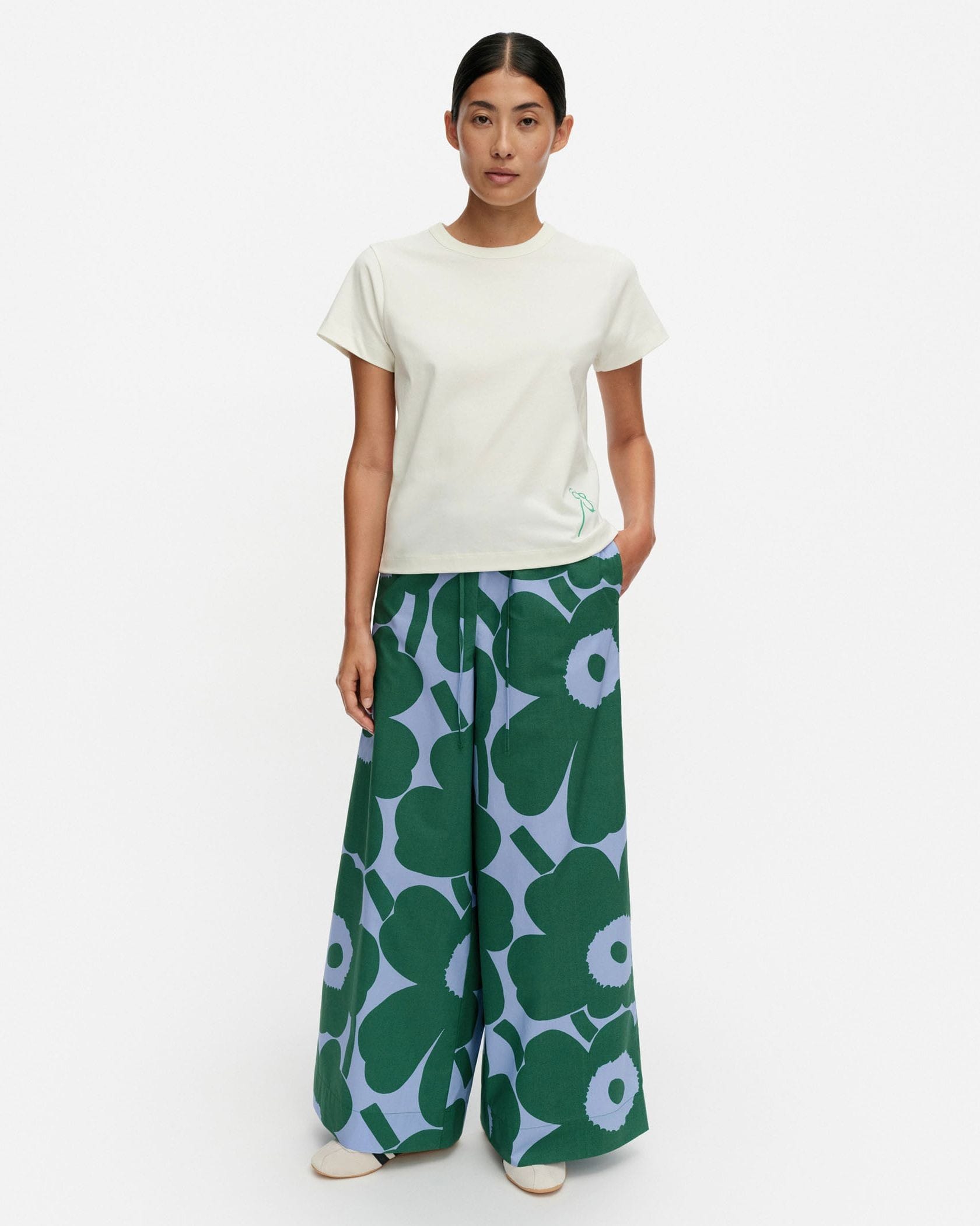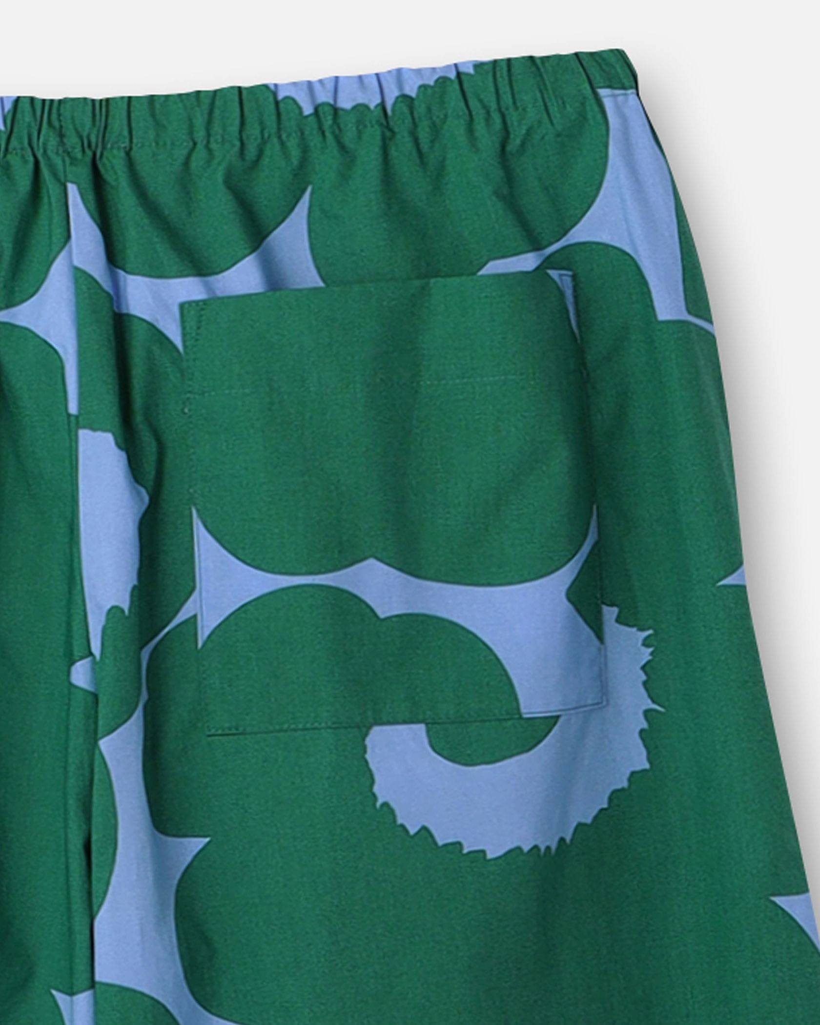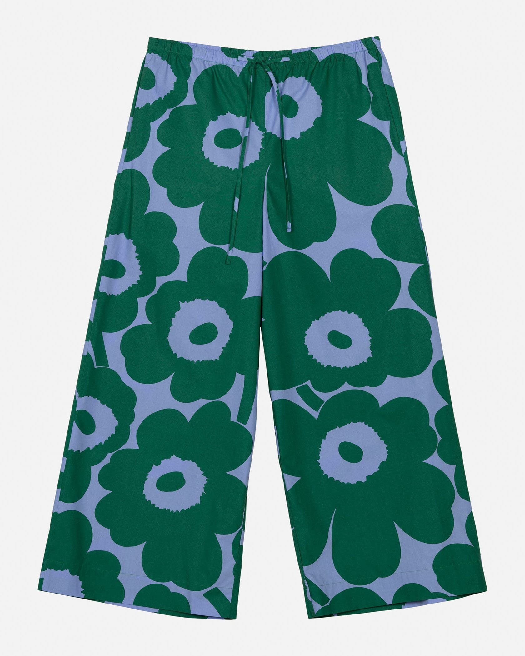 遠目にもMarimekkoだと一目でわかるSh Puoti Unikkoパンツです。存在感たっぷりなUnikko柄でお手軽に北欧スタイルが楽しめます。ゆったりはけるワイドシルエットで気になる下半身をカバーしてくれるのもポイント、ドロスト紐×ゴムのトップスINしやすいデザインです。