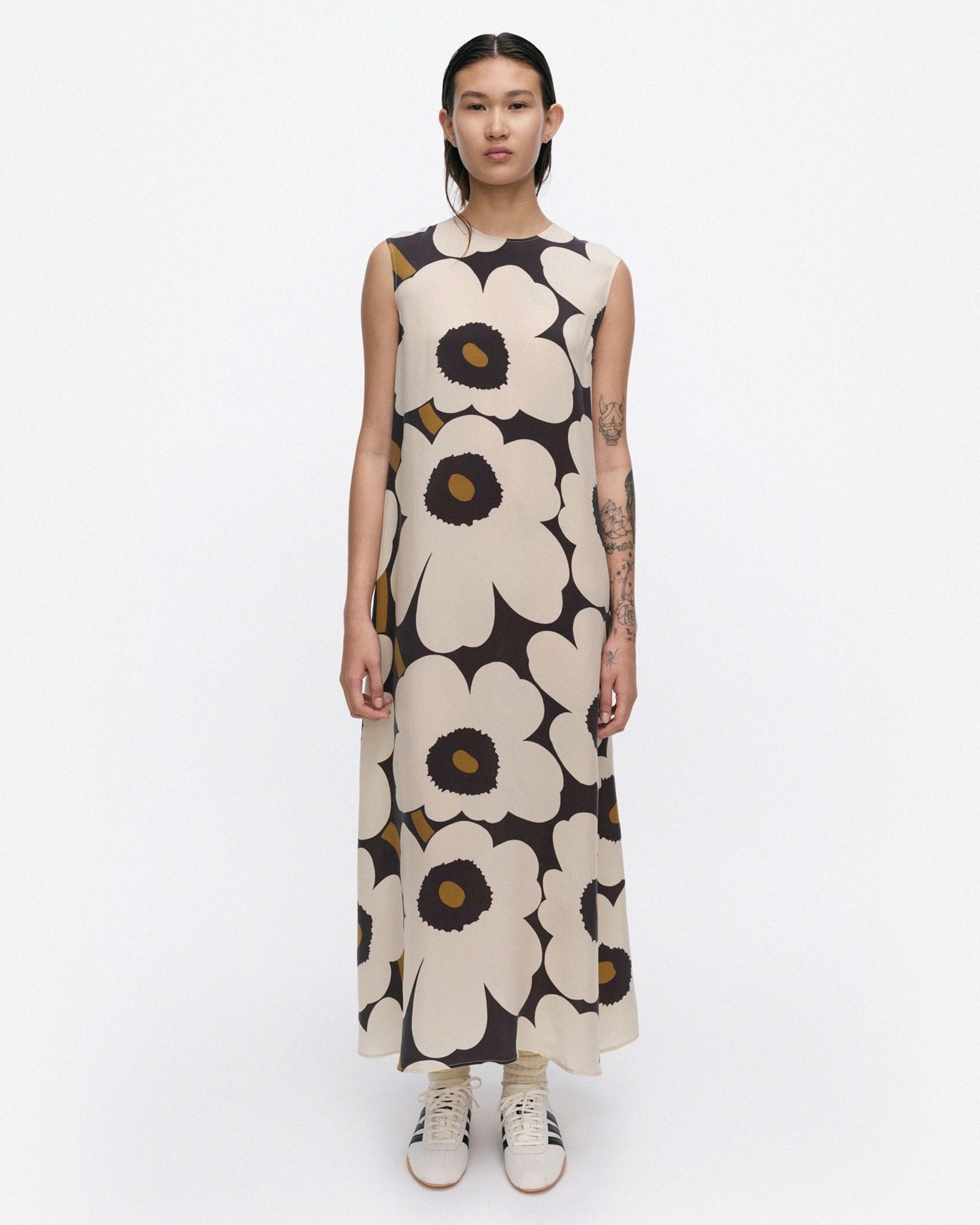 Unikko柄を全面にあしらったインパクトのあるデザインのロング丈ワンピース。大きなフラワーモチーフが華やかなデザイン。春夏シーズンらしい涼やかなムードのノースリーブ。長いリボンが付いた背中のファスナーでスタイリッシュなバックスタイル。一枚でお出かけスタイリングが完成するスタイリッシュな一枚です。