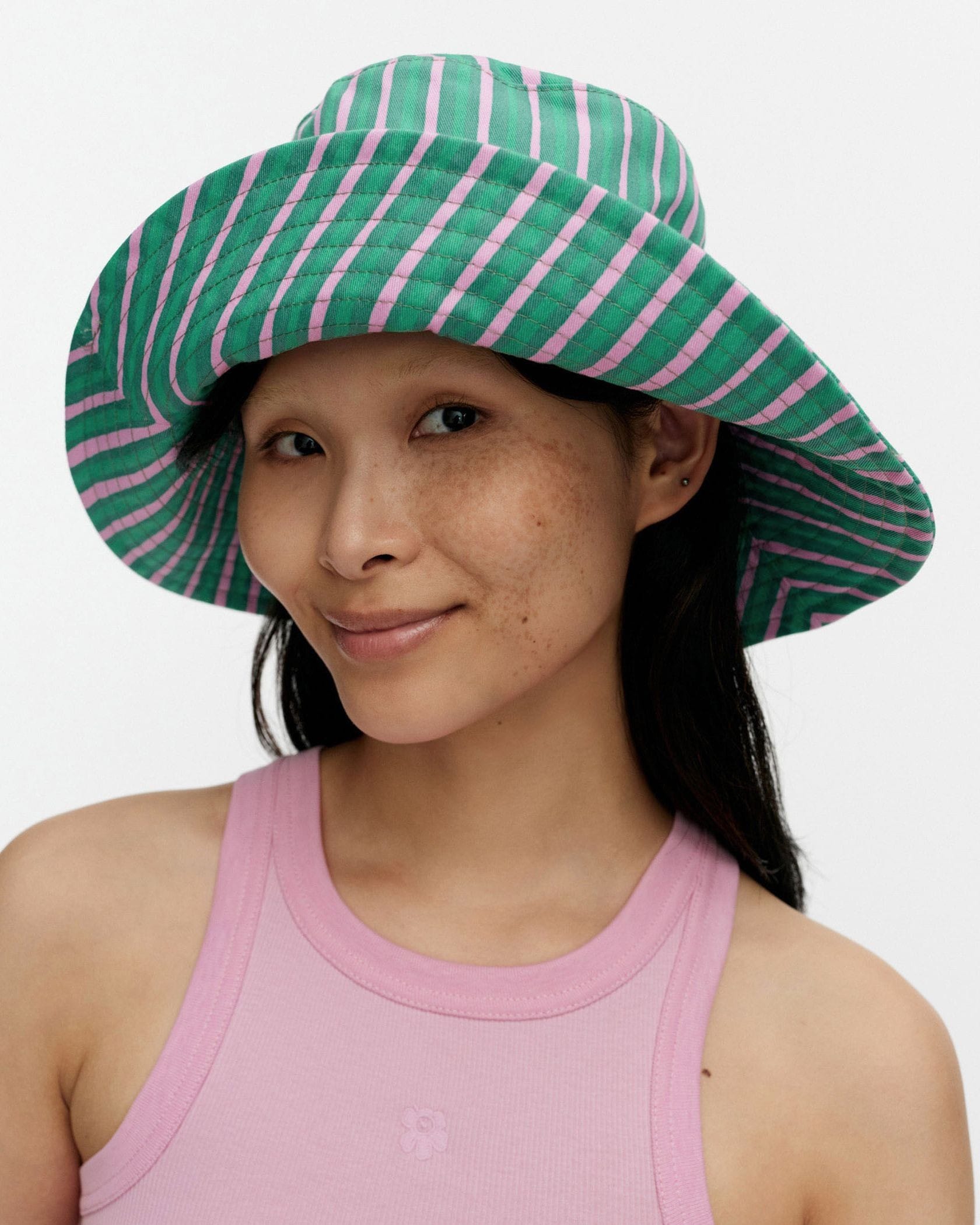世界中から愛されるMarimekkoから、鮮度の高いストライプ柄で人気を集めるPiccoloのハットが登場です。オールシーズン使いやすいコットン100%素材、遠目にもアイキャッチな柄でいつものコーデにアクセントをプラスします。紫外線から肌を守る深めのシルエット、つば部分を上げたアレンジもおすすめです。