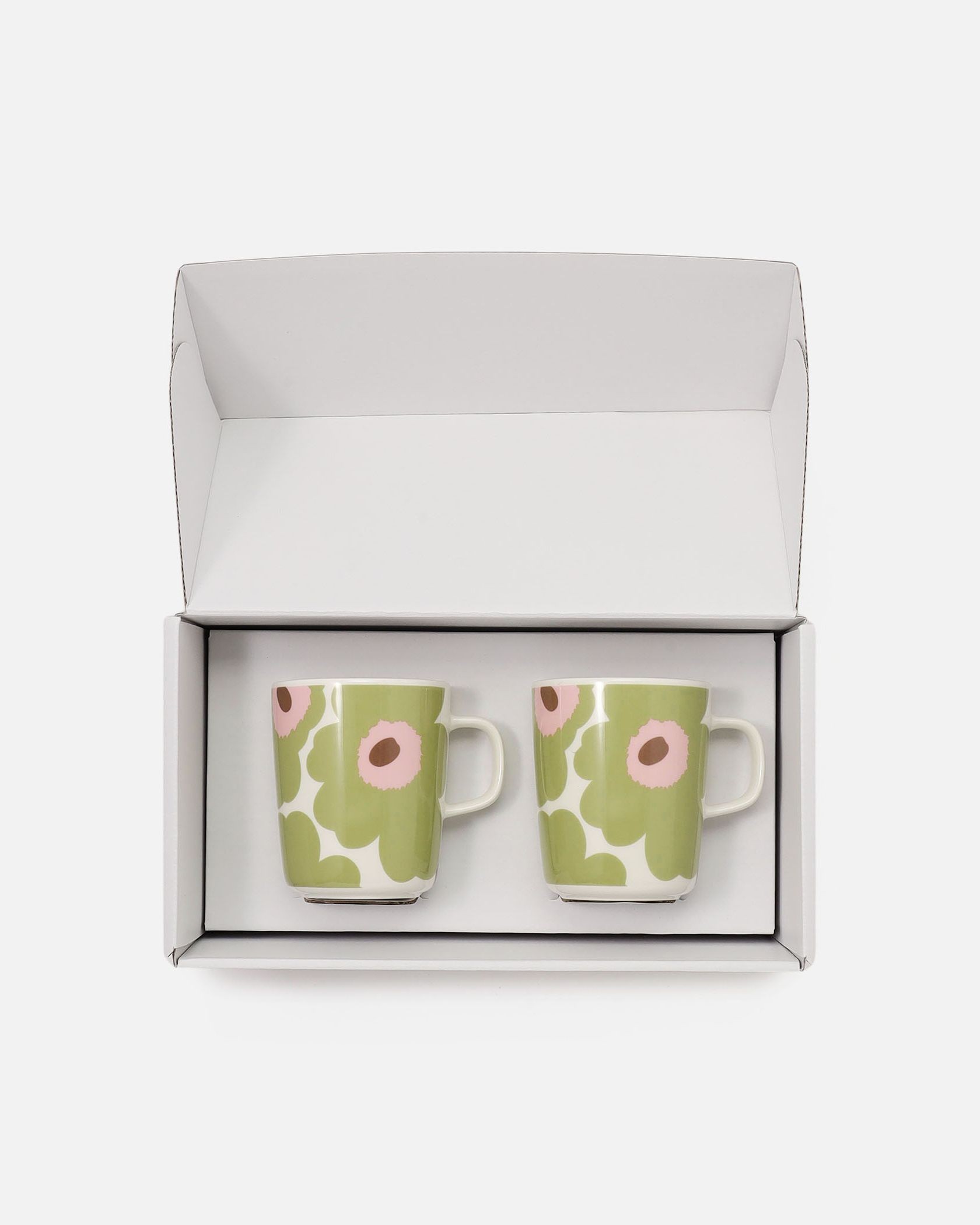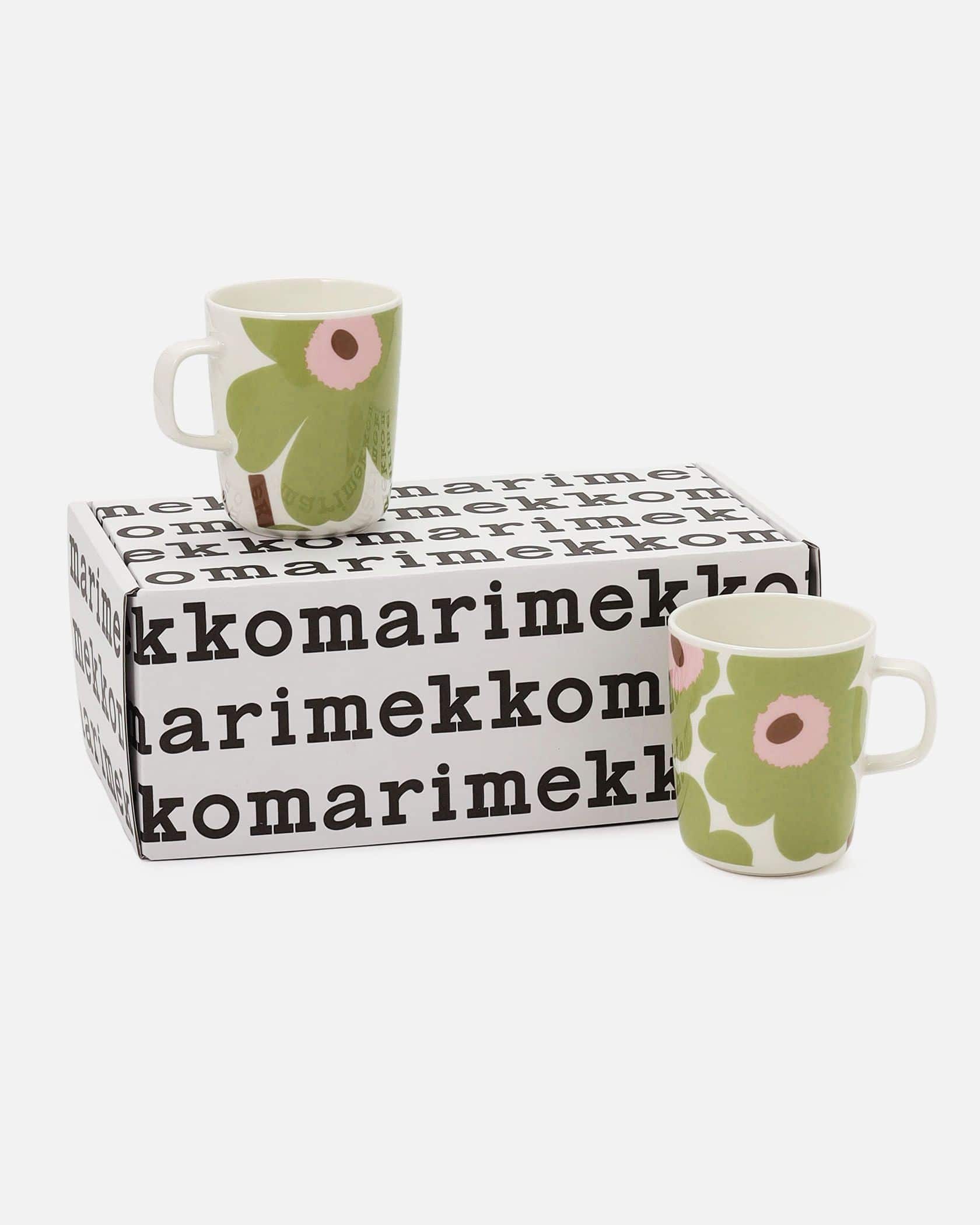 日本限定・オンライン限定のUnikko柄マグカップセット。ライトグリーン×ライトピンクの配色がナチュラルで落ち着いた雰囲気です。シンプルなシルエットと使いやすい250mlサイズで、朝食やティータイム、デスクワークのおともに最適なアイテム。ご自宅用はもちろん、引っ越し祝いなどのギフトにもおすすめです。
