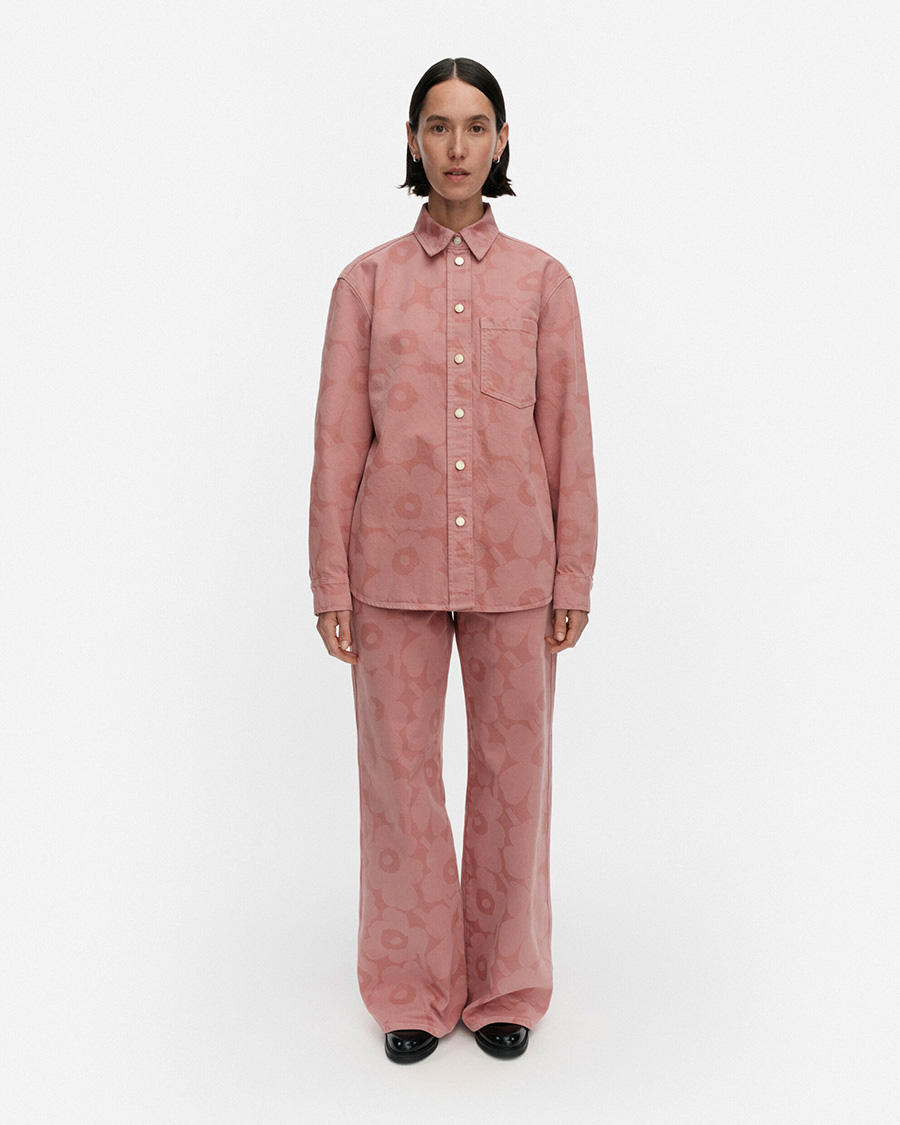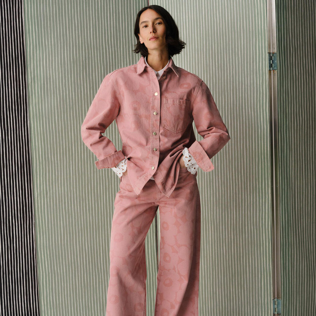 Maija Isolaによる象徴的なUnikkoをあしらったダスティピンクのデニムスタイルや、美しいキャラメルカラーの無地デニムが登場。新たにプリントの仲間に加わるのはKeidas(ケイダス)。1967年にAnnika Rimala(アンニカ・リマラ)がユースカルチャーのエネルギーに着想を得た、リズミカルで装飾的なデザインが、デニムシャツやルーズパンツに落とし込まれています。