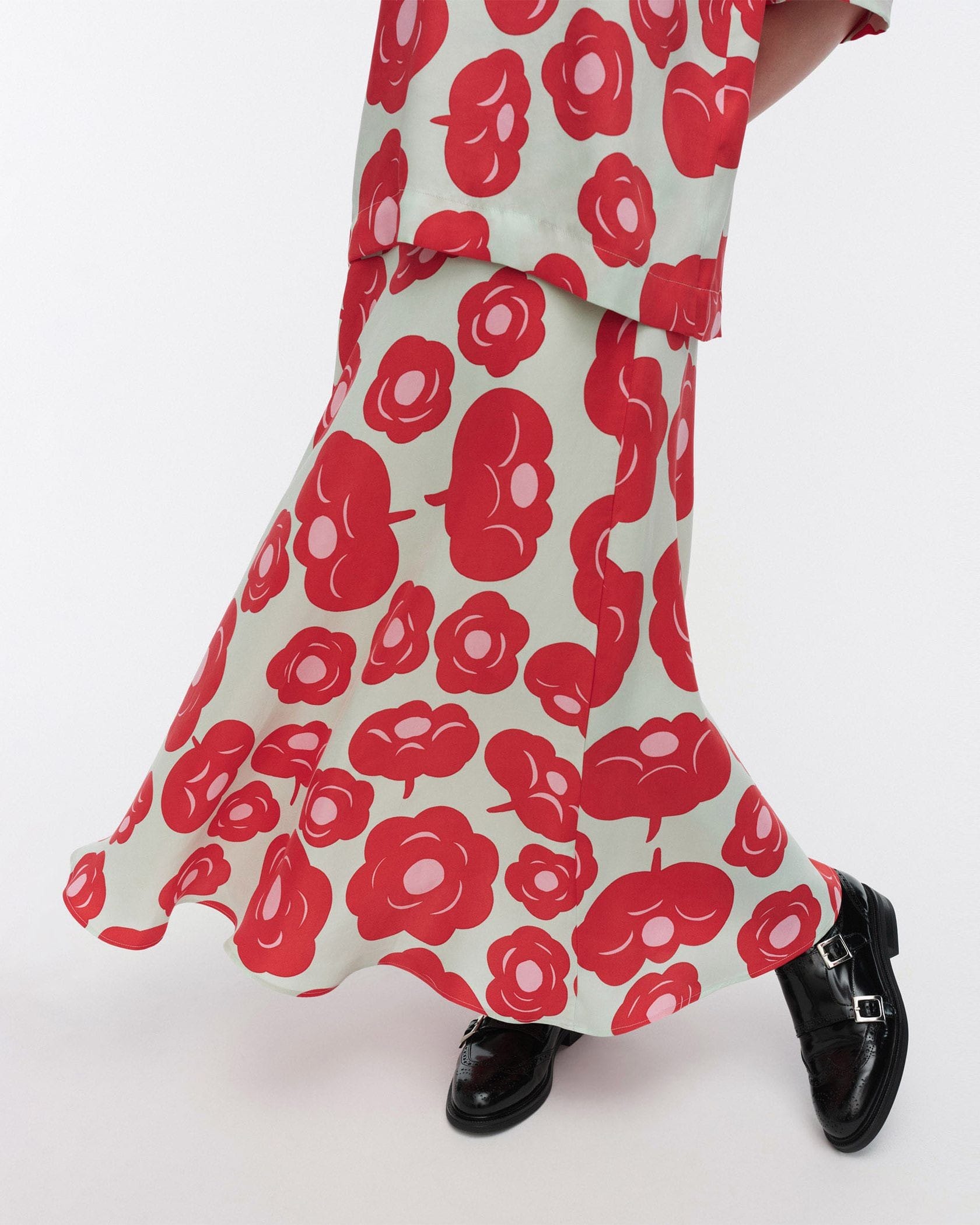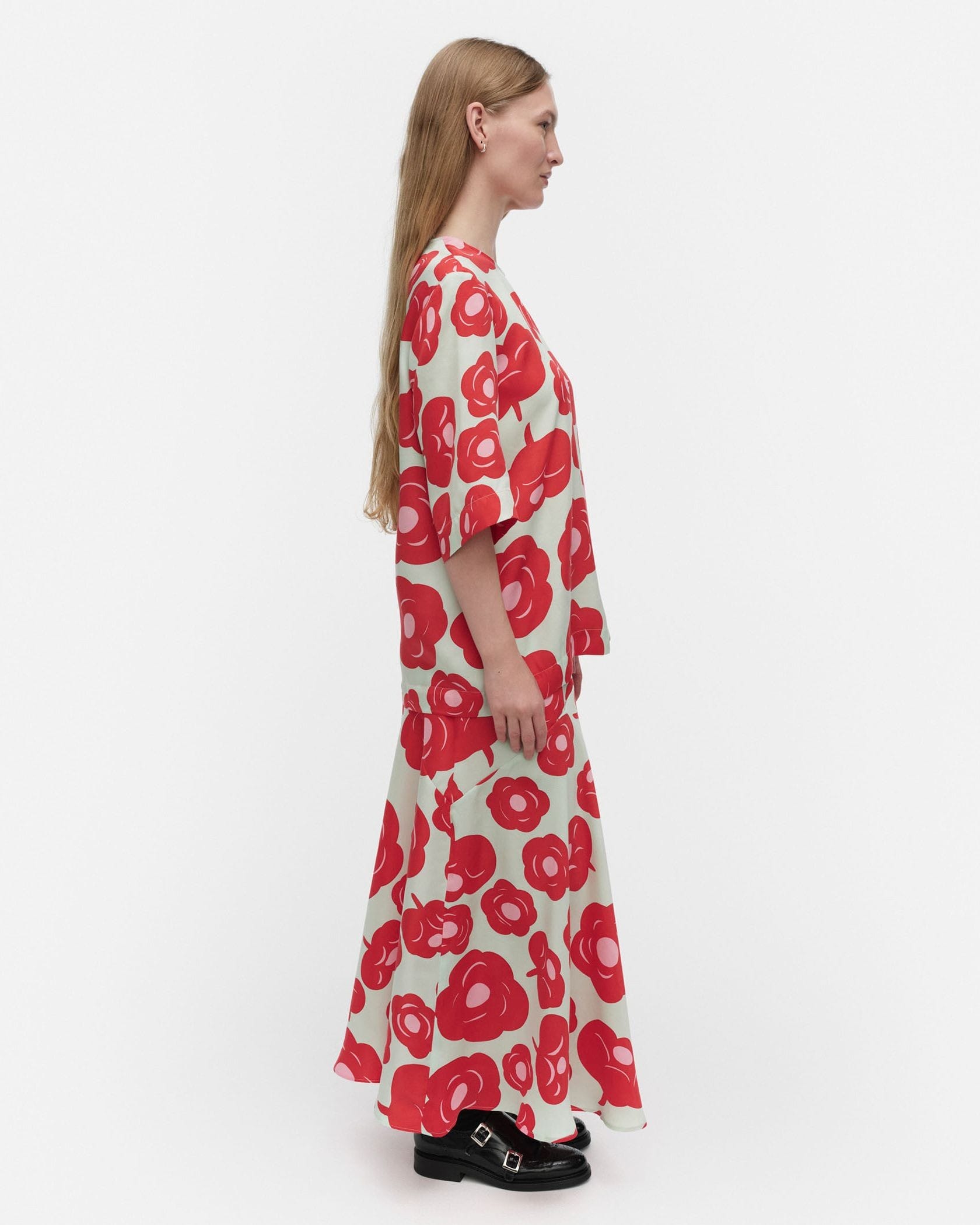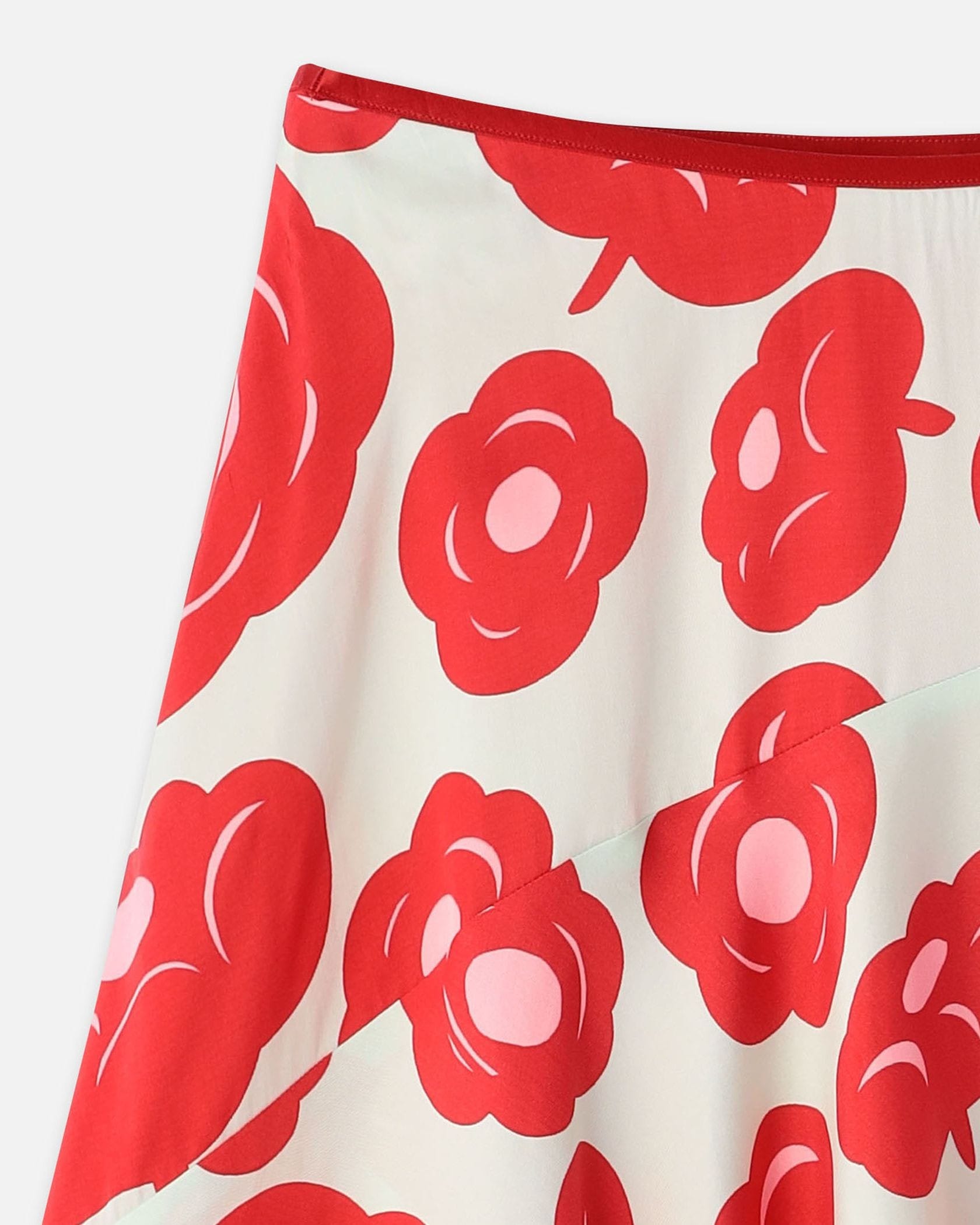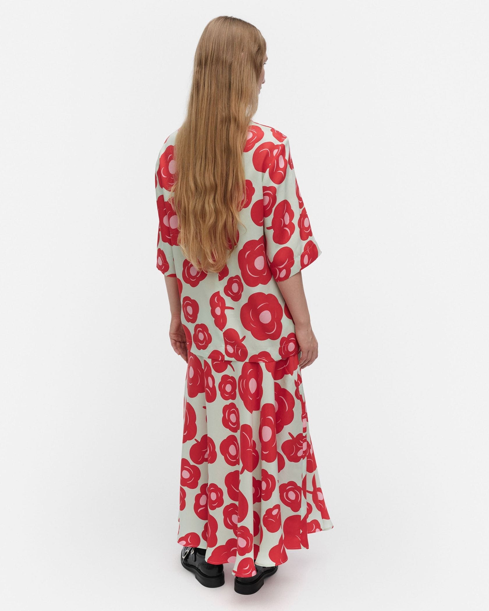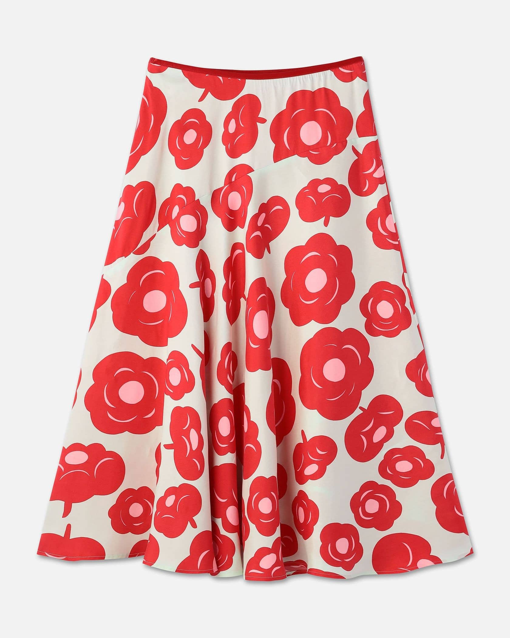 華やかなTumma柄のロング丈スカート。全体にプリントされたフラワーモチーフが目を惹くデザイン。裾に向かってフレアに広がるドレープ感のあるフェミニンなシルエット。ウエストはゴム仕様で履き心地快適なのもうれしいポイント。お手持ちのトップスに合わせて、スタイリッシュなコーディネートが実現するアイテムです。