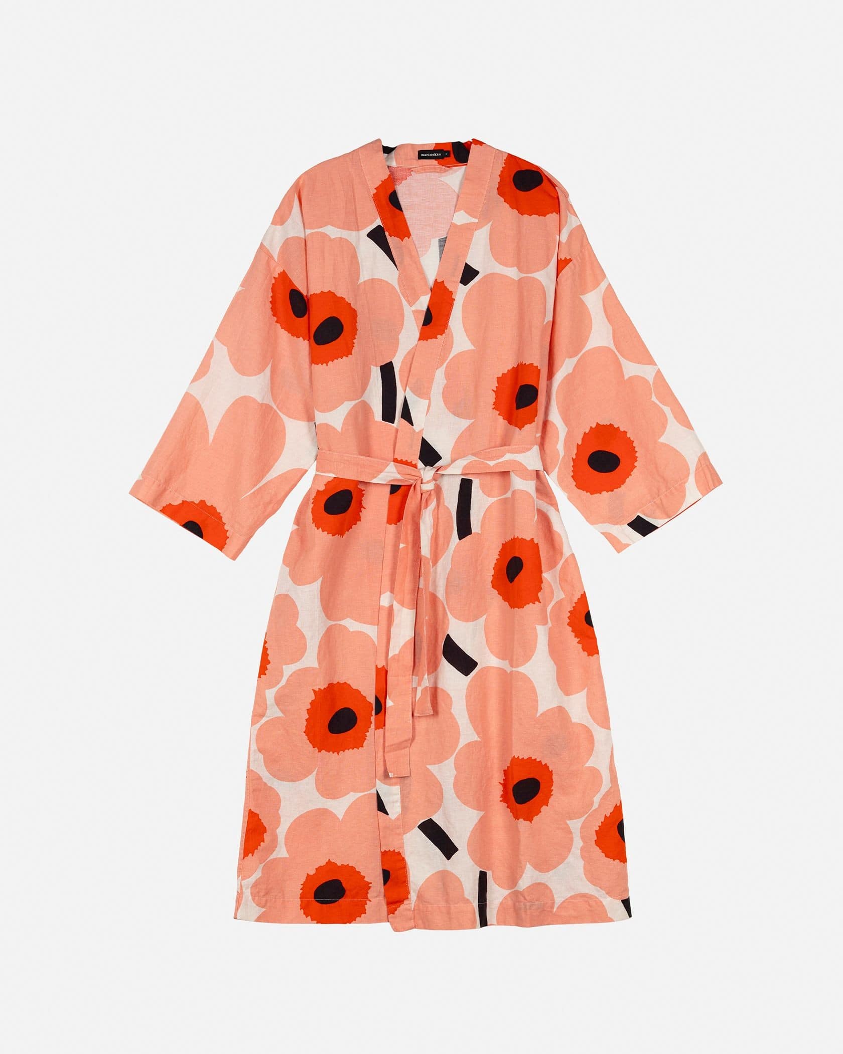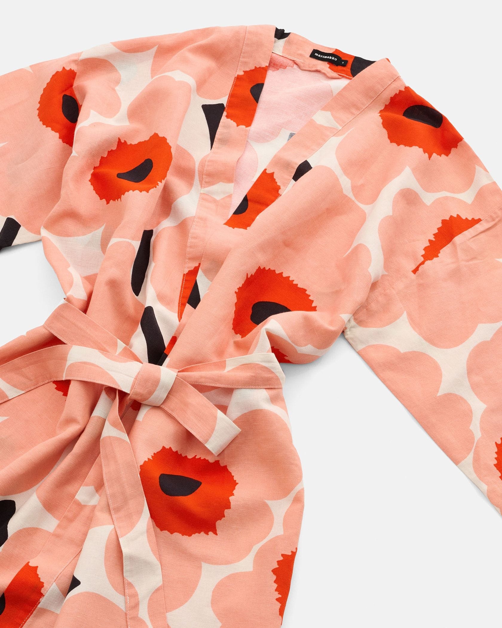 Unikko柄のバスローブ。大きなフラワーモチーフが全面にプリントされた華やかなデザインが魅力。ピンクと赤の明るい配色がバスタイムを彩り、楽しいムードを演出します。春夏シーズンにぴったりな軽やかな生地感。バスルームに置いておくだけで、スタイリッシュなインテリアアクセントになるアイテムです。