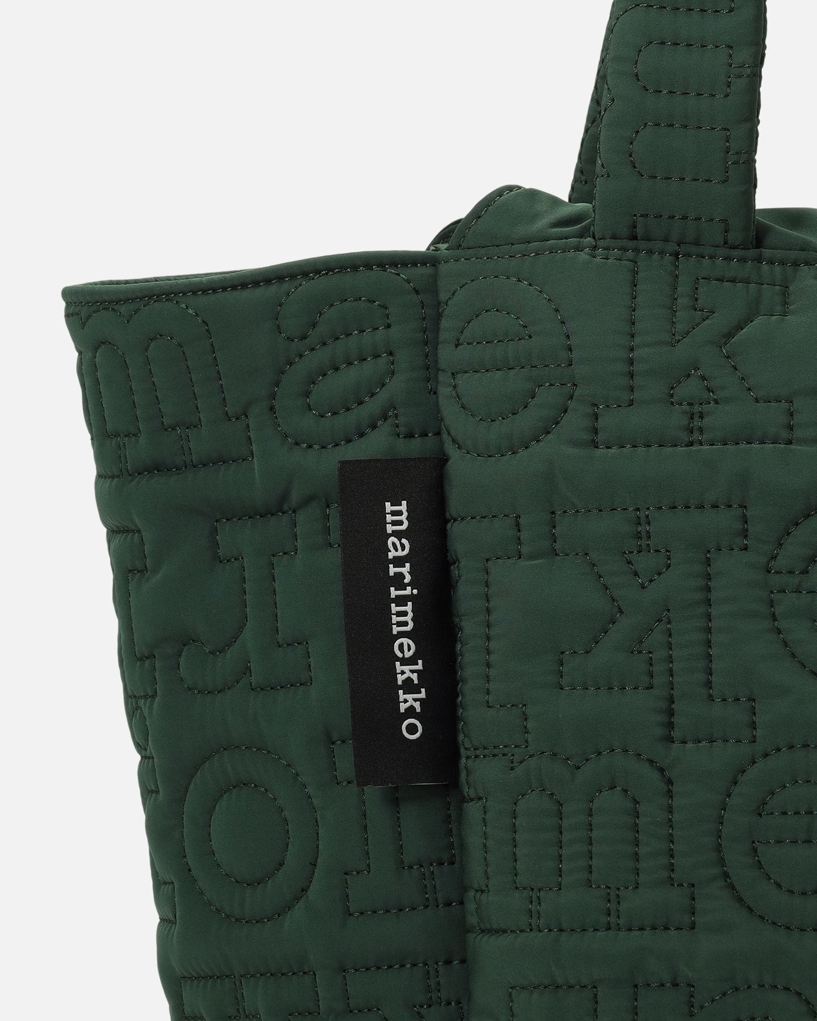 Marimekkoロゴを散りばめたキルティングトートバッグ。柔らかな質感やA4サイズが収まる大きさ、肩掛けしやすい長めのハンドル、ファスナー付きの間口など、細部まで使いやすさに配慮しています。大ぶりなピスタグも目をひくアクセント。シンプルな単色で合わせる服装を問わず、日常使いに最適なアイテムです。