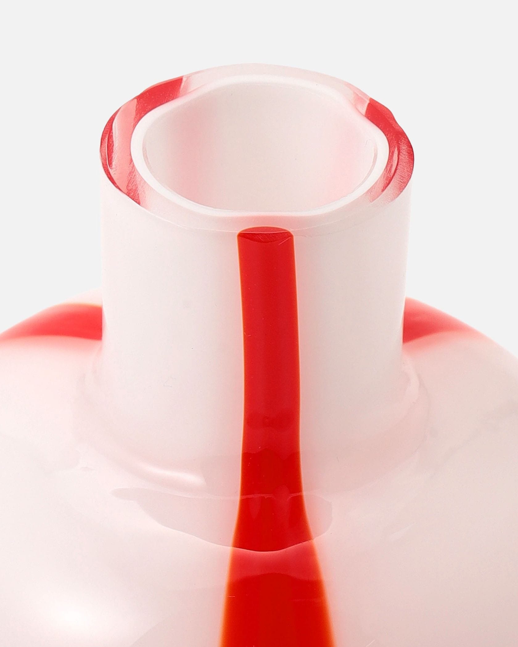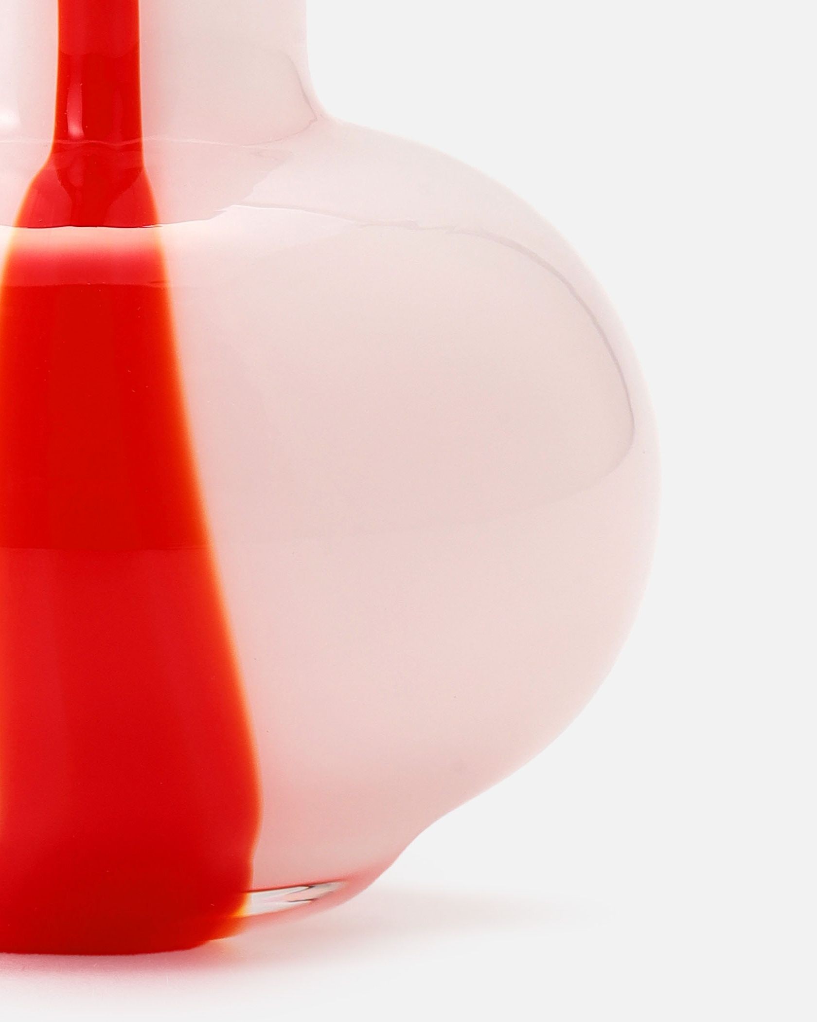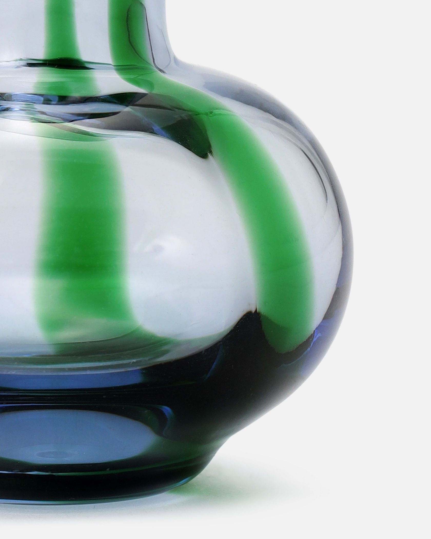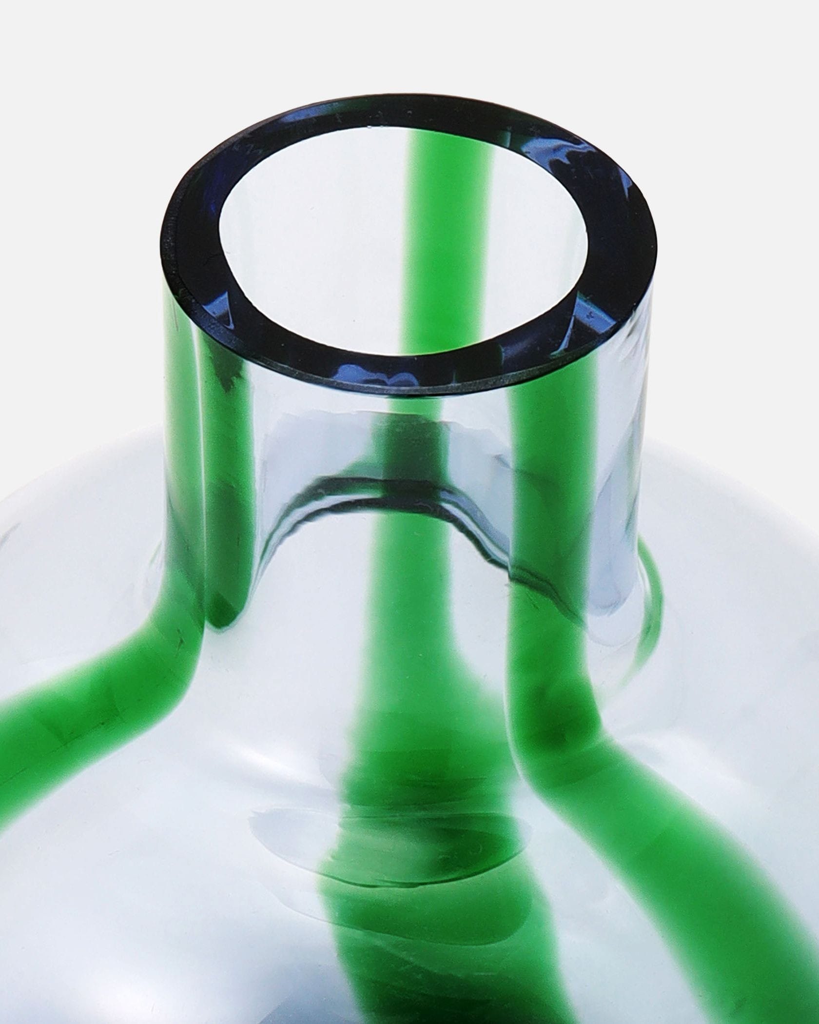 コロンとしたフォルムの手吹きガラスのフラワーベース2個セット。ガラスにカラーラインのあしらいがスタイリッシュなデザイン。丸いモダンで印象的なシルエットも魅力。花を生けるのにはもちろん、キャンドルフォルダーとしても使える優れもの。インテリアスタイリングのアクセントにぴったりなアイテムです。