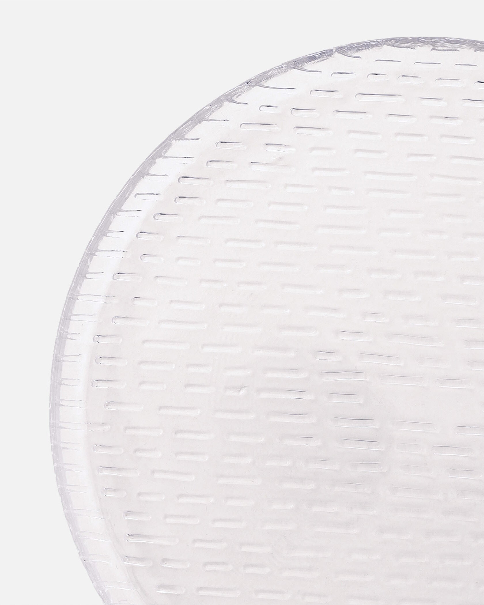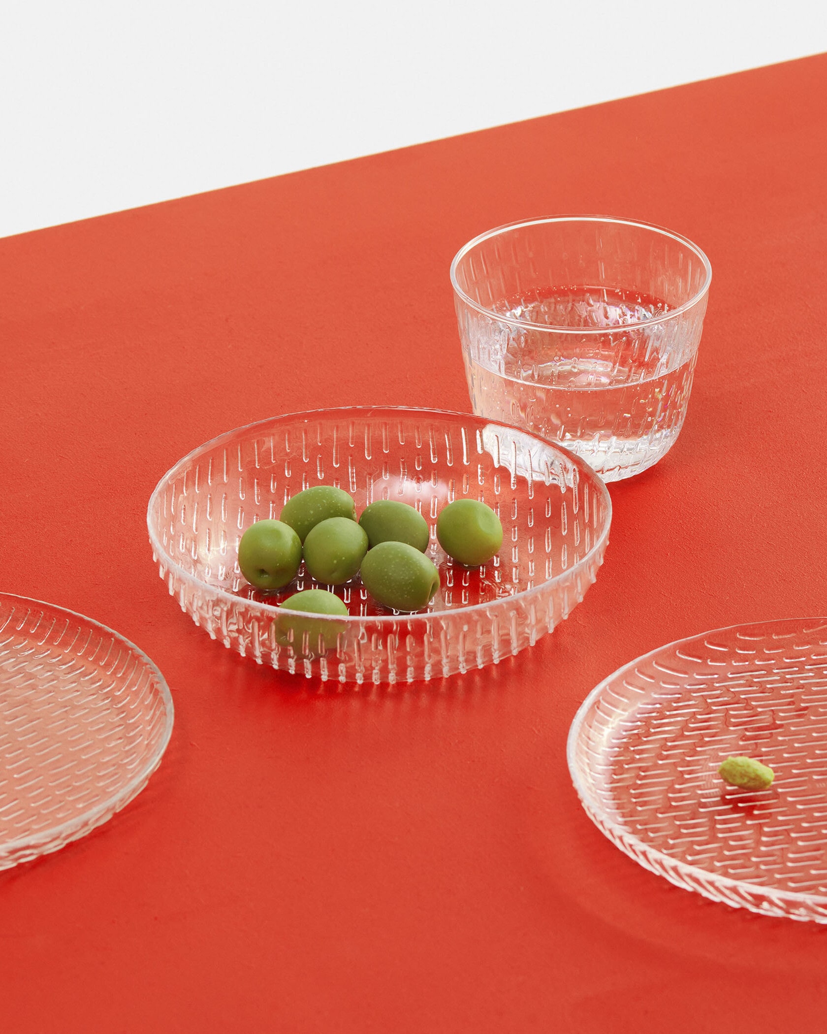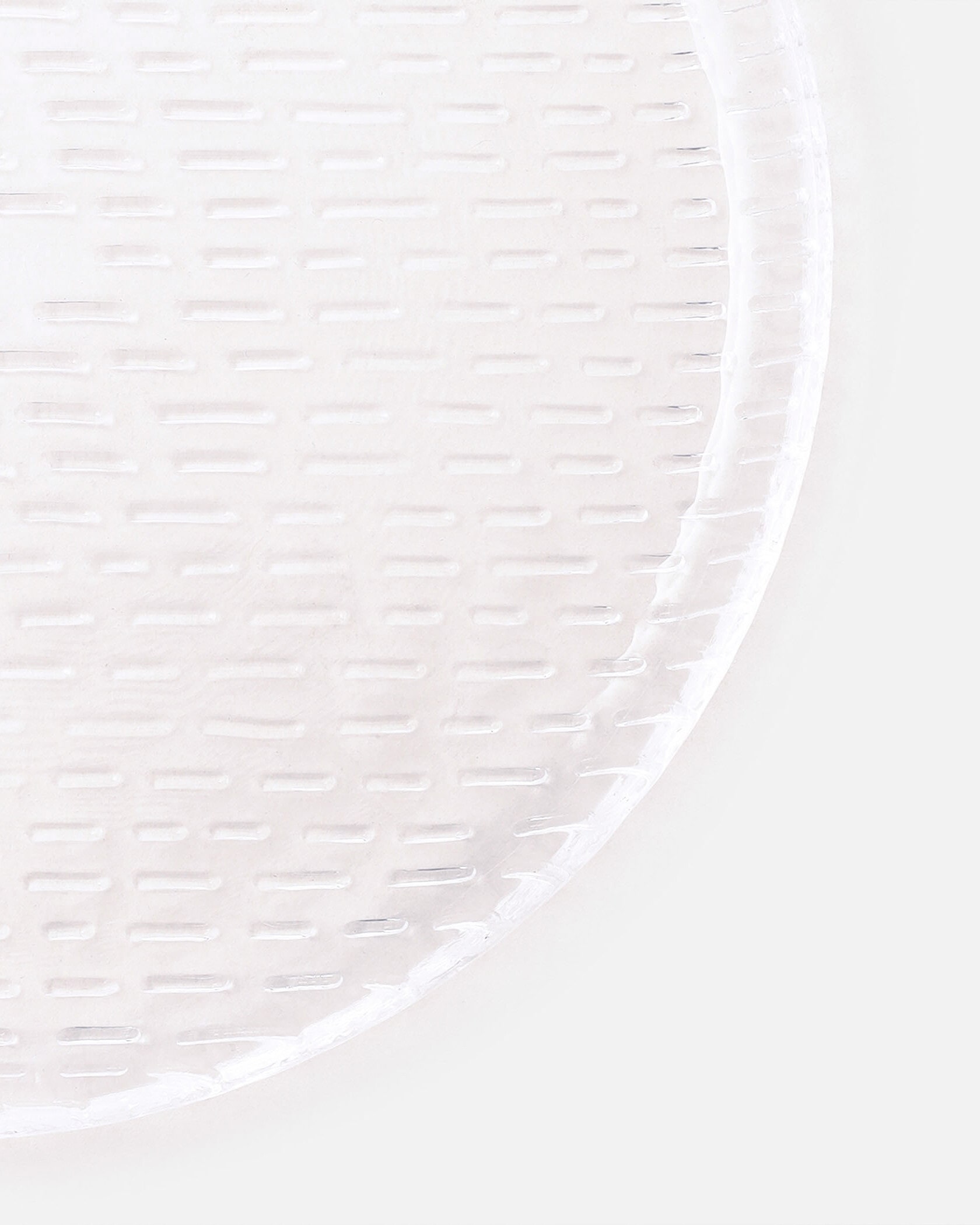 短いラインをストライプ状に組み合わせた、モード感溢れるデザインのプレートセット。柄は凹凸によって表現しています。清潔感があるクリアカラーは涼しげな印象も感じられ、食卓に春夏シーズンらしさを添えたい際にもおすすめのアイテムです。サラダやフルーツなどの盛り付けにもご活用いただけます。