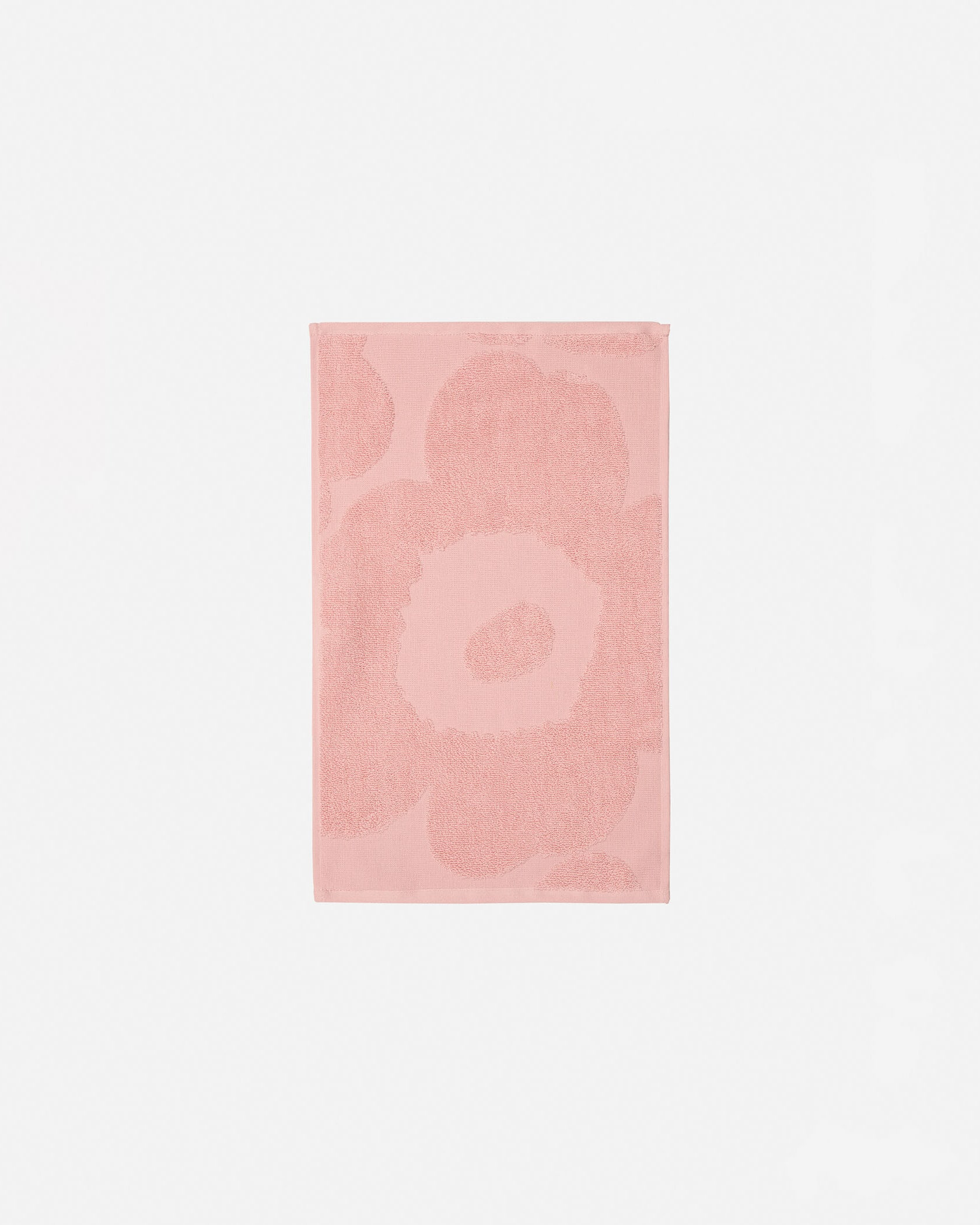 Marimekkoを象徴するUnikko柄のゲストタオル。表面感のある生地で表現された、花のモチーフが華やかなデザイン。暖かみのあるローズカラーのワントーンで構成されたシンプルなデザイン一枚です。コットン100%の肌触りの良い生地感で使いやすく、デイリーに活躍するアイテムです。