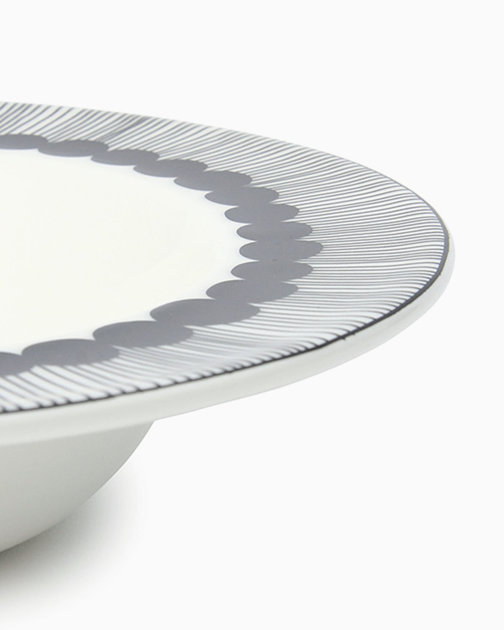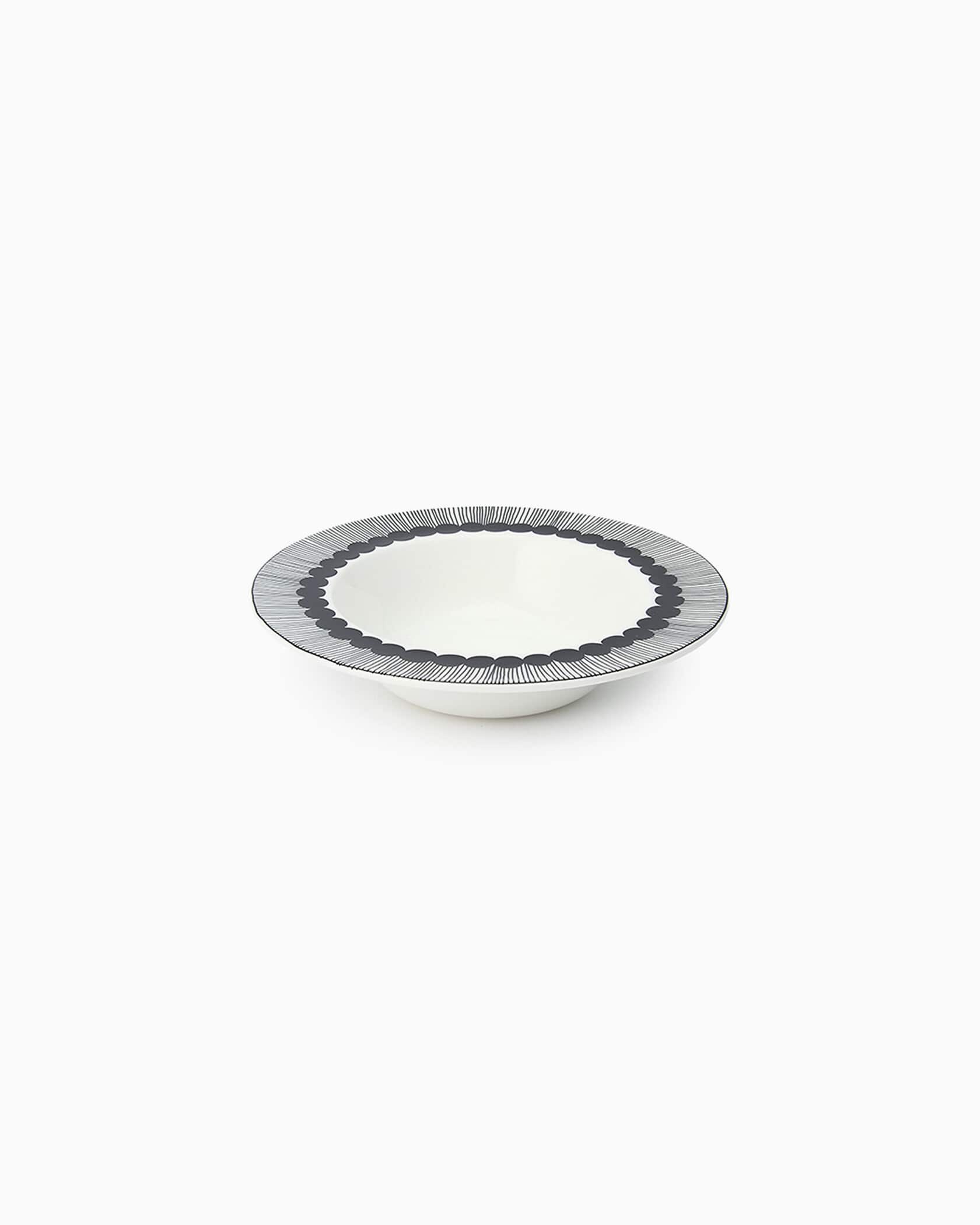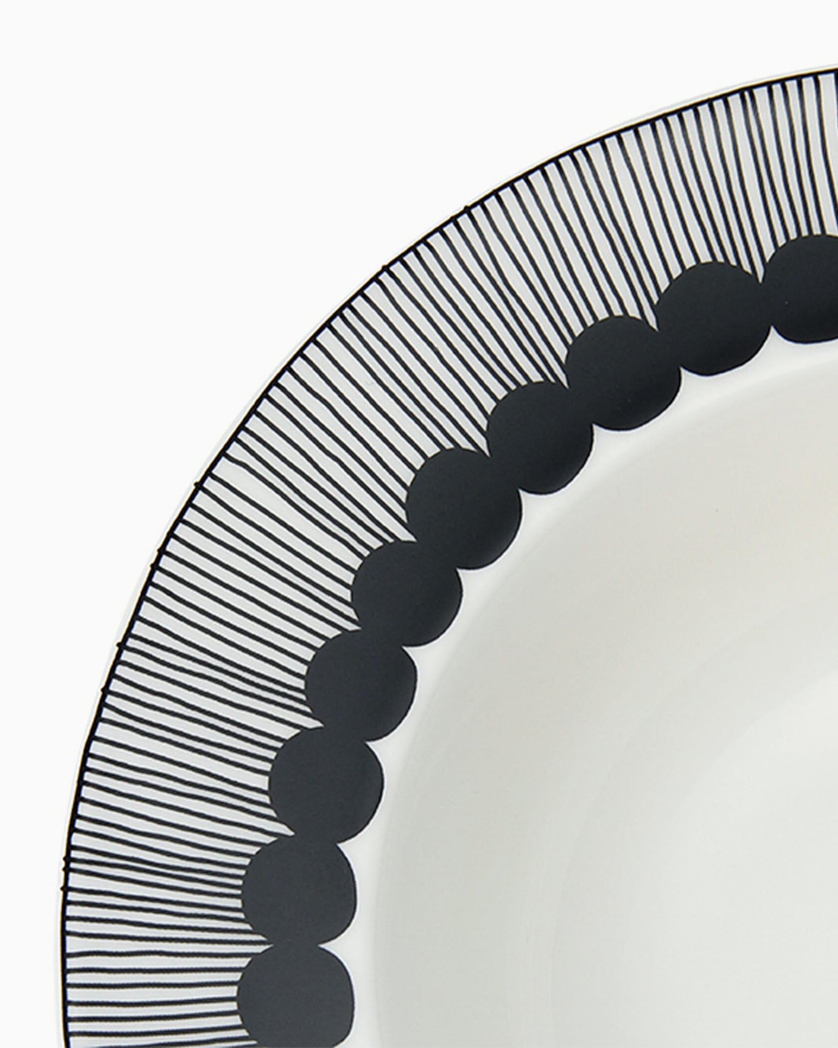 縁まわりに線画やドット模様を加えた、華やかなディーププレート。パスタやサラダなどを入れるのにちょうど良いサイズです。置くだけでテーブルが華やぐので、食事の時間が楽しくなりそうです。底面にはMarimekkoロゴのプリント入りです。