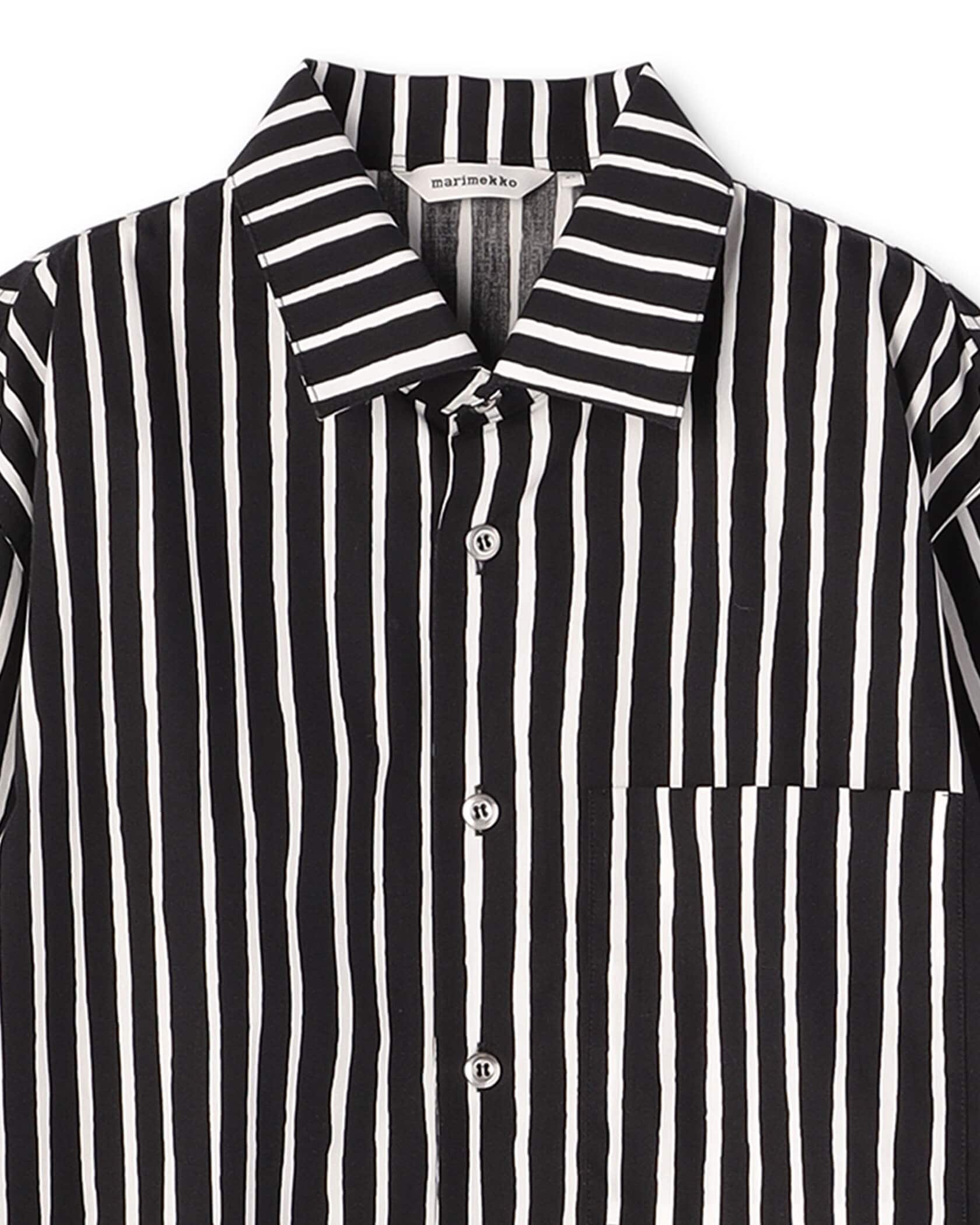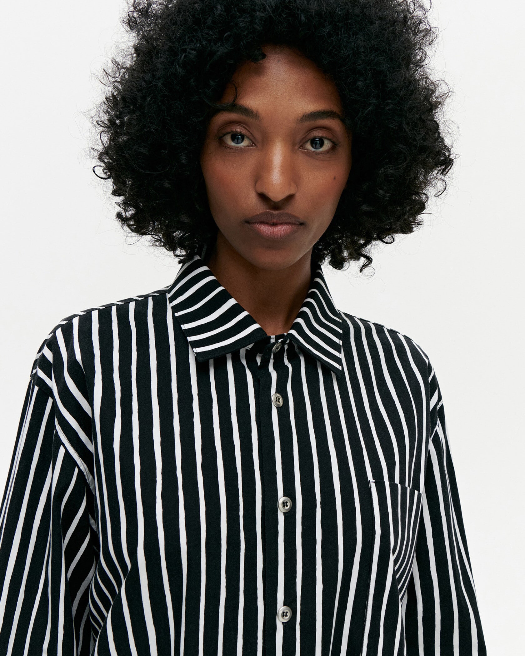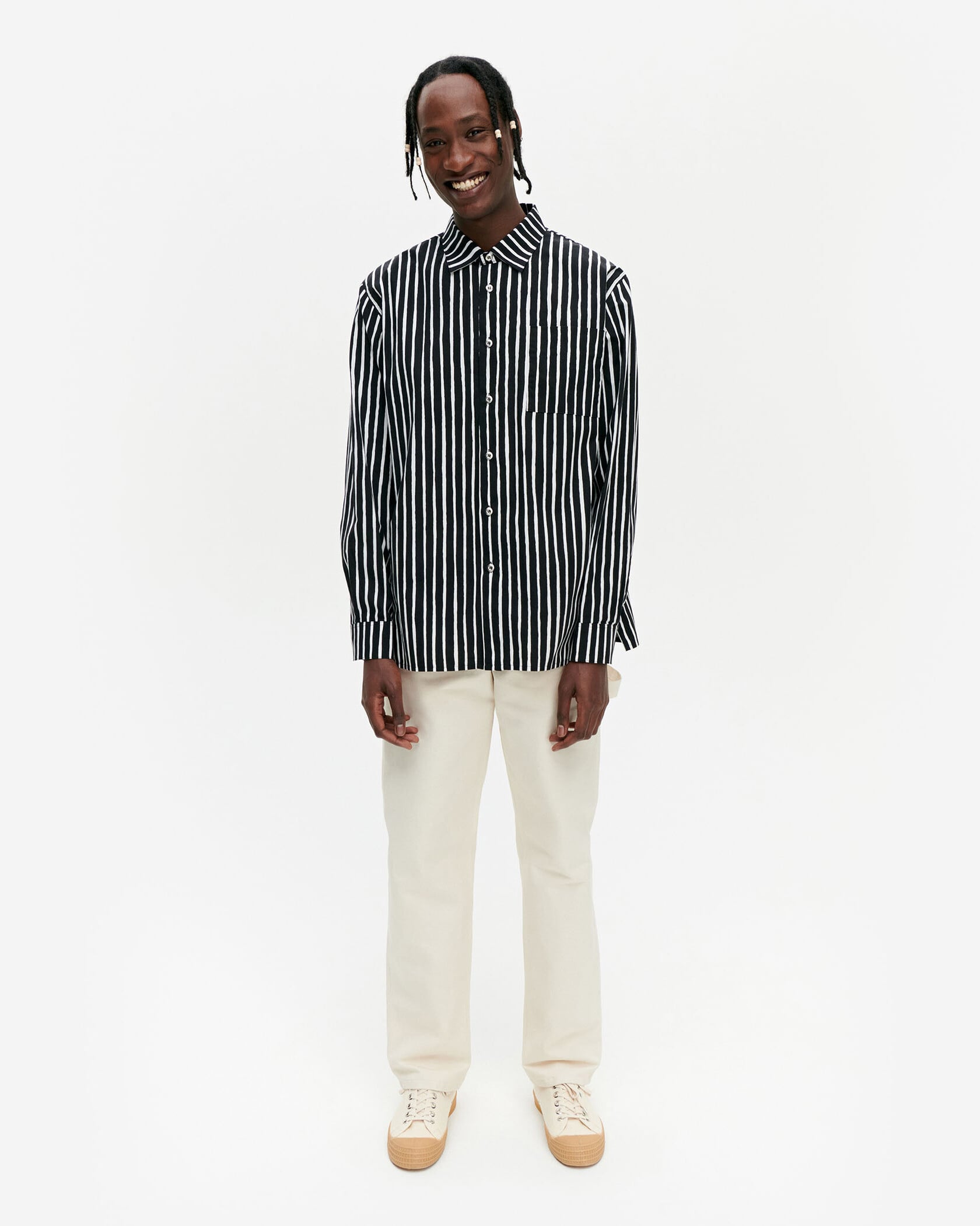 ストライプ柄がスタイリッシュな印象を演出する長袖ボタンユニセックスシャツ。Marimekkoらしい、太さにニュアンスのある有機的なラインがデザインポイント。着こなしやすくトレンドに左右されないストレートシルエット。お手持ちのボトムに合わせてスタイリッシュな着こなしが実現するアイテムです。