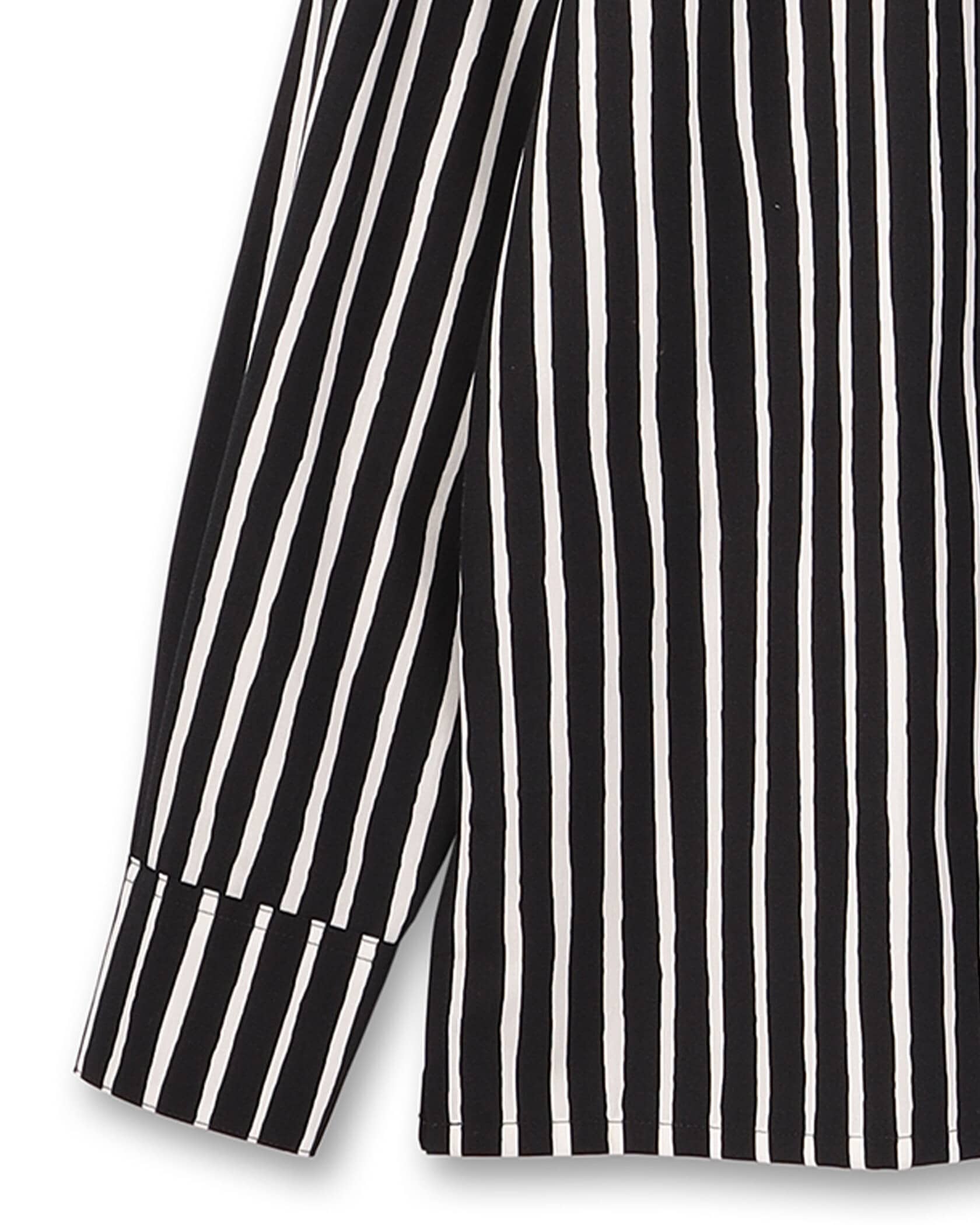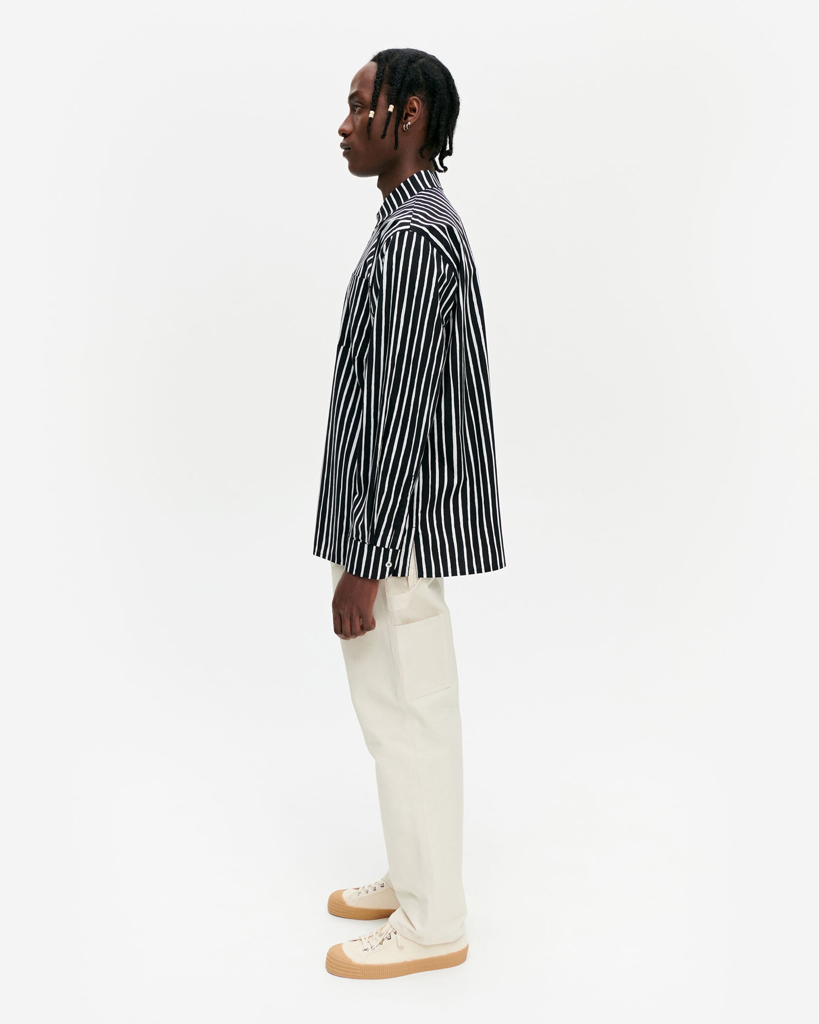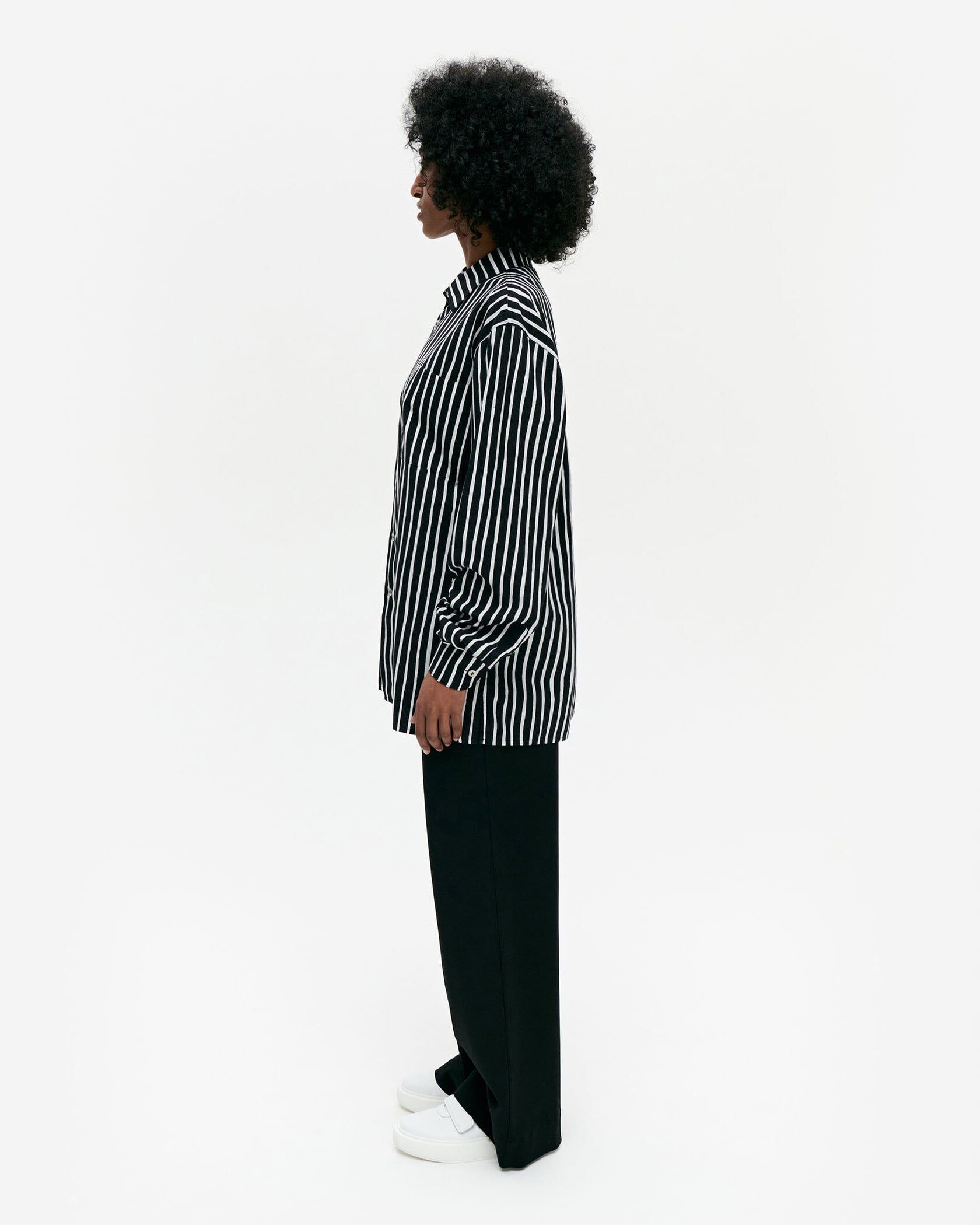 ストライプ柄がスタイリッシュな印象を演出する長袖ボタンユニセックスシャツ。Marimekkoらしい、太さにニュアンスのある有機的なラインがデザインポイント。着こなしやすくトレンドに左右されないストレートシルエット。お手持ちのボトムに合わせてスタイリッシュな着こなしが実現するアイテムです。
