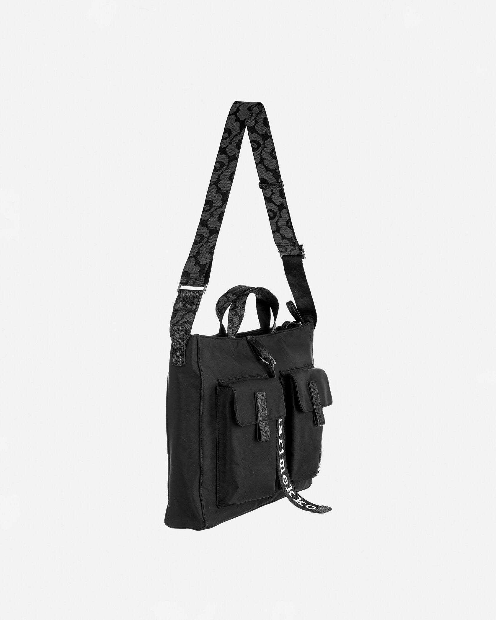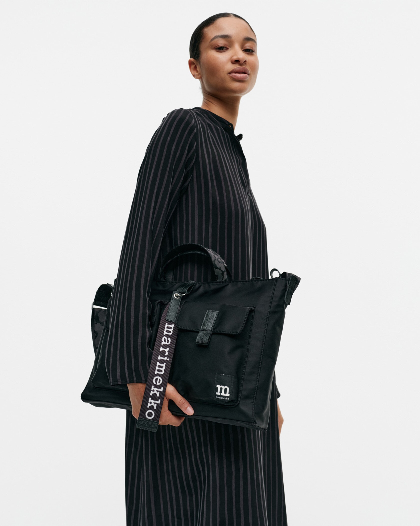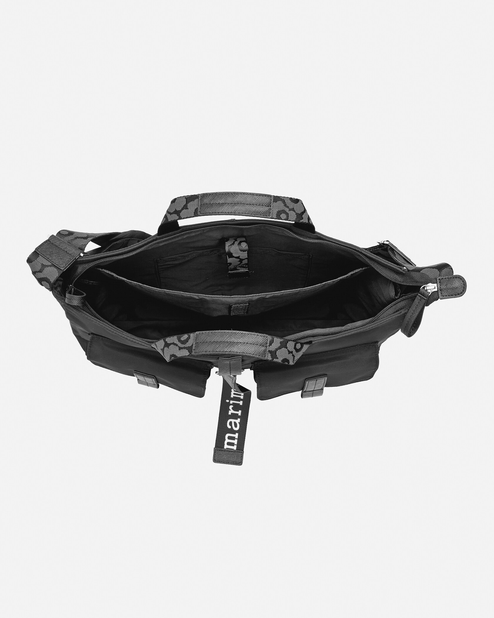 Marimekkoを代表するUnikko柄をショルダーストラップにあしらった華やかなショルダーバッグ。ブランドタグのチャームがスタイリッシュなデザインアクセント。長さ調整可能なショルダーストラップ、大きなフロントポケット付きで機能面も優秀。毎日の通勤通学など様々なシーンで活躍する便利なアイテムです。