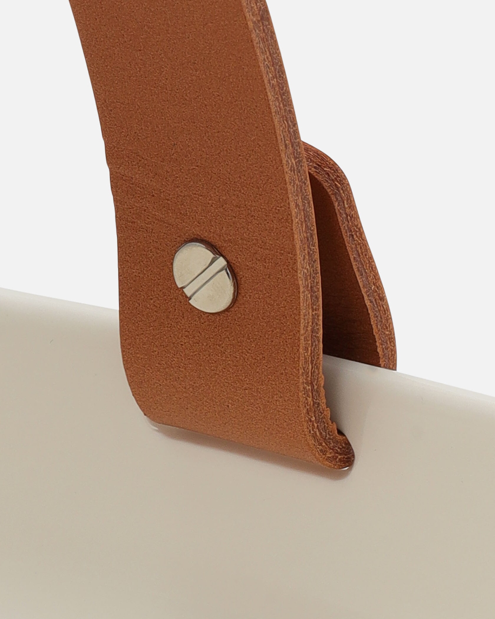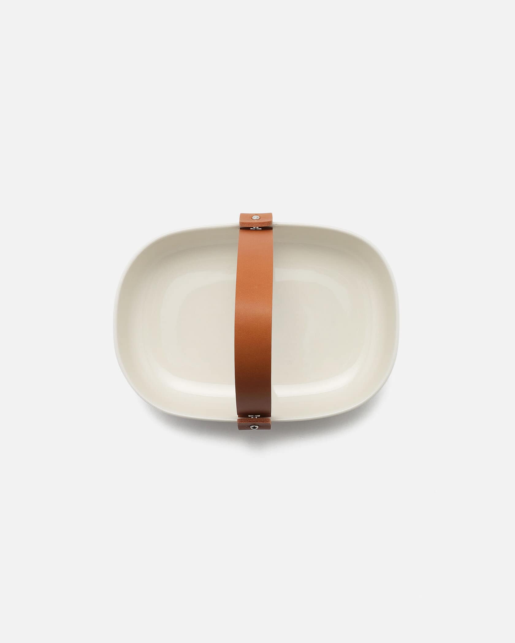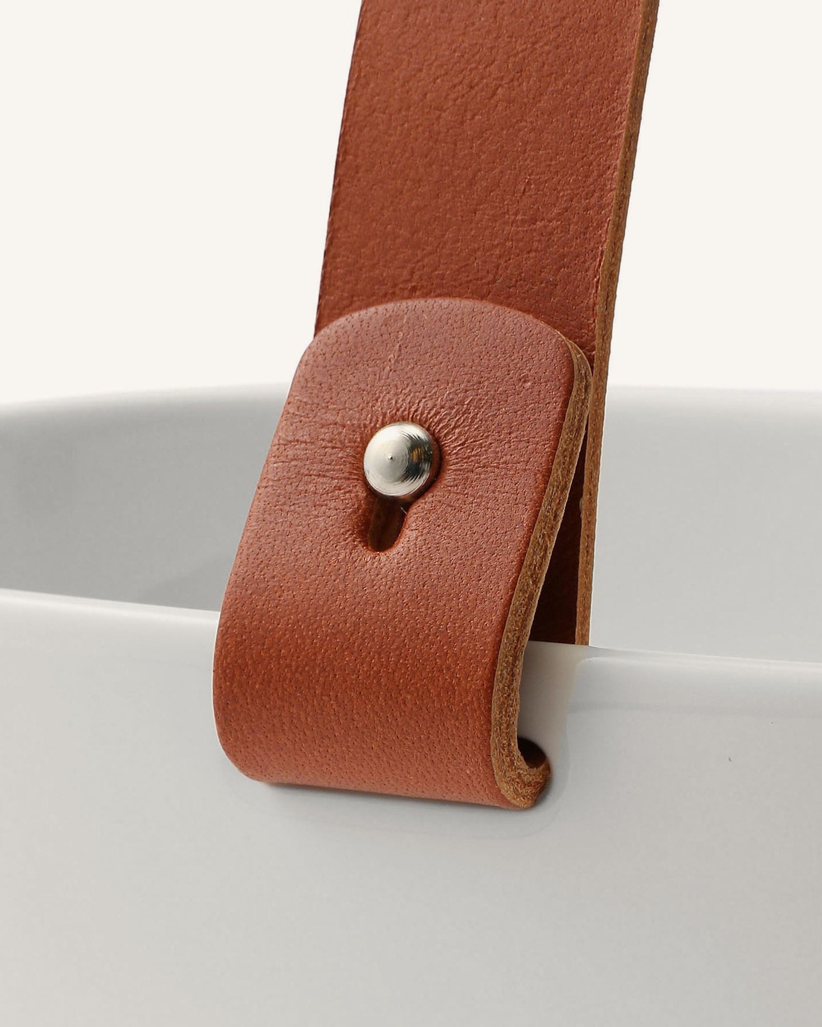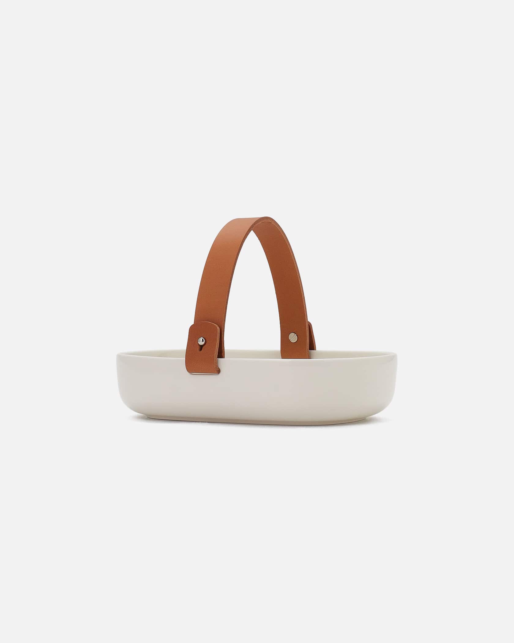 「OIVA」シリーズのセラミックバスケット。深めのフォルムでパンやフルーツを盛り付けるのにぴったり。毎日の食卓はもちろん、友人同士で集まるホームパーティーにもおすすめです。レザーハンドル付き。