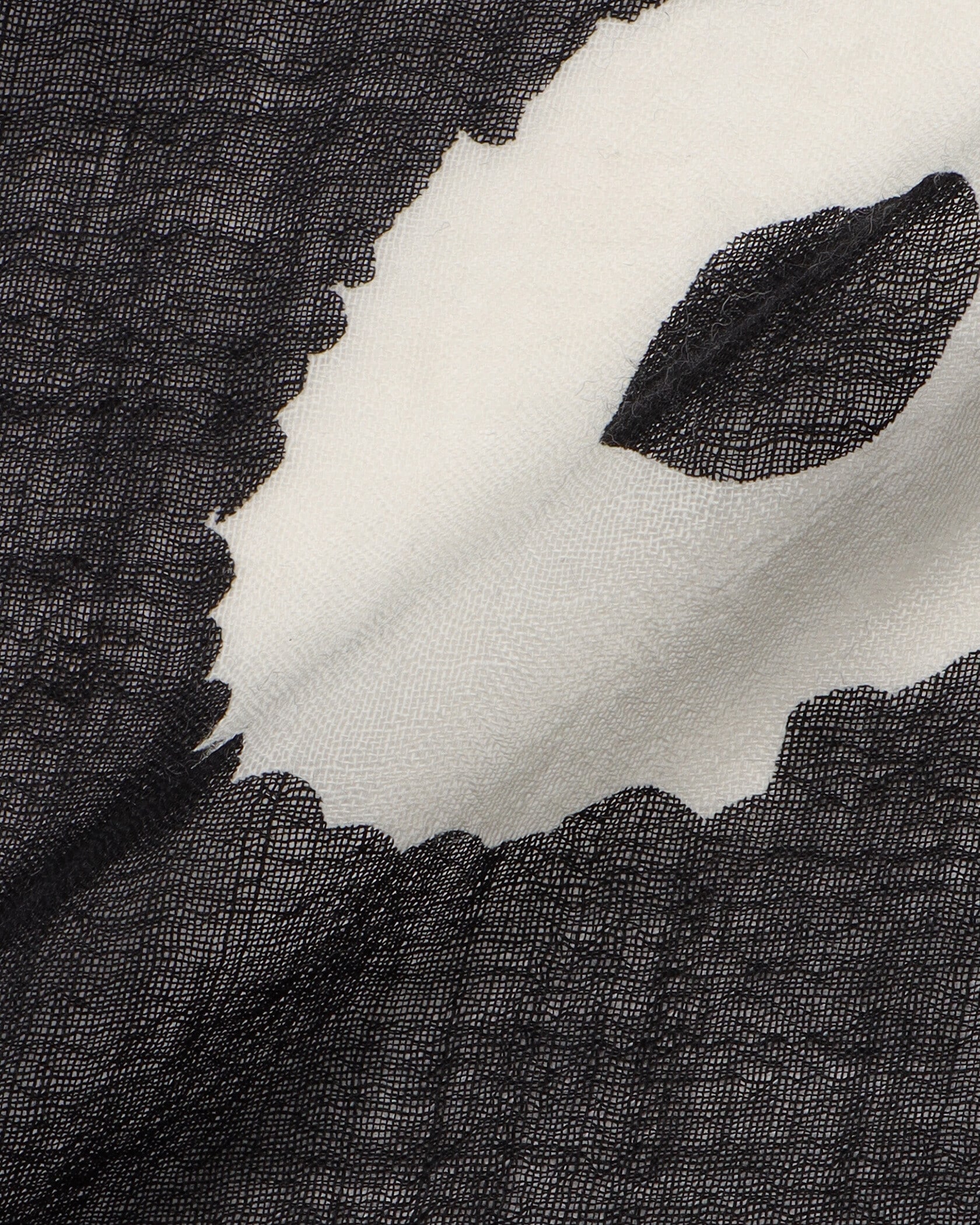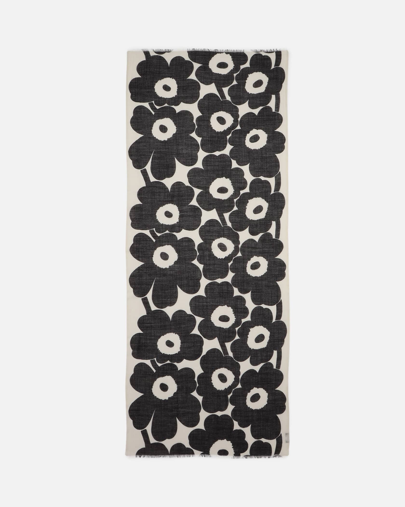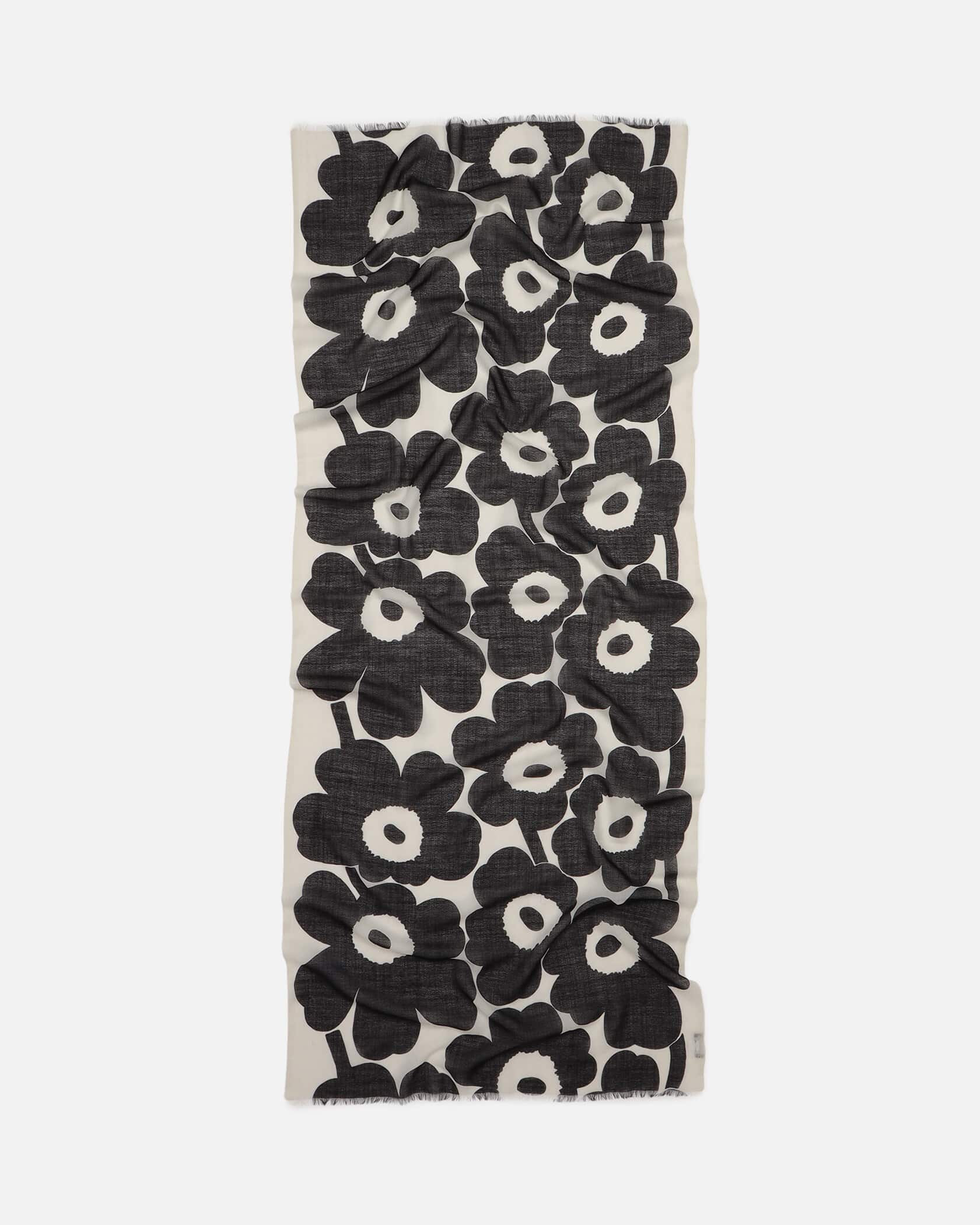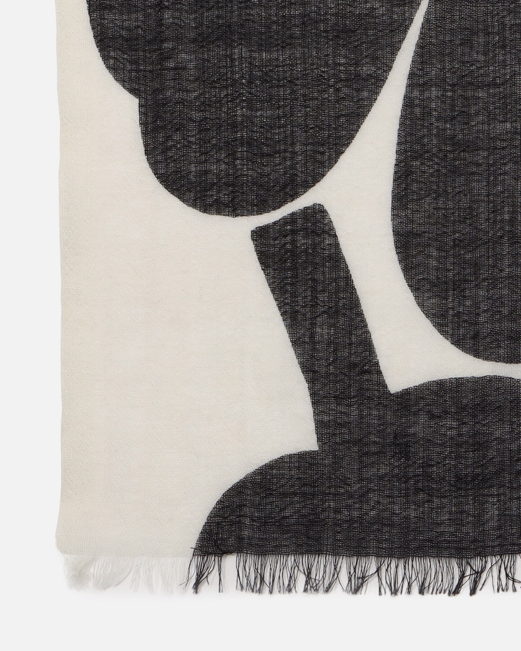 軽やかな着け心地が魅力のシアーなウールストール。花をモチーフにしたUnikko柄がスタイリングのワンポイントに際立ち、顔まわりを華やかに仕上げます。端にはショートフリンジがほどこされ、薄手の素材はアレンジしやすいのもポイントです。