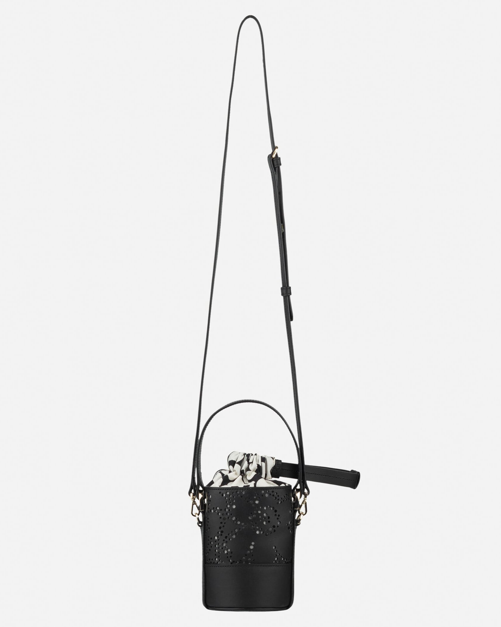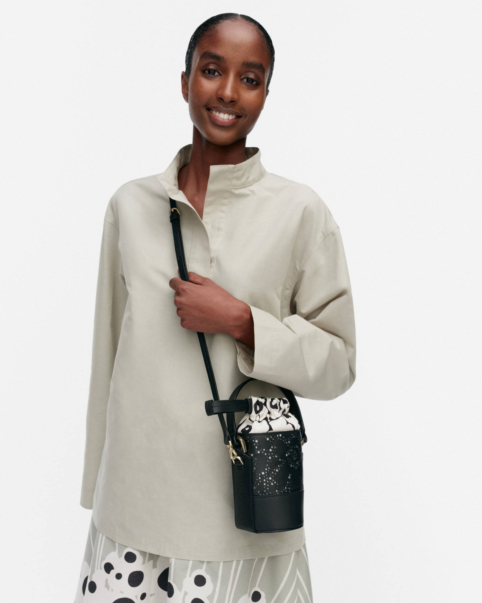アクセサリー感覚で取り入れたい、ナノサイズの愛らしいバケットバッグ。「Unikko」の柄をパンチングで表現した、クラフト感のある一品です。手持ちのできる短いハンドルと、取外し可能なショルダーストラップの付いた2WAY仕様となっています。開口部はドローストリングで中身の目隠しができるのもポイント。生地は同じく「Unikko」で、統一感をもたせています。