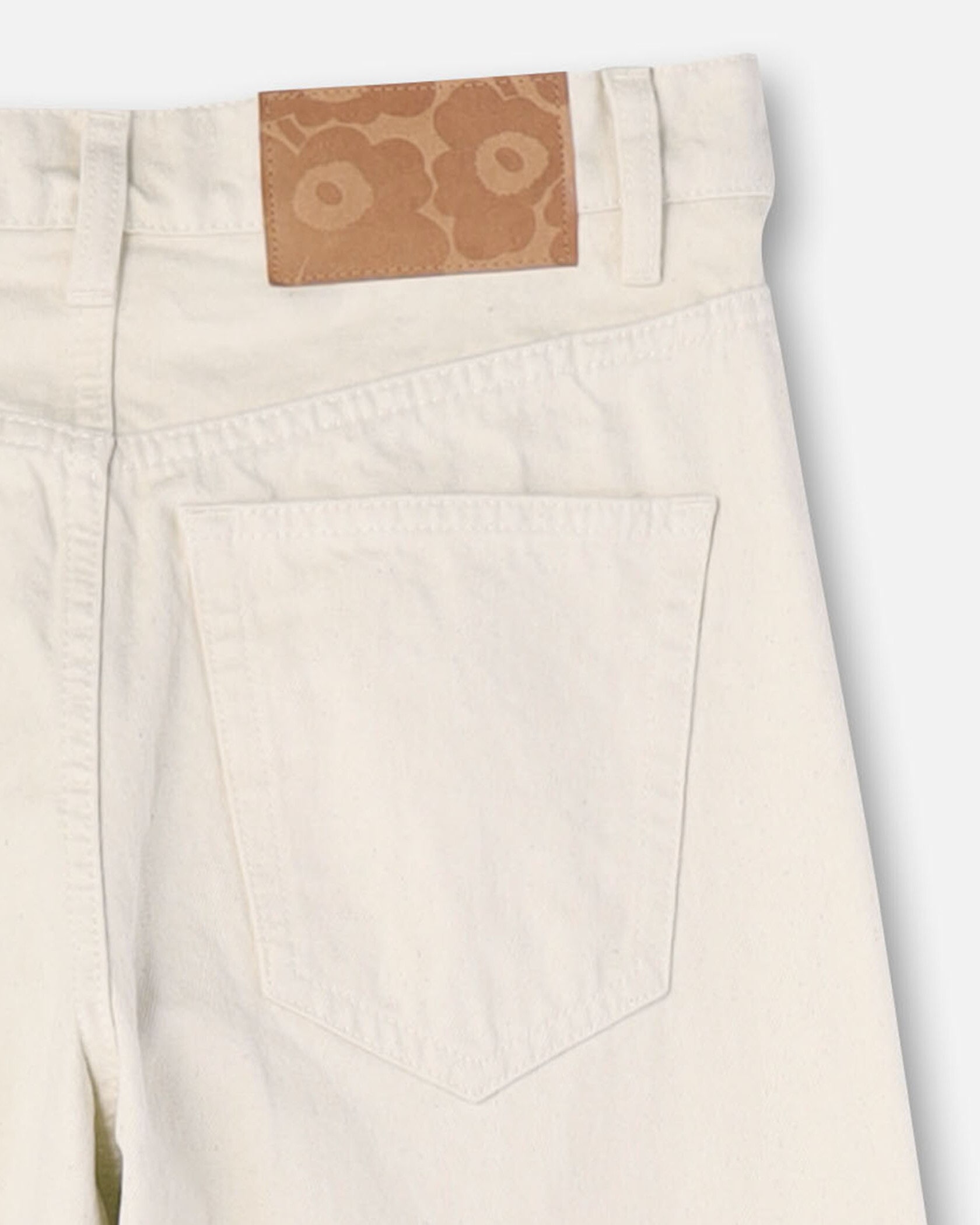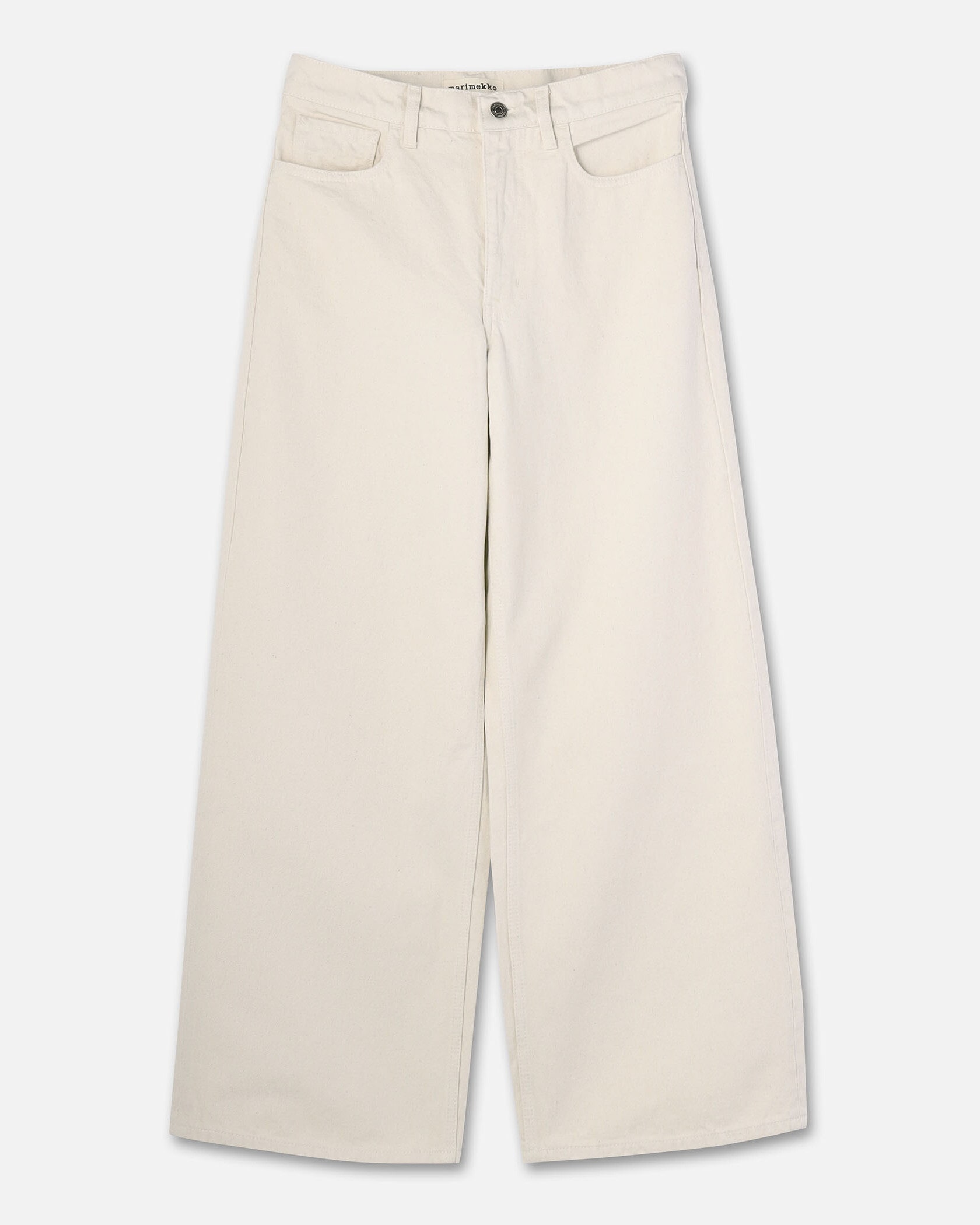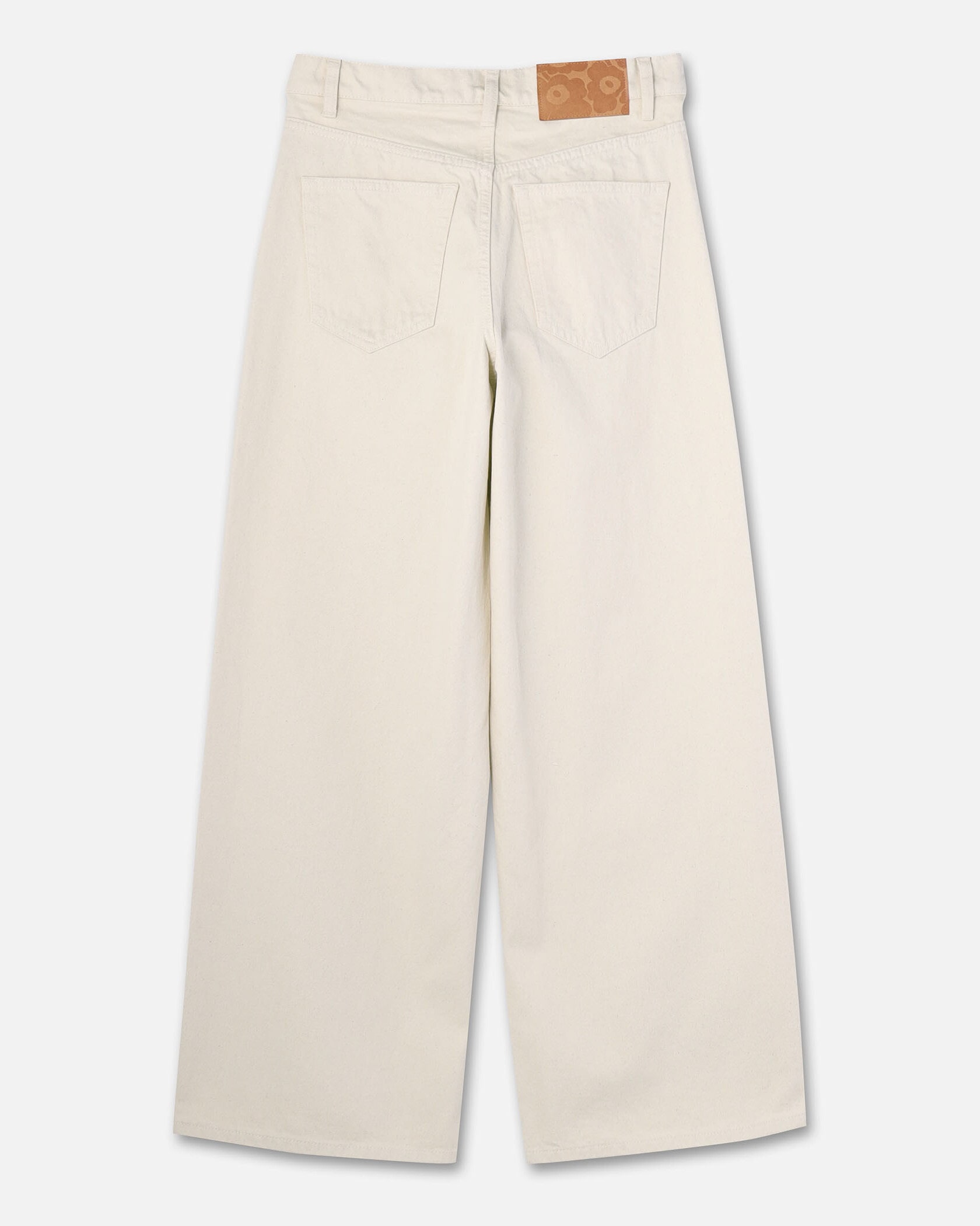 ワイド幅のシルエットが特徴の5ポケットコットンデニム。バックスタイルにスタイリッシュなアクセントのMarimekkoを代表するUnikko柄のラベル付き。たっぷりとゆとりのあるフォルムがモダンなムード。様々なスタイルのトップスにマッチするシンプルなデザインで、デイリーに活躍するアイテムです。