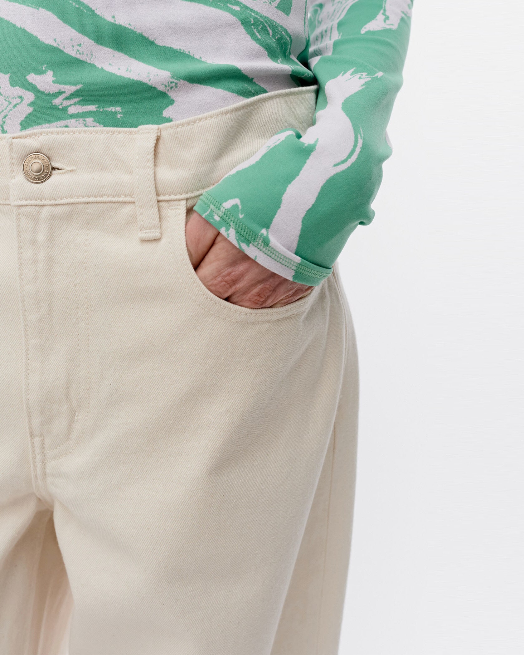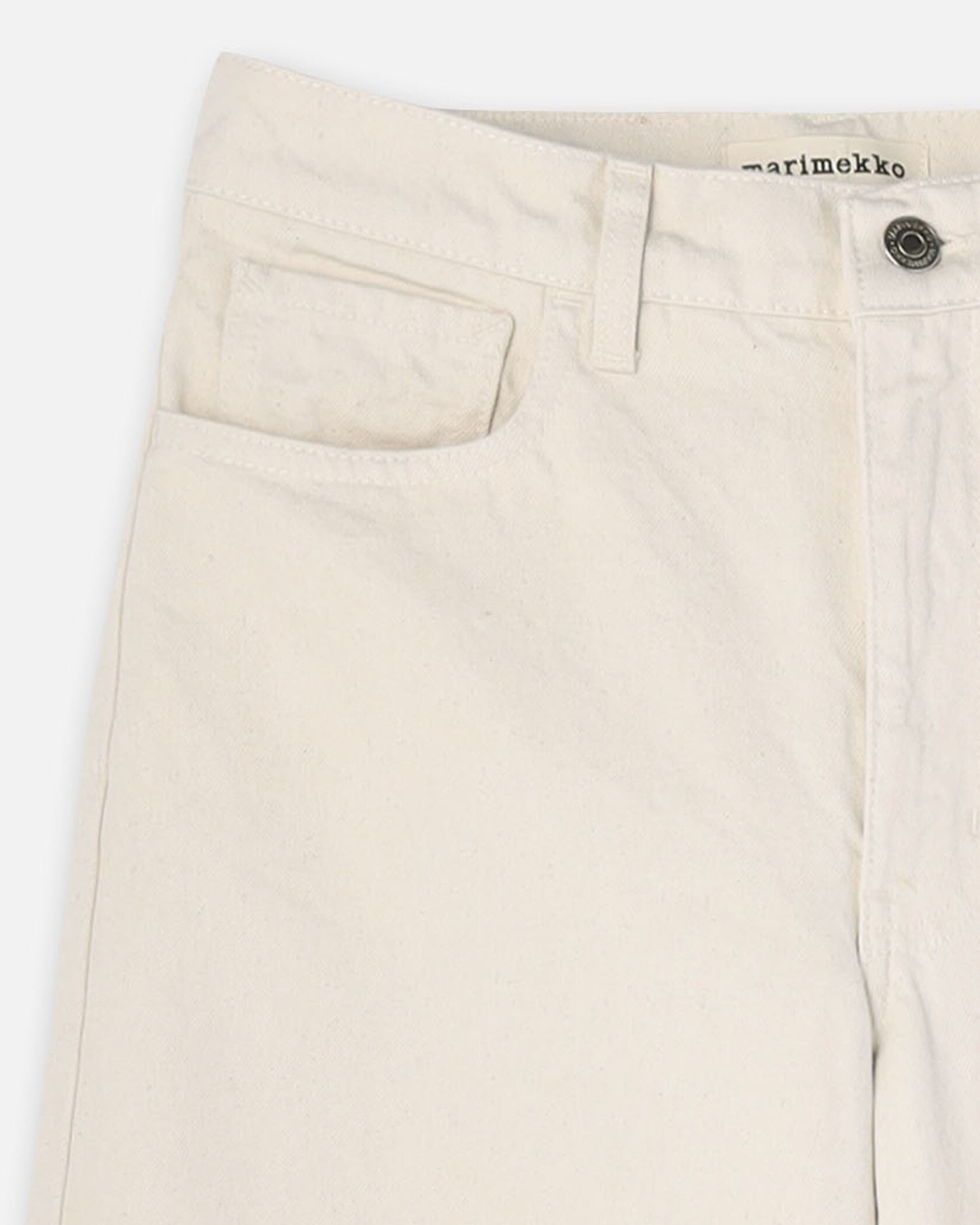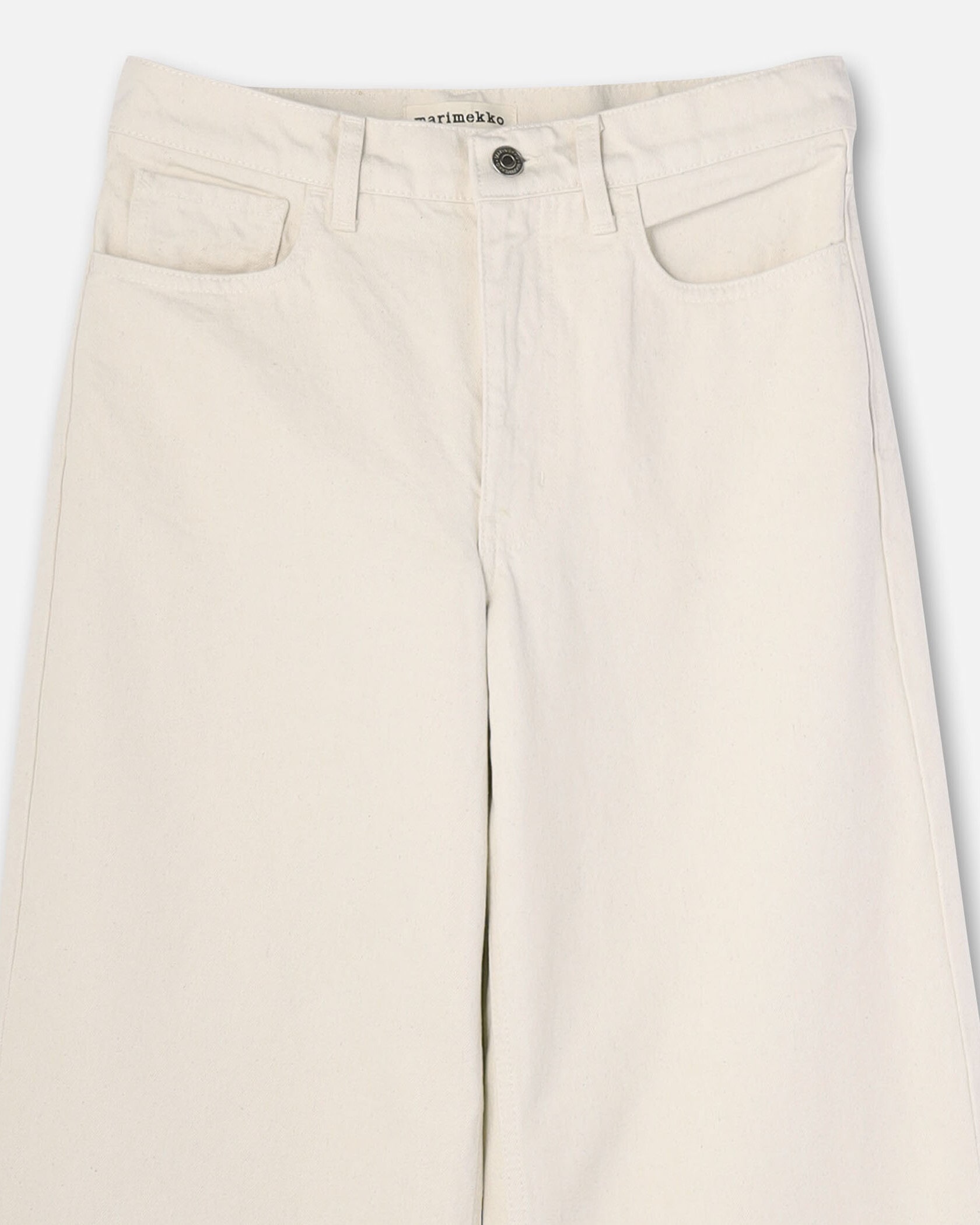 ワイド幅のシルエットが特徴の5ポケットコットンデニム。バックスタイルにスタイリッシュなアクセントのMarimekkoを代表するUnikko柄のラベル付き。たっぷりとゆとりのあるフォルムがモダンなムード。様々なスタイルのトップスにマッチするシンプルなデザインで、デイリーに活躍するアイテムです。