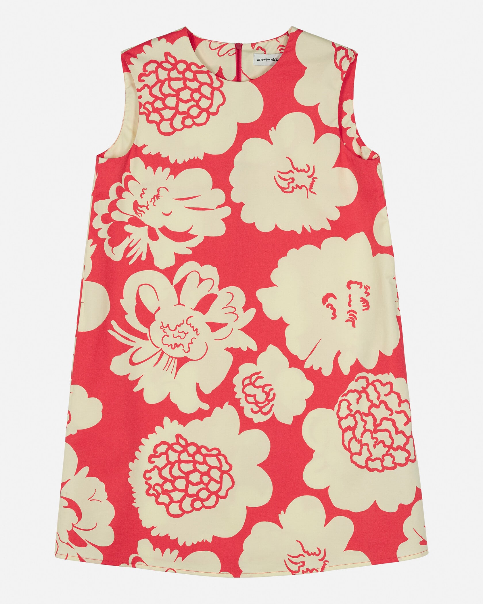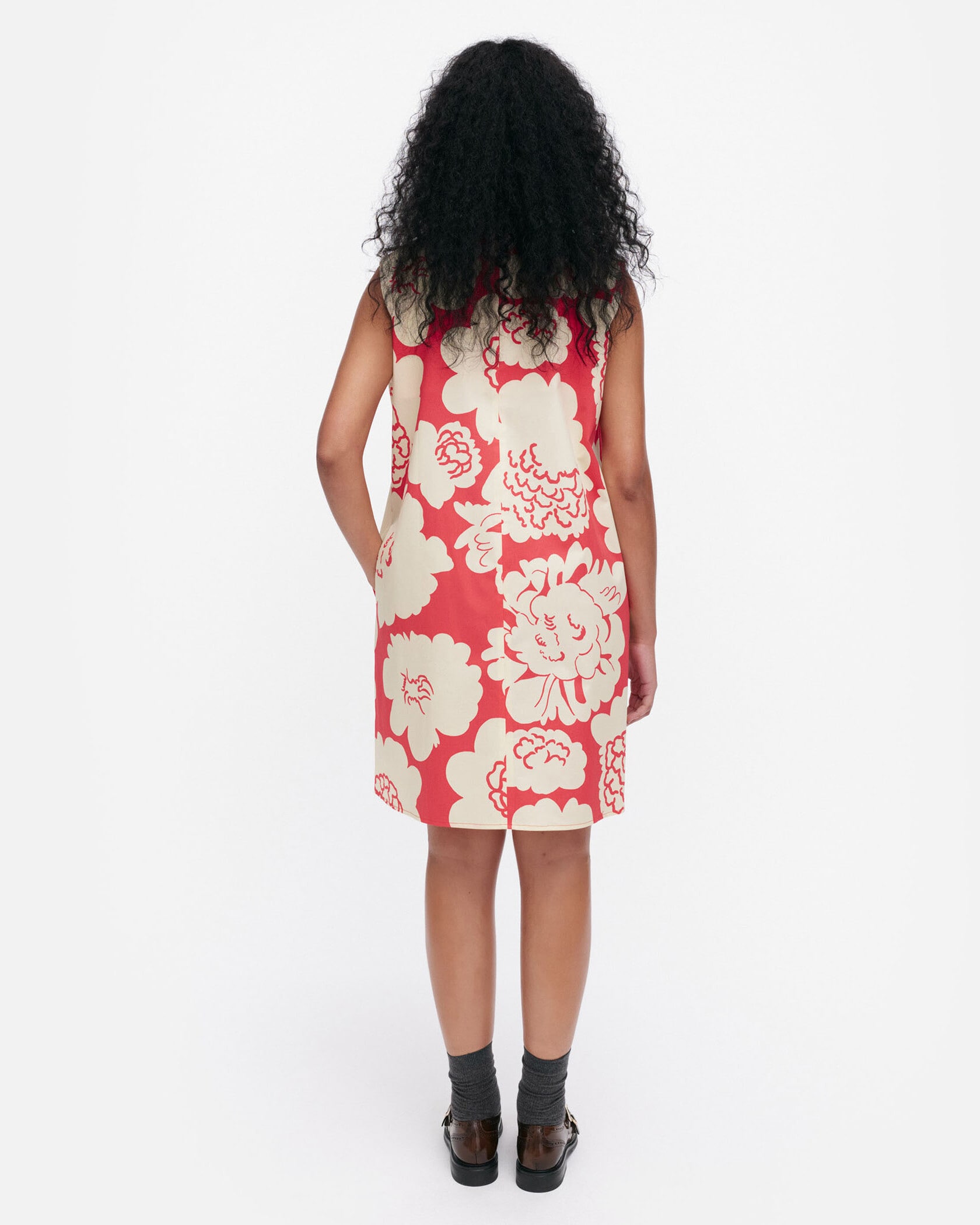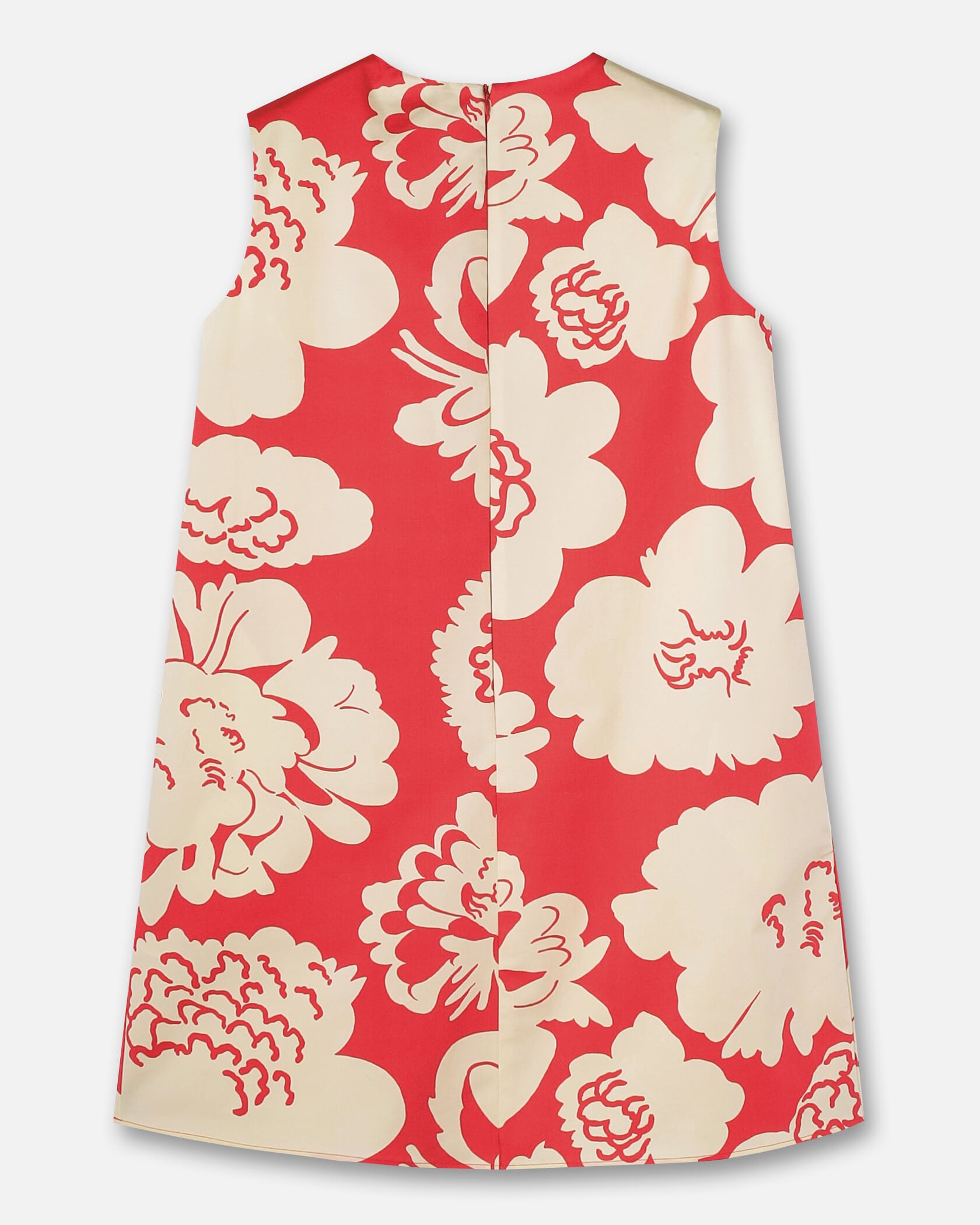 肩まわりはすっきりと、身頃はふんわりと膨らむようなシルエットに仕上げたワンピース。コットンにポリウレタンを織り交ぜ、伸縮性を持たせた素材を使用しています。大輪のピオニーが咲き誇るファブリックは、華やかさも満点。上からカーディガンやジャケットなどを羽織るスタイルにも活躍します。